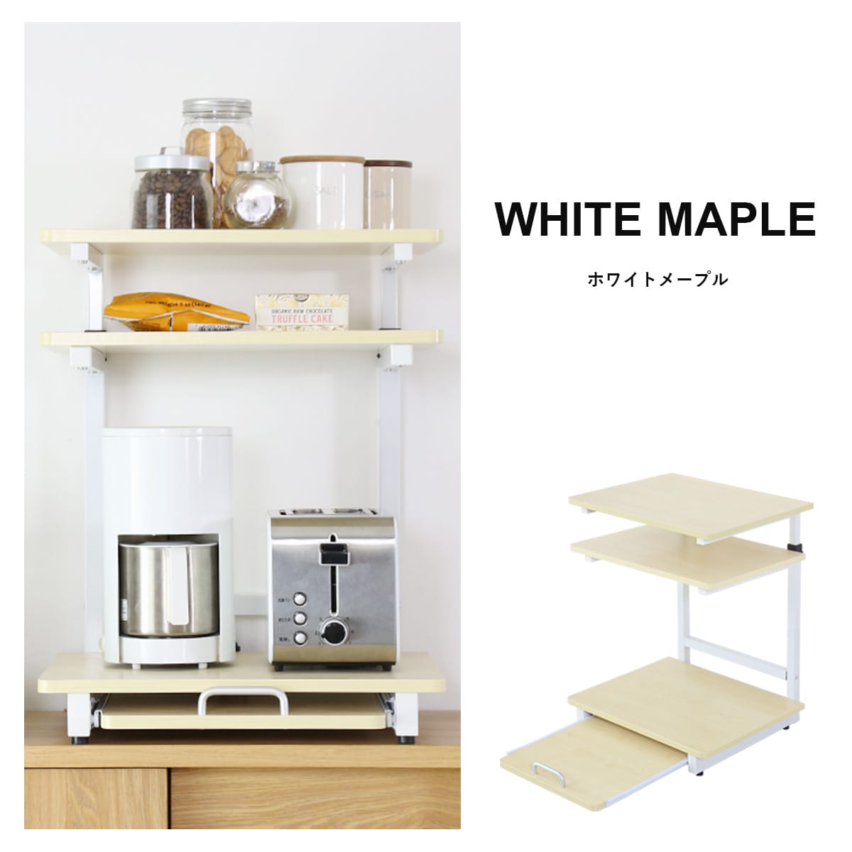 冷蔵庫上以外にも、キッチンカウンターや食器棚の上に設置するのもおすすめです。お気に入りの家電を置いたり、便利なコーヒースペースをつくったり、お客様のニーズに合わせて用途の幅も広がる万能ラックです。
