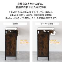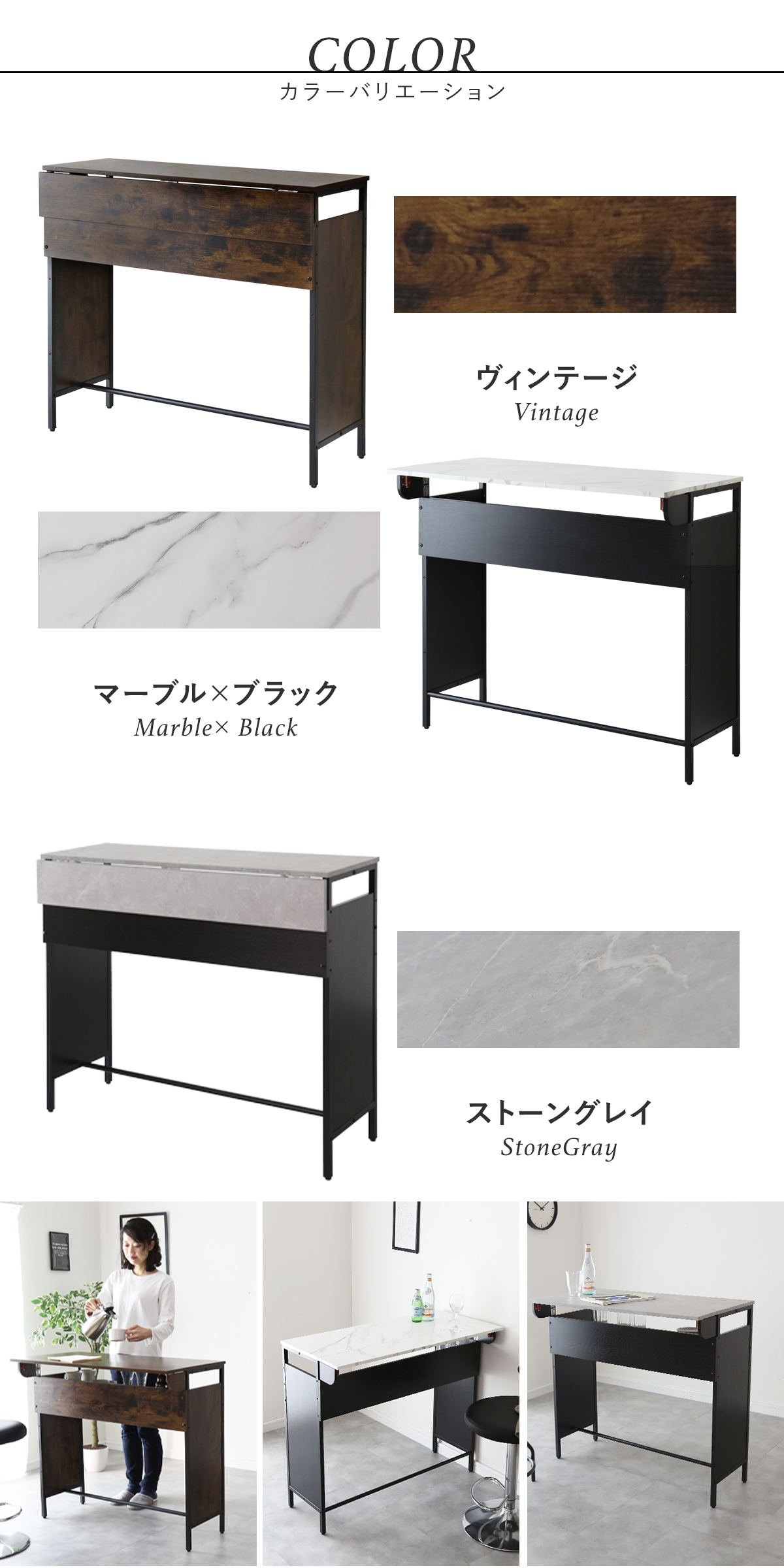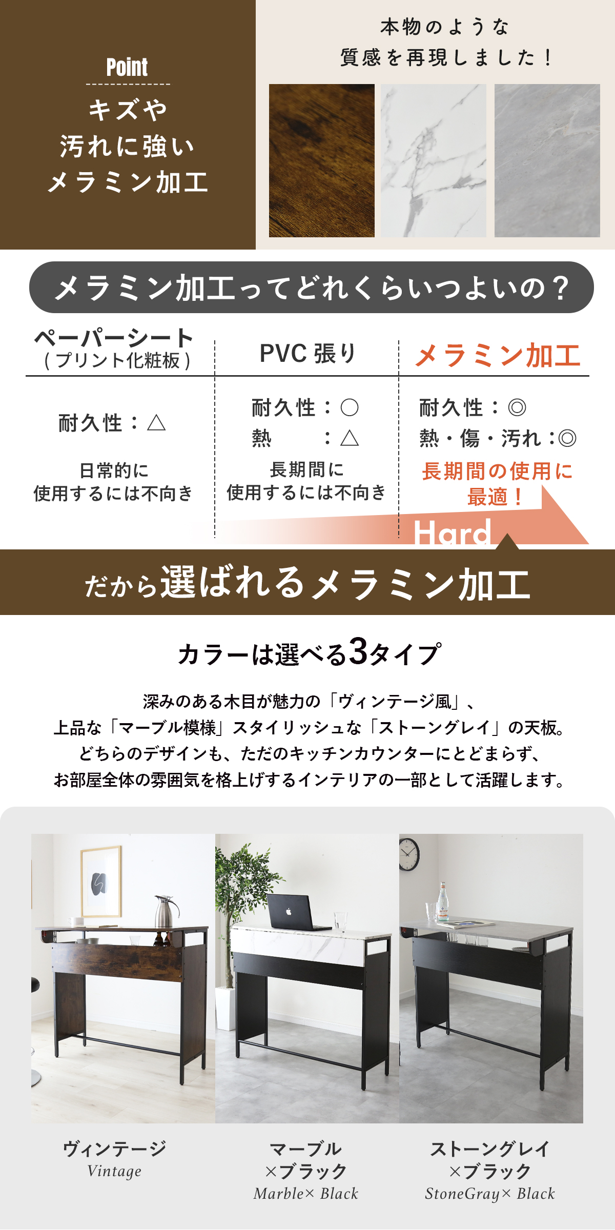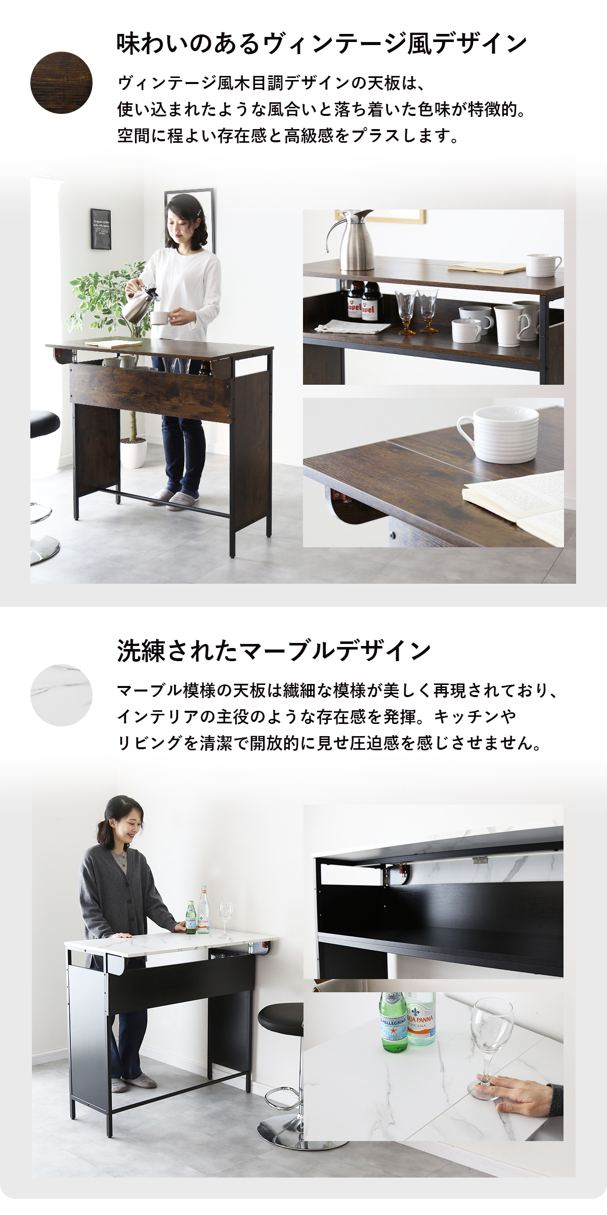 天板下の裏側に収納スペースを備え、調味料やカトラリーをすっきり収納。表から見えにくく生活感を抑えます。ヴィンテージ調木目は深みのある落ち着いた印象に、白を基調としたマーブル柄天板は空間を明るく洗練された雰囲気に演出。キッチンやリビングを広く清潔に見せます。