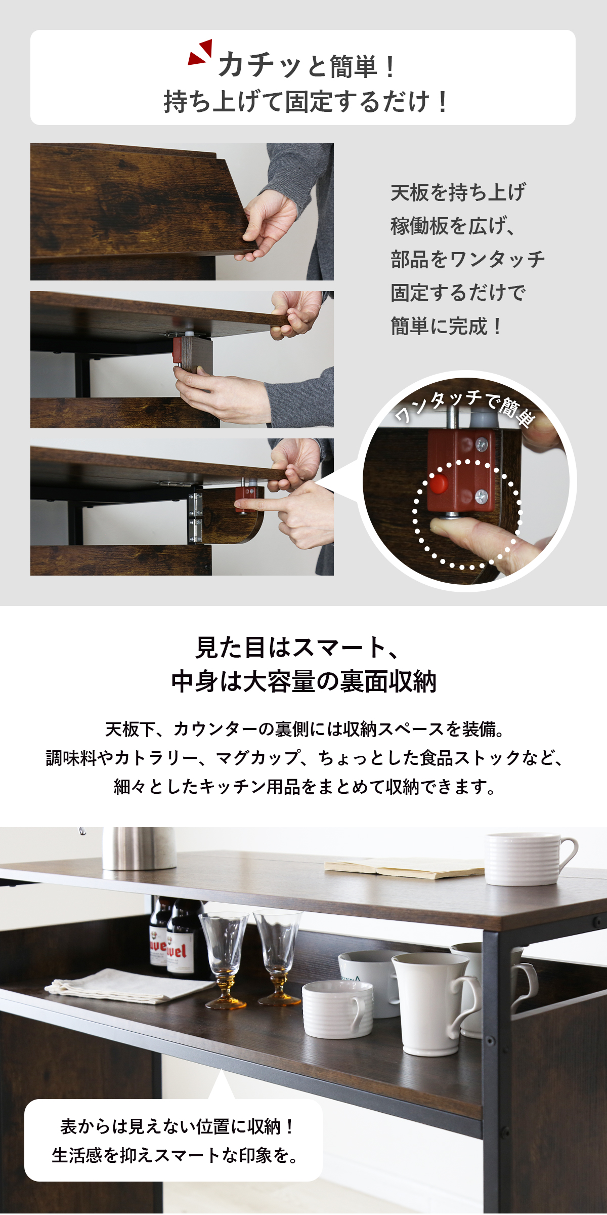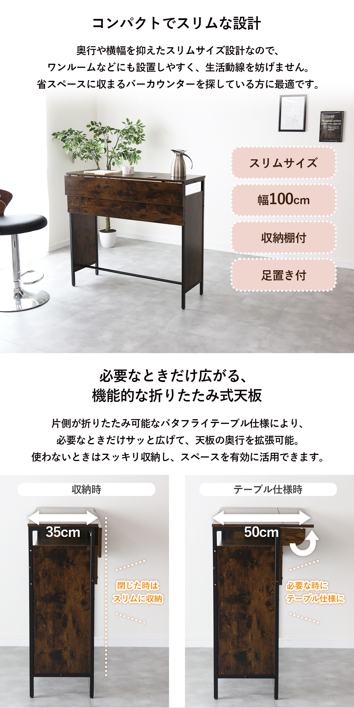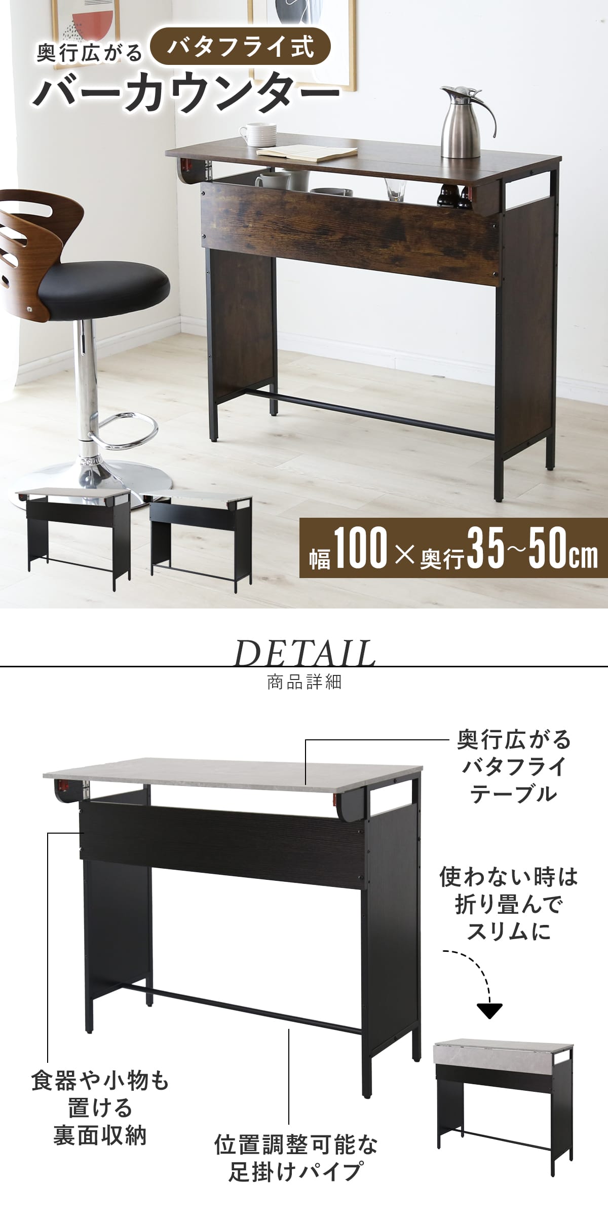 限られたスペースにも設置しやすいスリム設計のバーカウンター。天板を広げられるバタフライ構造で、普段はコンパクト、来客時や作業時にはゆったり使えます。天板下の収納棚で小物も整理しやすく、足置きパイプ付きで快適。水や汚れに強いメラミン天板を採用し、お手入れ簡単。キッチン、デスク、バーカウンターとして幅広く活躍します。