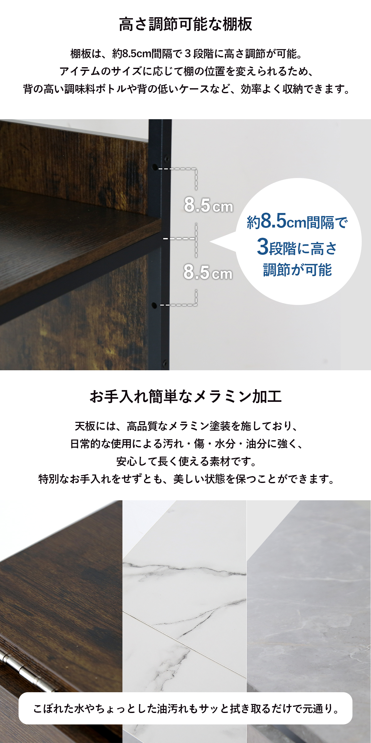 天板には水・油・汚れに強いメラミン加工を施しています。こぼしてもサッと拭くだけでお手入れ簡単。キッチン周りでも安心して使え、きれいな状態を長く保てます。