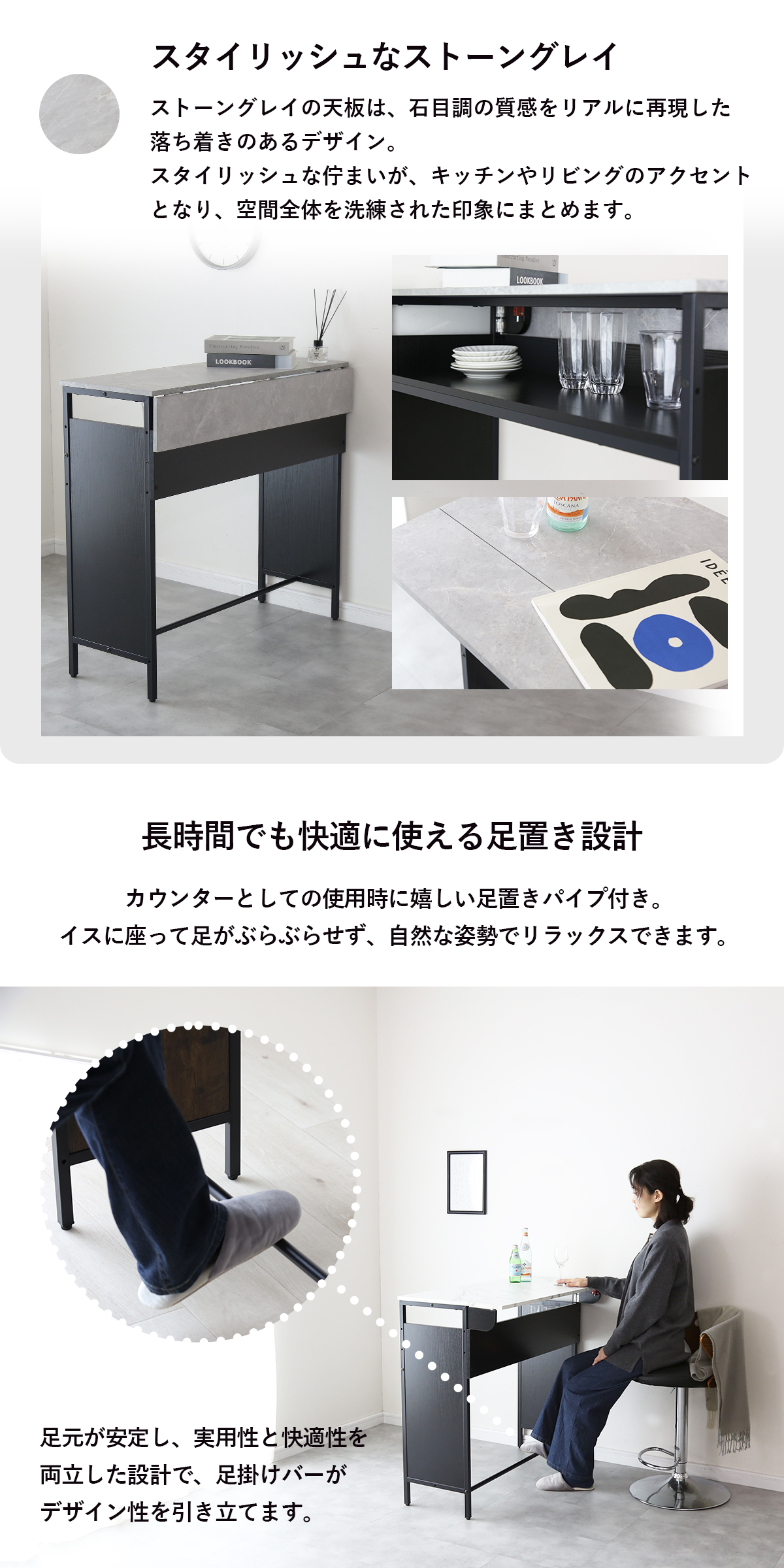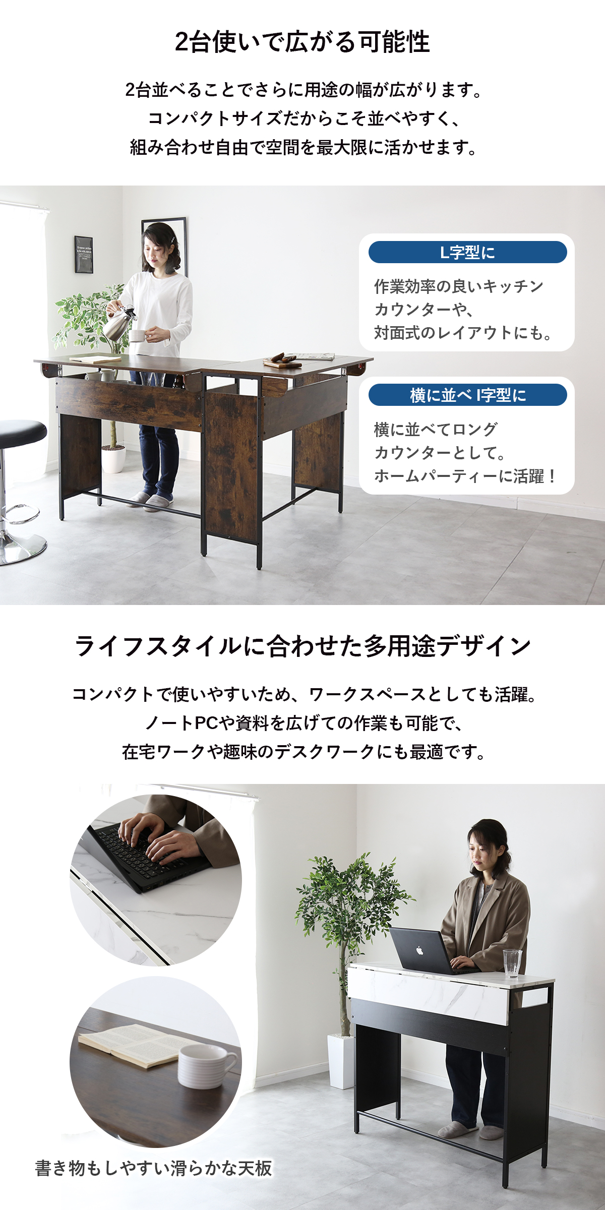 2台使いでロングカウンターやL字配置が可能になり、食事や作業スペースを用途に合わせて拡張できます。省スペース設計で並べやすく、キッチンカウンターや在宅ワーク用デスクとしても活躍。天板は折りたたみ式で、使わないときはすっきり収納でき、昼夜で使い分けられる柔軟なデザインです。
