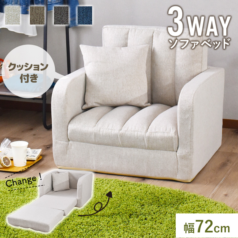 セットで専用クッションが付属。腰当てや枕として使えば、さらに快適なリラックスタイムを過ごせます。ファブリック生地でオールシーズン活躍する一人掛けのソファベッドです。