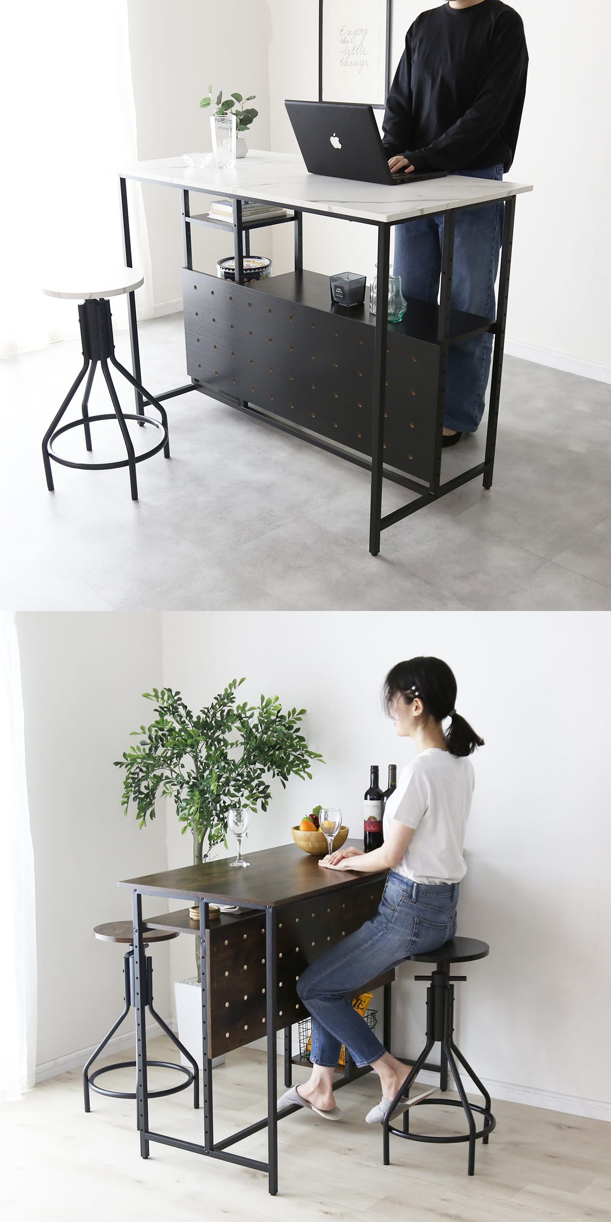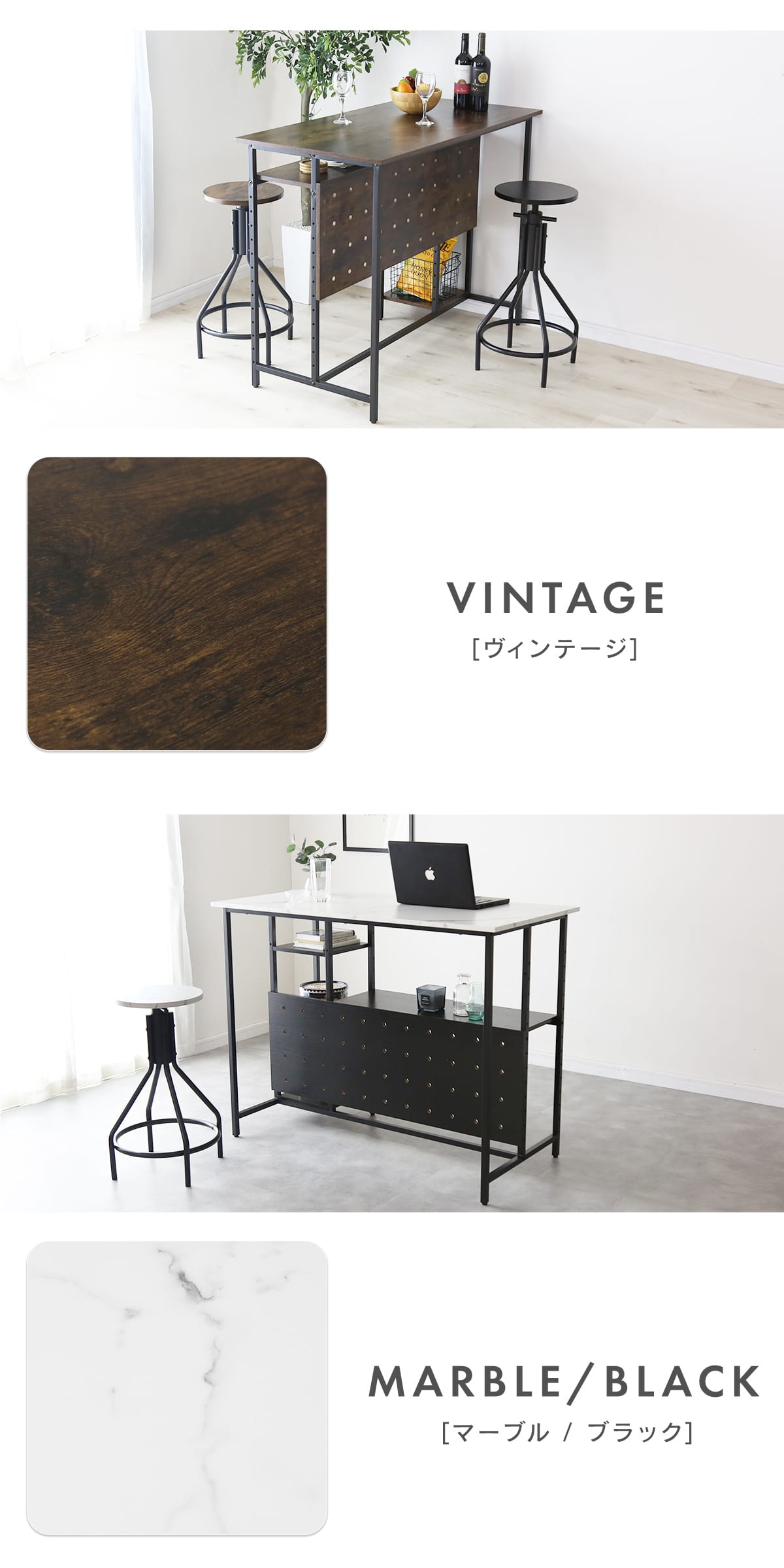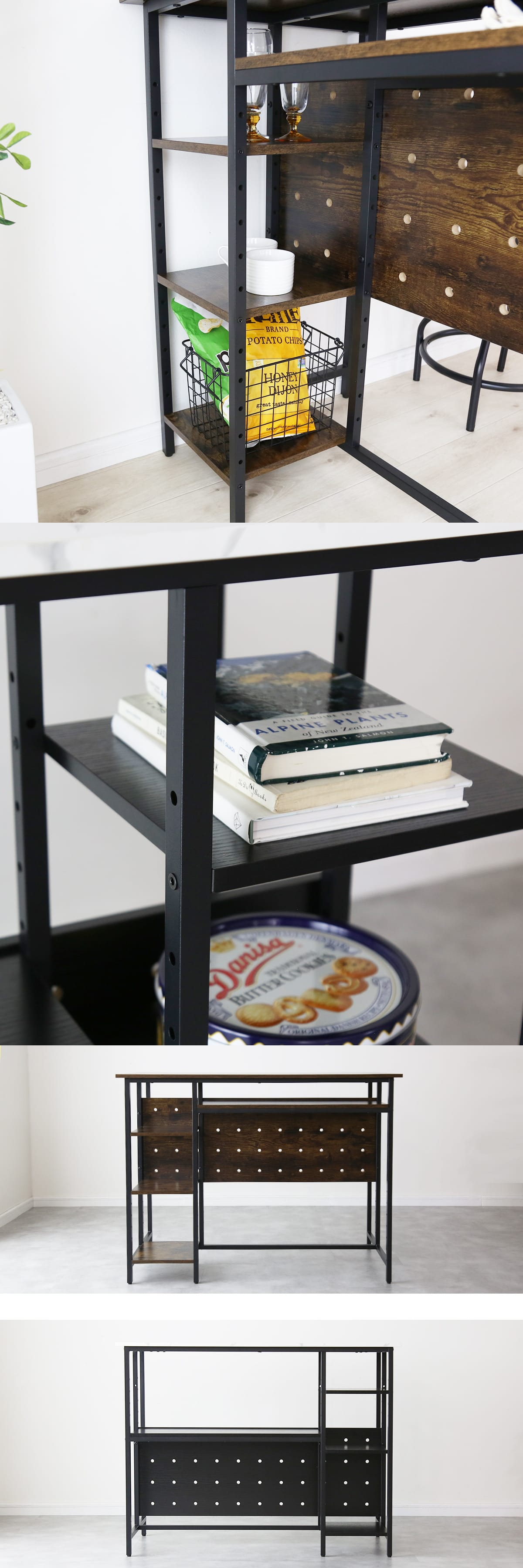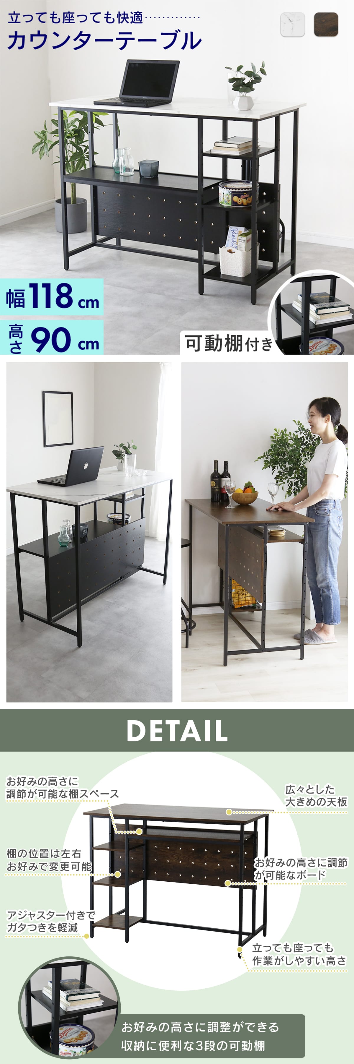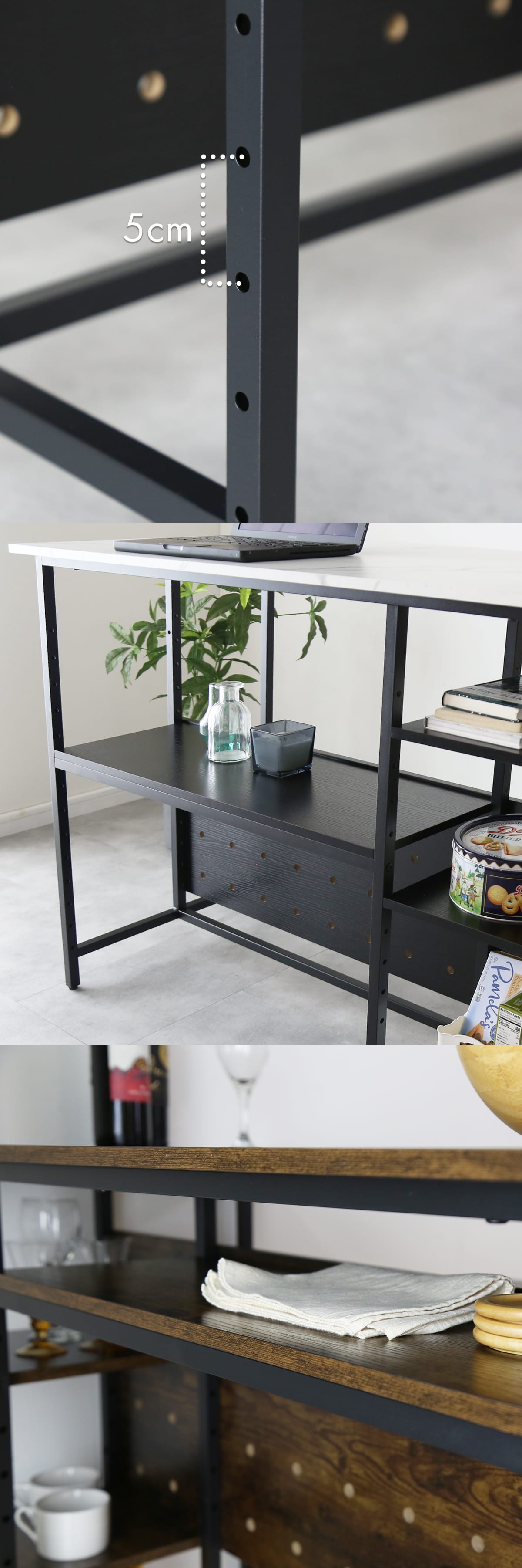本商品の魅力のひとつが、ボードをお好みの高さに設置できる点です。シンプルな構造ながらも、ナチュラルで落ち着いた雰囲気を演出できるため、リビングや私室に置いても違和感がありません。デザインは、シンプルで落ち着きのあるブラックとナチュラルな木目調、モダンな雰囲気を演出するブラックと大理石調の2種類をご用意。どんなインテリアにも馴染みやすく、インテリアショップで見かけるようなスタイリッシュな印象をお部屋にもたらします。