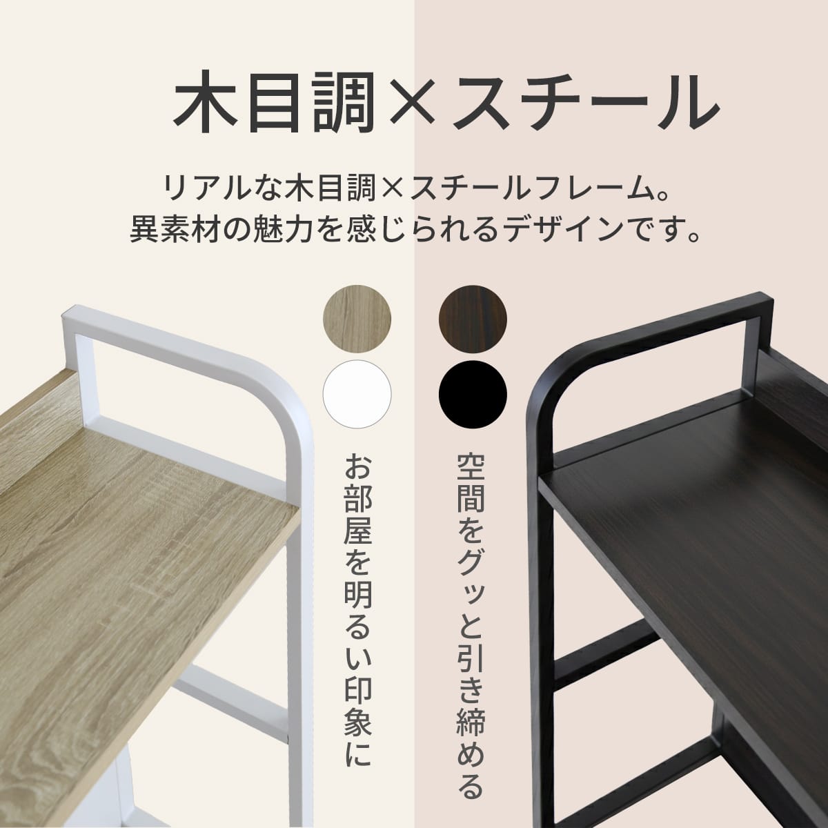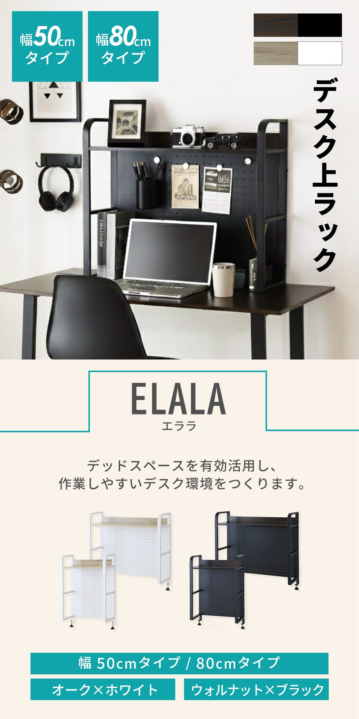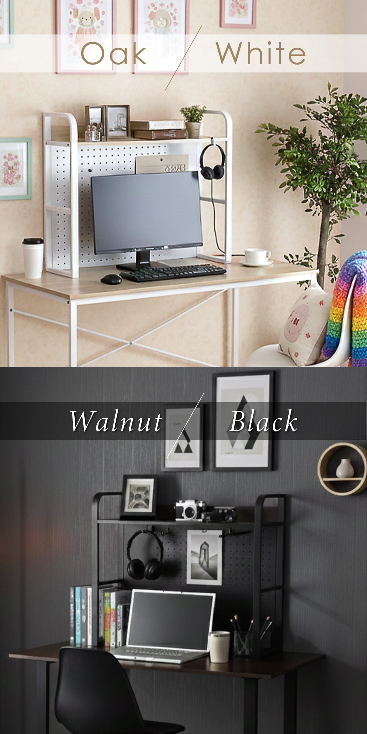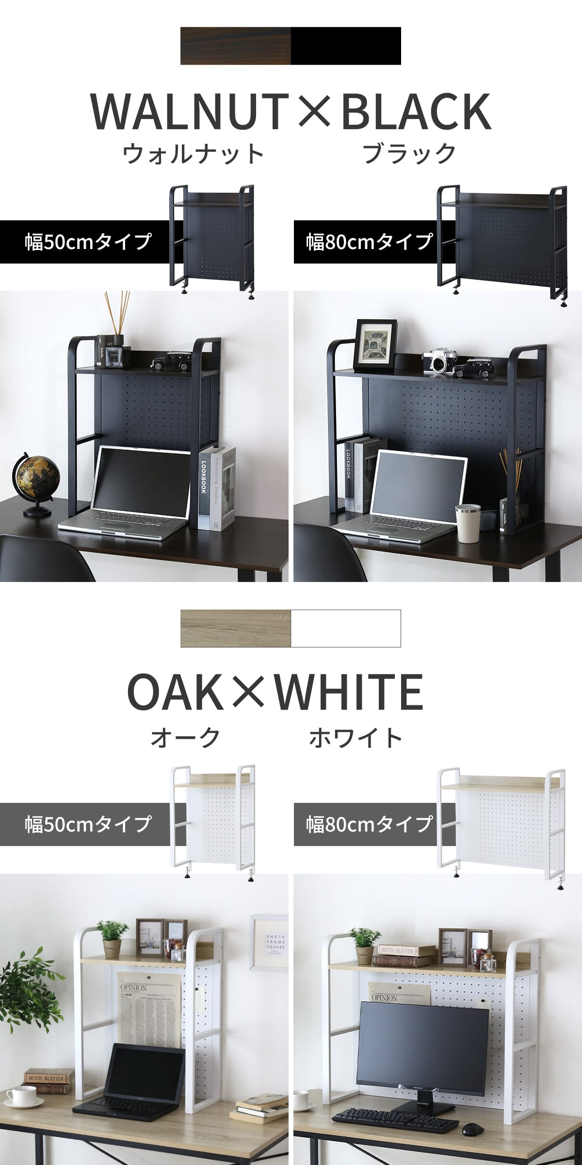 お部屋のテイストやデスクの色味に合わせて選べる「ウォルナット棚板 × ブラックスチール」、「オーク棚板 × ホワイトスチール」の2カラー。用途やデスク幅に合わせて選べる幅50cmと80cmタイプをご用意しました。