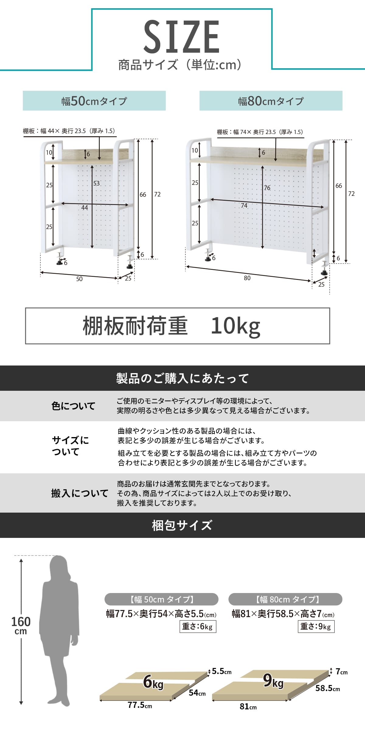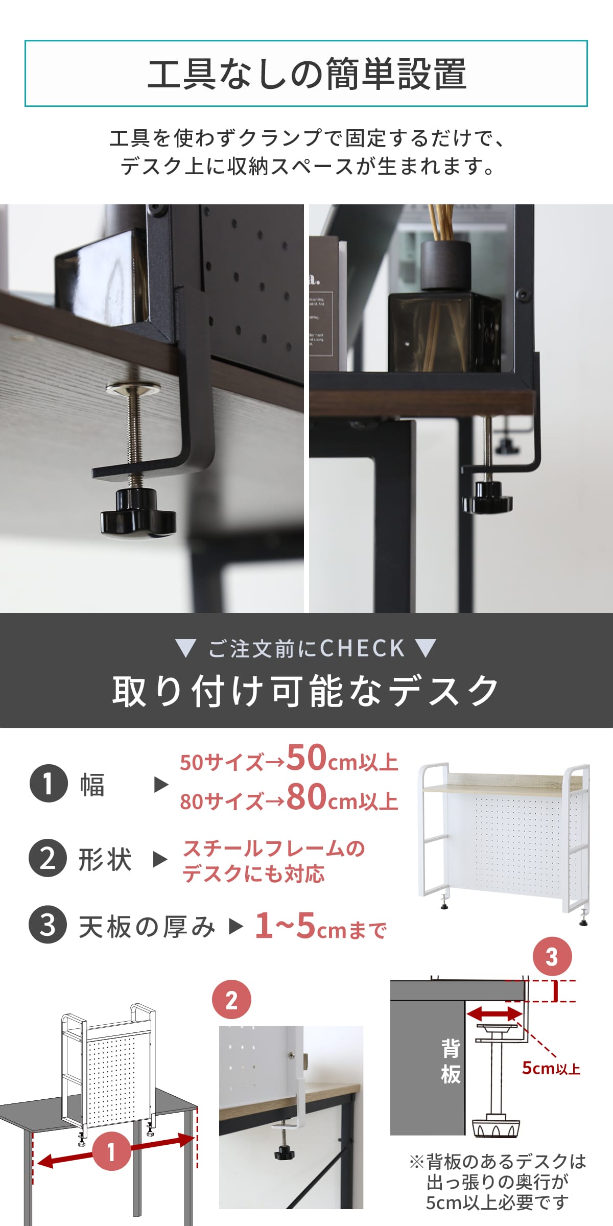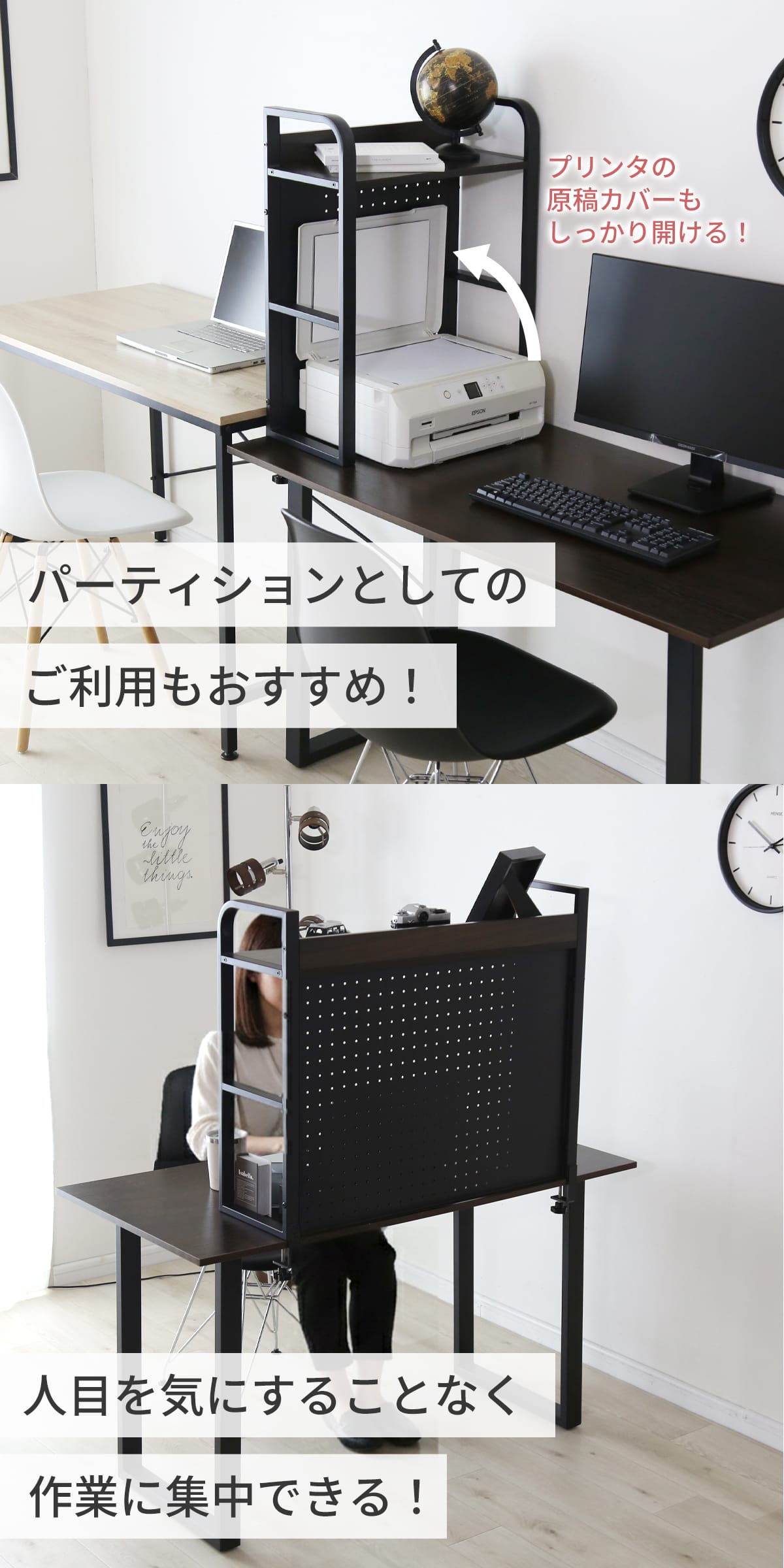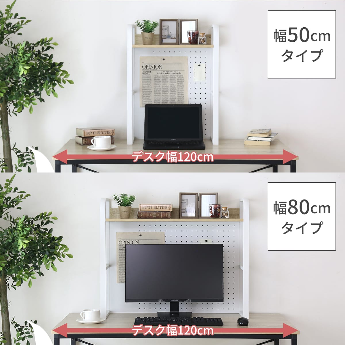 お部屋のテイストやデスクの色味に合わせて選べる「ウォルナット棚板 × ブラックスチール」、「オーク棚板 × ホワイトスチール」の2カラー。用途やデスク幅に合わせて選べる幅50cmと80cmタイプをご用意しました。