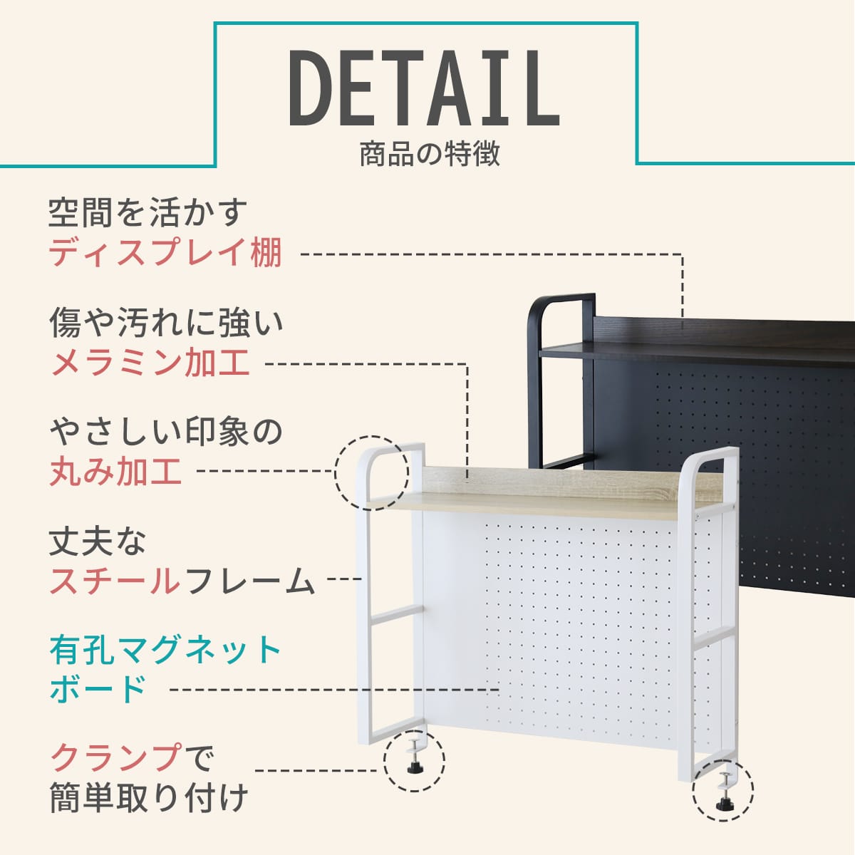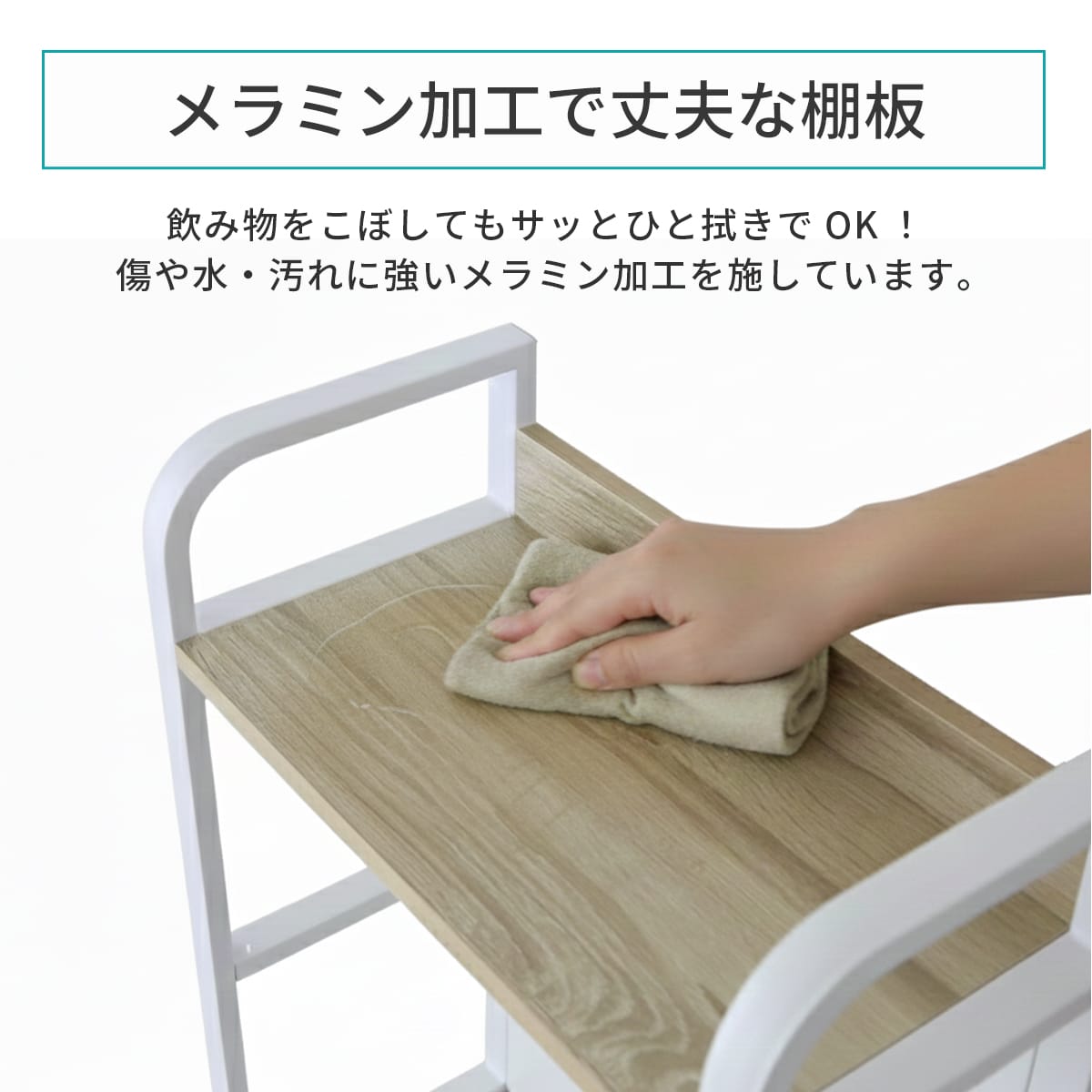 棚板表面にはメラミン加工を施し、傷や汚れに強い仕様に。ホコリ汚れも、サッと拭くだけでお手入れ簡単。デスク周りを清潔に保てます。