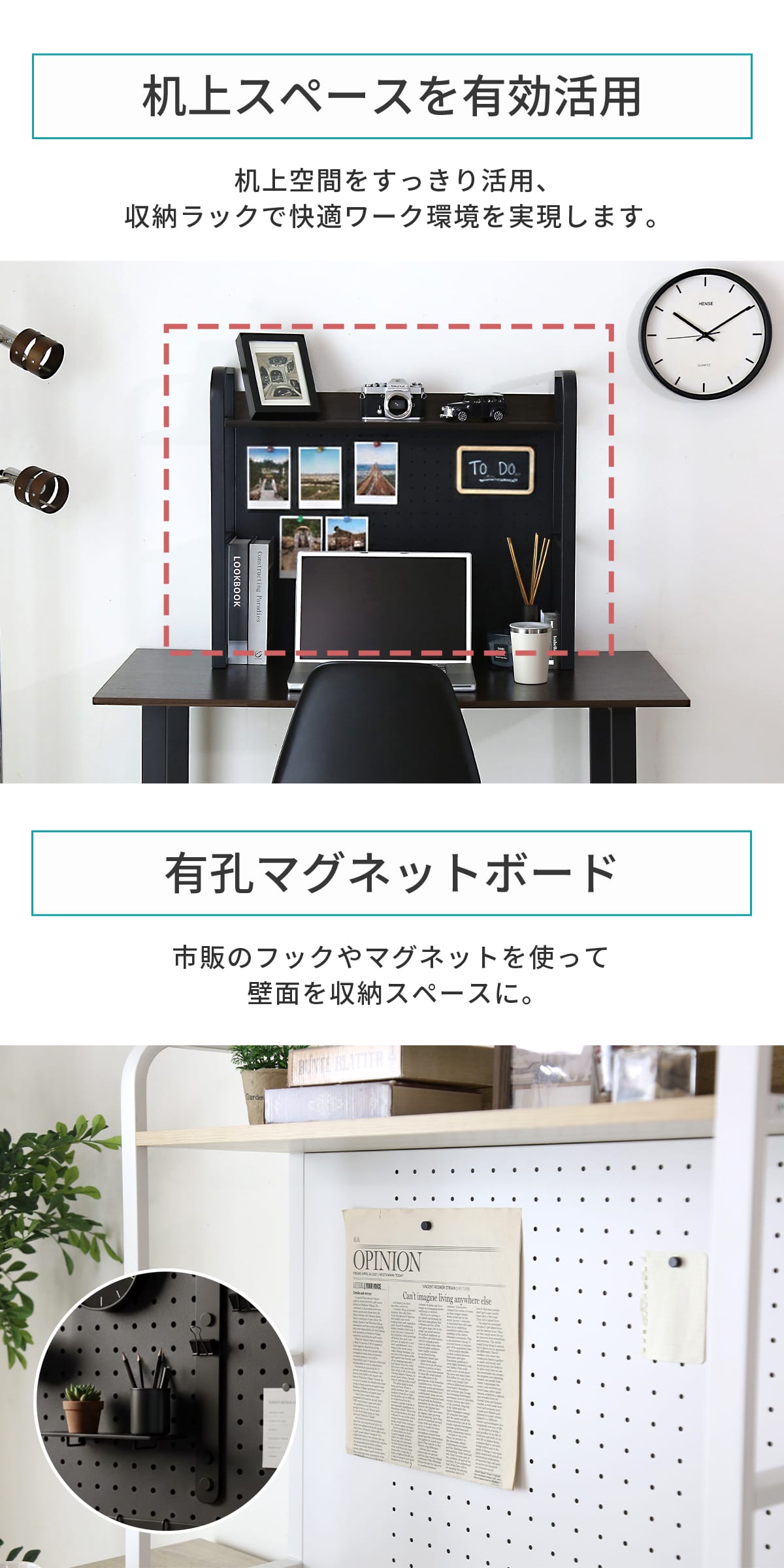 有孔マグネットボード付きで、市販のマグネットやフックを使えば、メモや書類を貼り付けたり、小物を収納したりと自在に活用できます。限られた作業スペースでも収納力をプラスし、デスク周りをすっきり整えます。