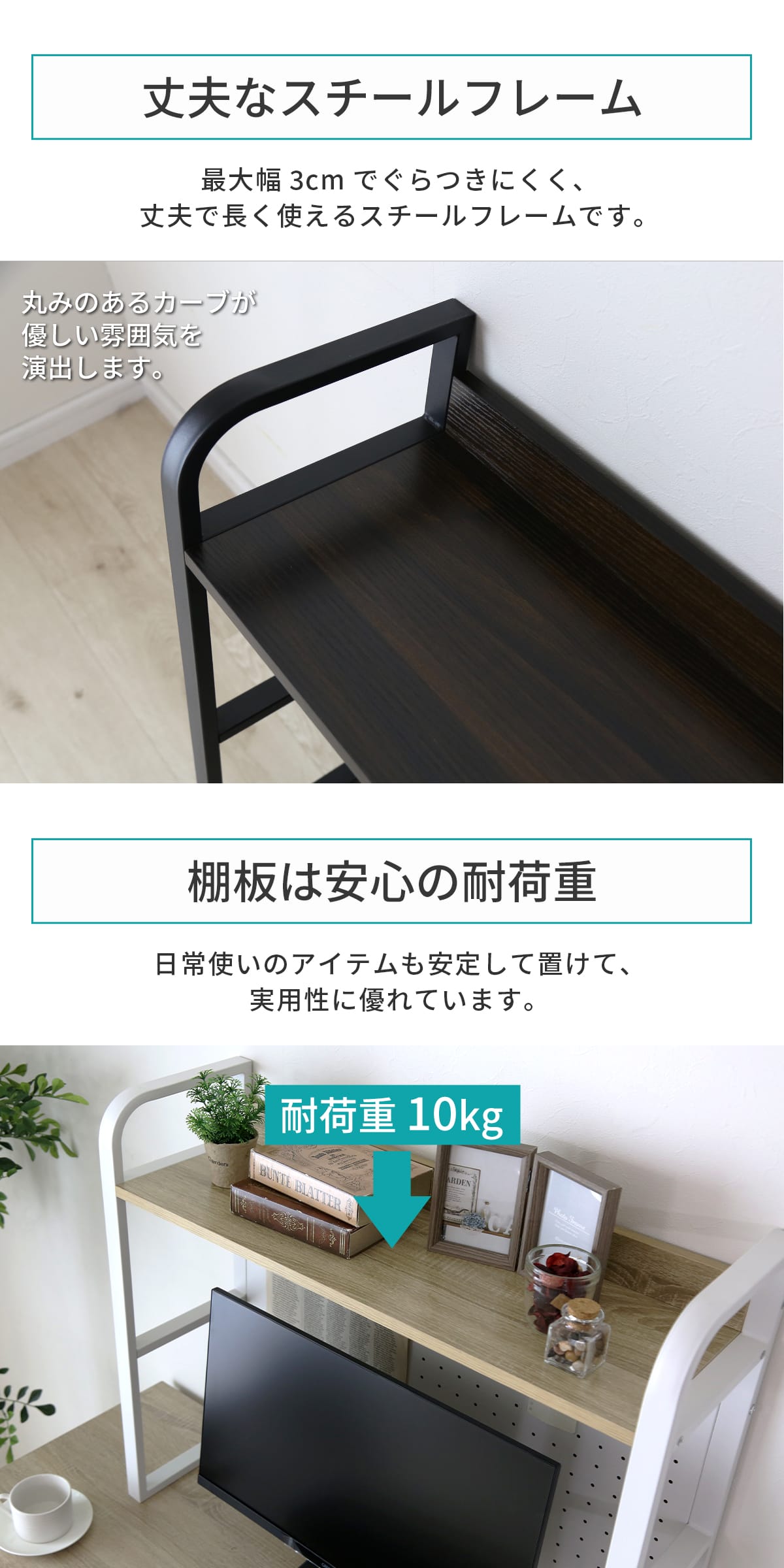フレームには最大幅3cmのスチール素材を使用し、安定感のあるつくりに。棚板1枚あたり耐荷重約10kgで、書籍など少し重たい荷物も安心して置くことができます。
