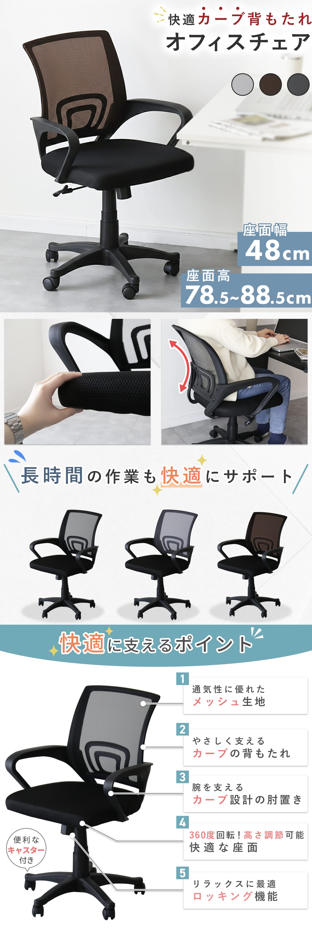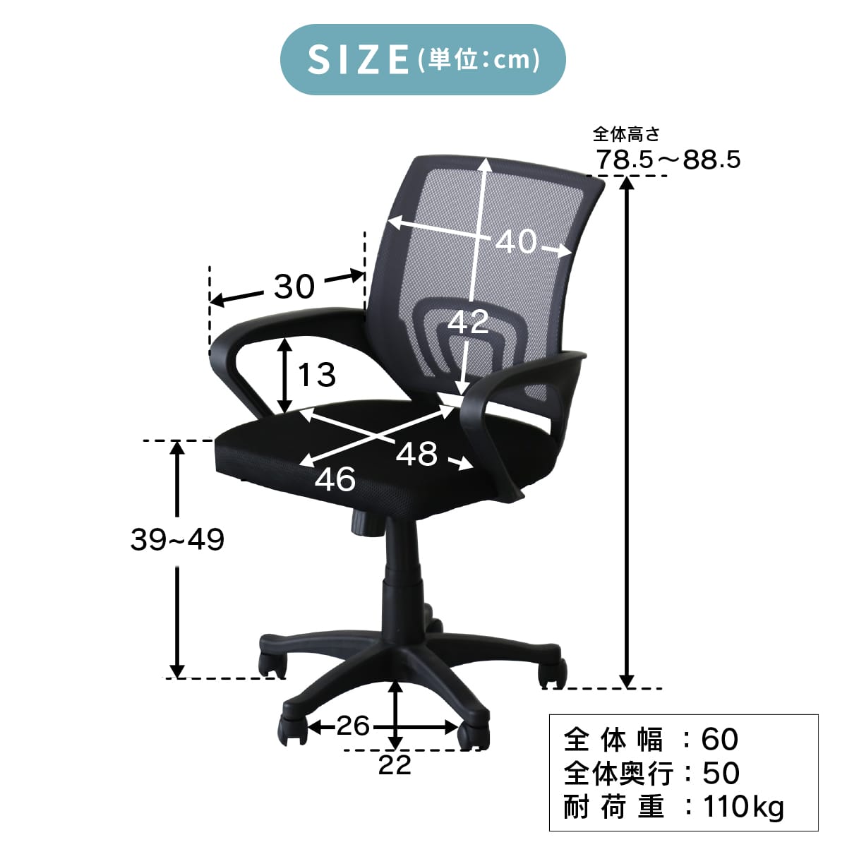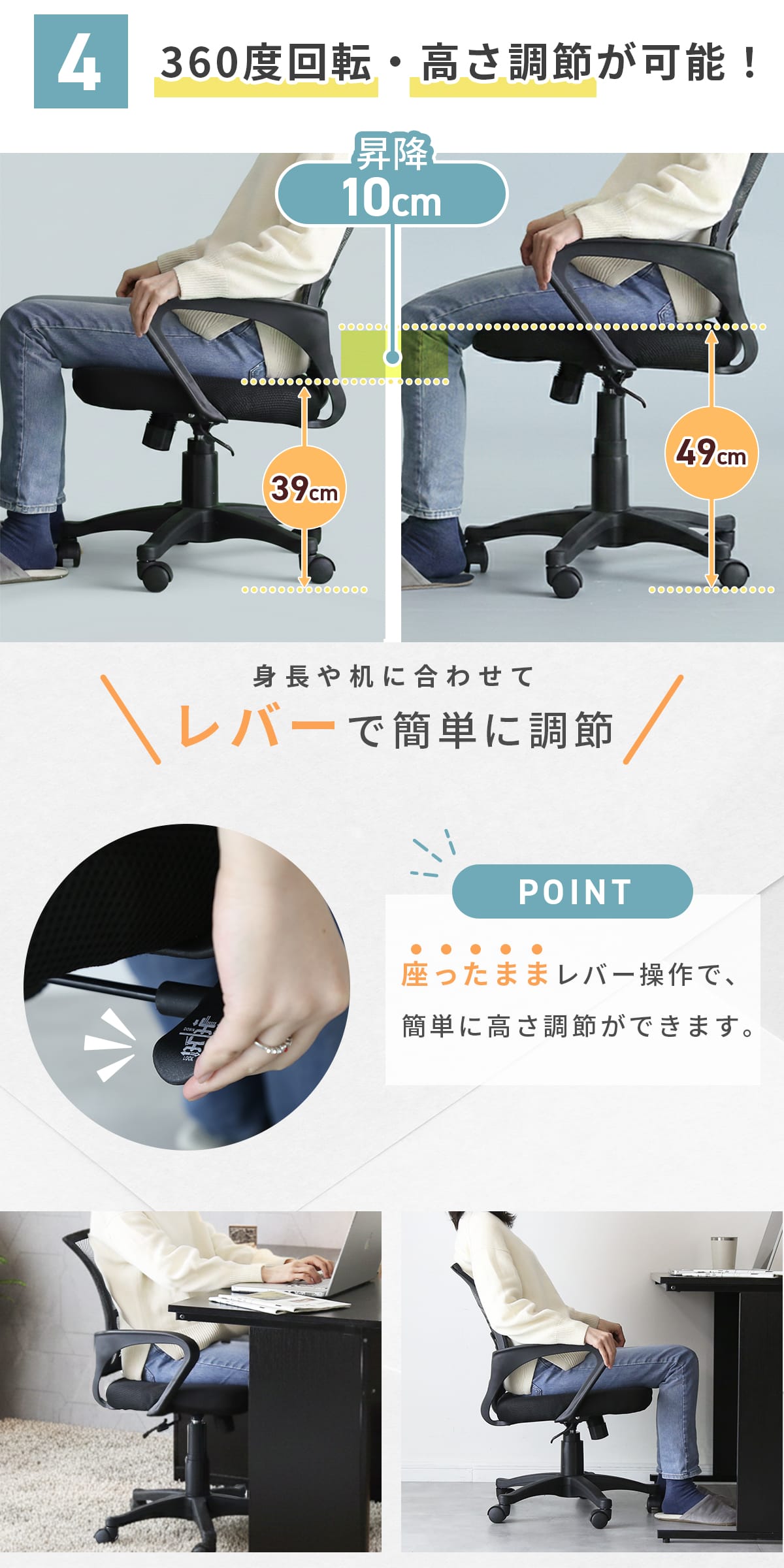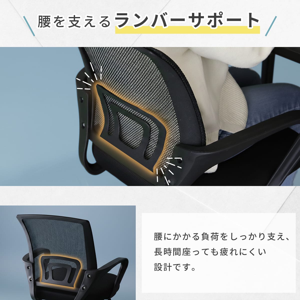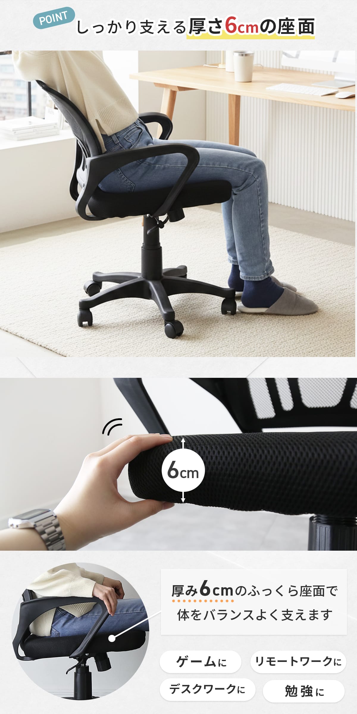 座面の高さは約10cmの範囲で調節が可能です。デスクの高さや使用する環境、体格に合わせて細かく調整できるため、無理のない姿勢で作業が行えます。高さが合っていない椅子は疲れやすさの原因になりますが、本商品なら自分に合ったポジションを見つけやすく、快適なデスク環境づくりをサポートします。オフィス用はもちろん、私室でのPC作業や学習椅子としても使いやすい仕様です。