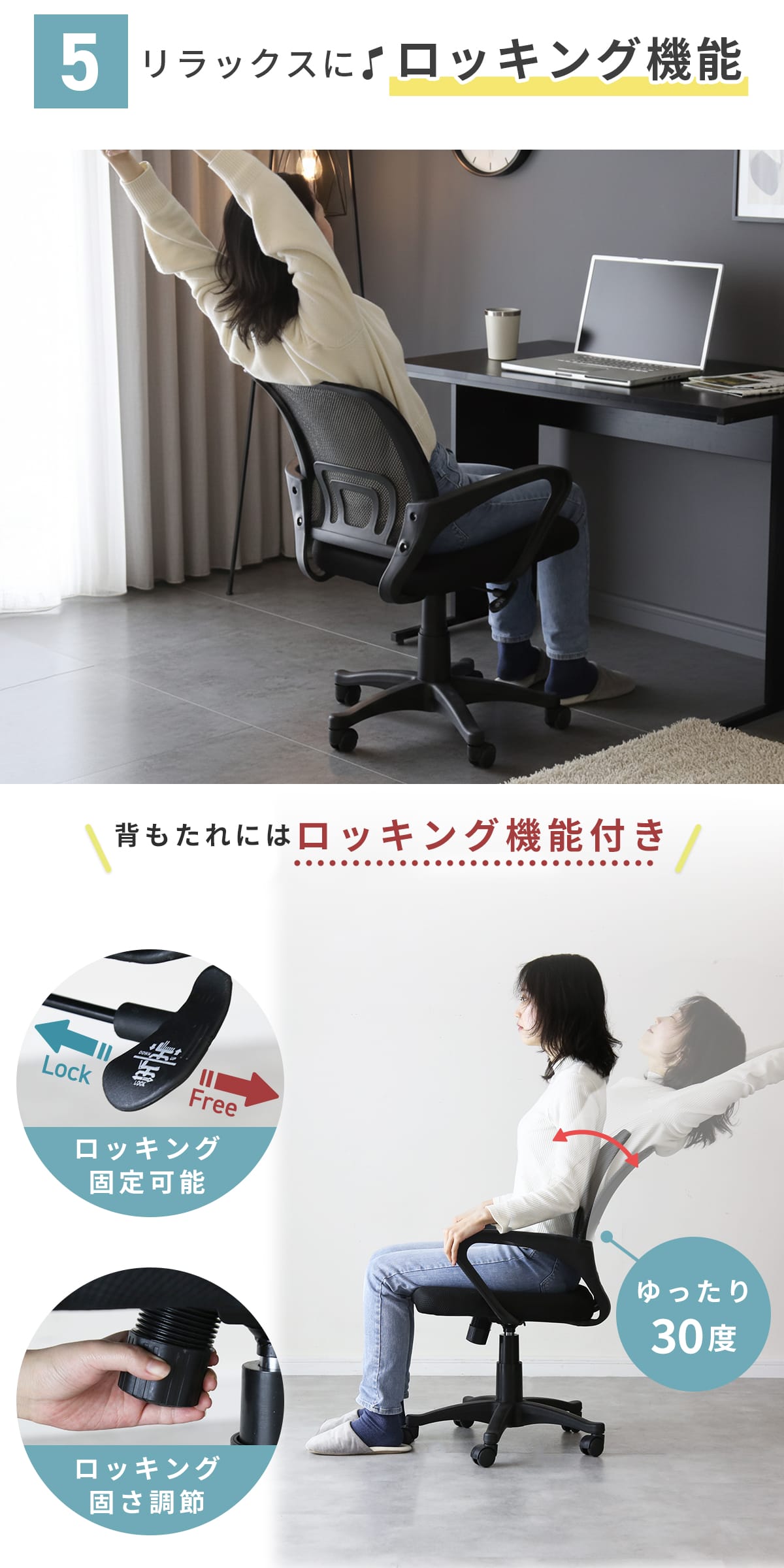 ロッキング機能を備えており、背もたれに体を預けることで、ゆったりとリラックスした姿勢を取ることができます。長時間の仕事やパソコン作業の合間に、軽く体を伸ばすことで気分転換にもつながります。また、ネジでロッキングを固定できるため、作業に集中したいときには安定感のある座り心地に切り替えることが可能です。オンとオフを使い分けられる仕様は、在宅ワークやリモートワーク、学習用の椅子としても便利で、用途に合わせて快適な座り方を選べます。