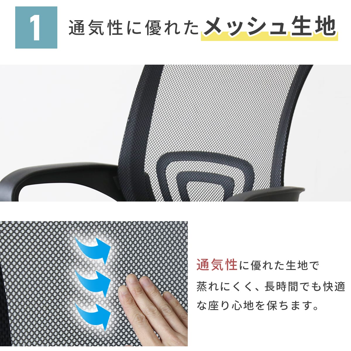 背もたれ部分には通気性に優れたメッシュ素材を使用しています。空気がこもりにくく、長時間座っても蒸れにくいため、快適な座り心地を保ちます。特に在宅ワークや仕事で長時間パソコンに向かう方にとって、背中の不快感を軽減できるのは大きな魅力です。季節を問わず使用しやすく、夏場は涼しく、冬場も違和感なく使えるため、オールシーズン活躍するメッシュチェアです。