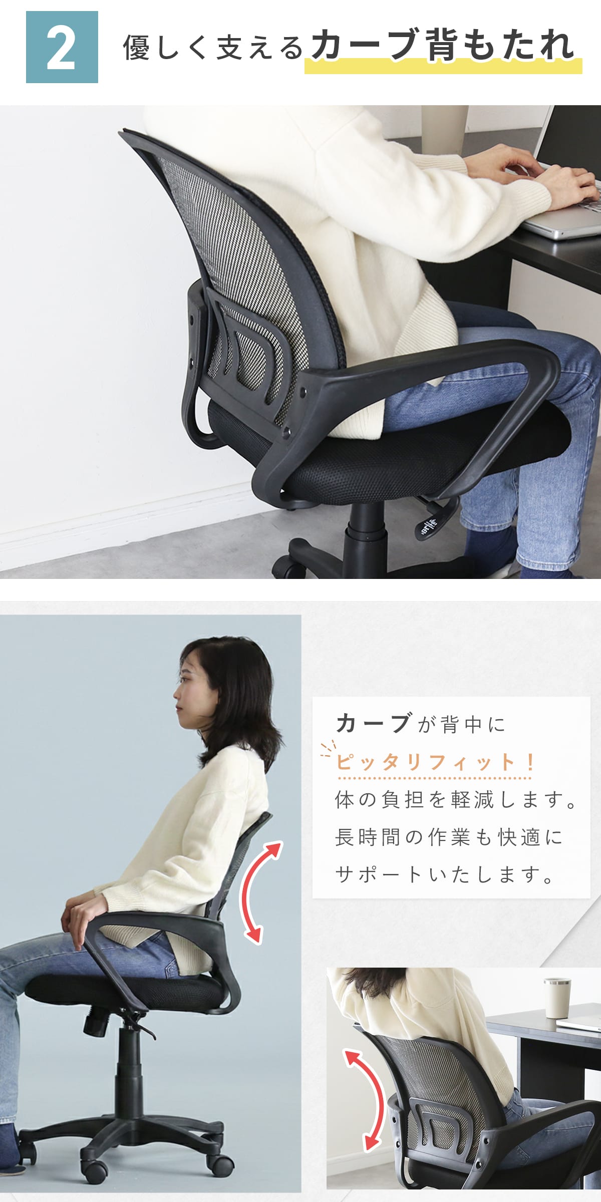 背もたれは人の背骨の形状に近いカーブ設計を採用しています。背中から腰にかけてやさしくフィットし、正しい姿勢を自然にサポートします。長時間座っていると姿勢が崩れやすくなりますが、本商品は体を預けるだけで無理なく姿勢を整えやすいのが特長です。デスクワークやゲーム、勉強などで長時間椅子に座る方にとって、腰への負担軽減が期待でき、腰痛対策を意識したい方にもおすすめのオフィスチェアです。