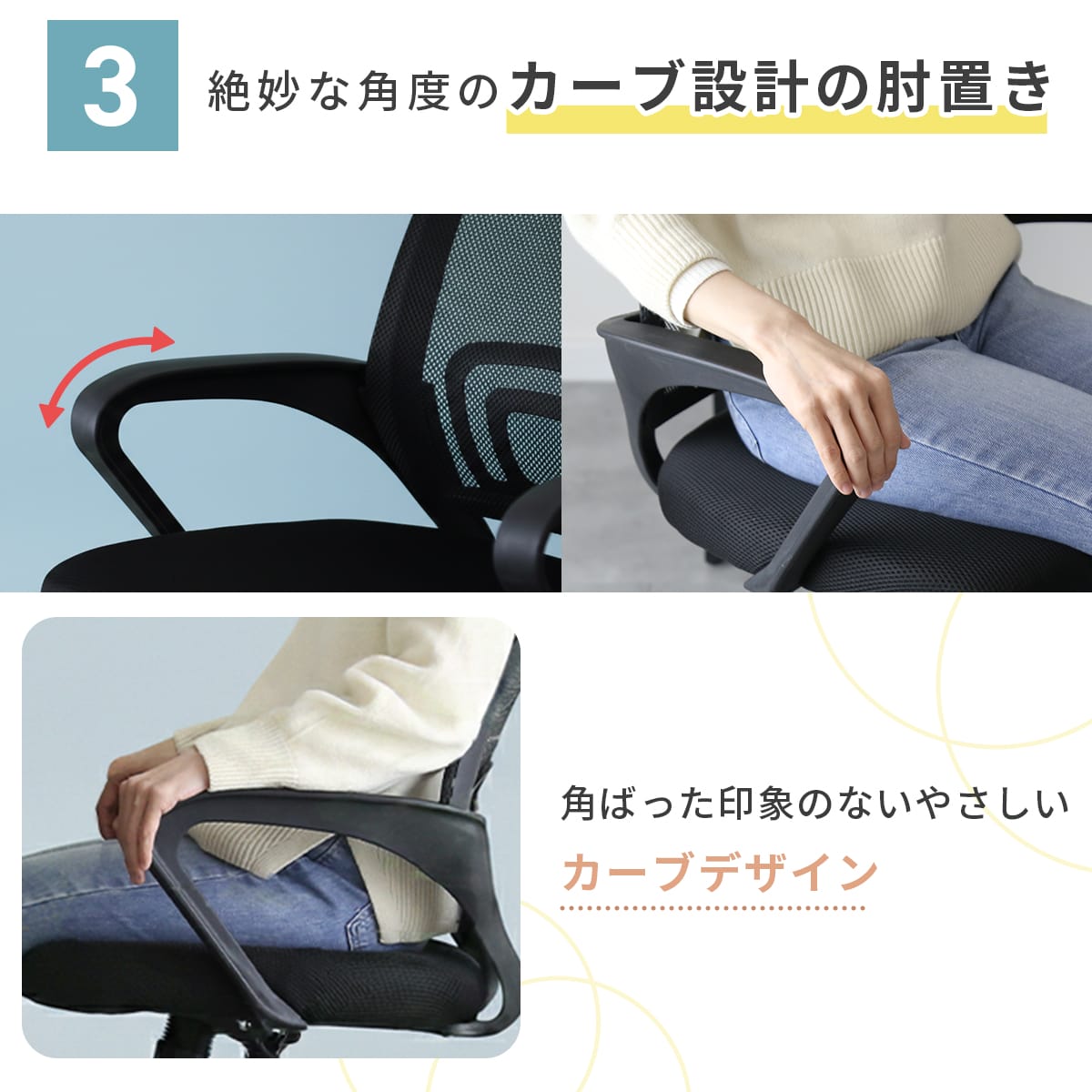 肘置きには、腕のラインに沿ってゆるやかにカーブした形状を採用しています。肘や腕を自然に預けることができ、長時間のデスクワークやパソコン作業でも肩や腕への負担を軽減します。タイピングやマウス操作の際も、腕の位置が安定しやすく、作業姿勢が崩れにくいのが特長です。