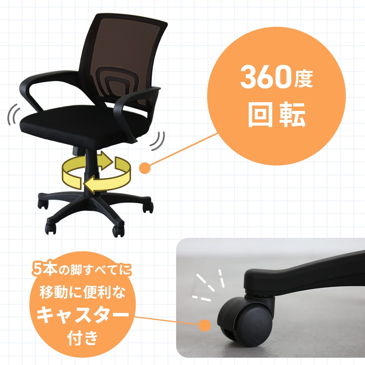 キャスター付きで、椅子に座ったままスムーズに移動できます。また、360度回転するため、立ち座りや向きの変更もスムーズです。デスク周りでの動作が多い方でもストレスなく使用でき、作業効率の向上にもつながります。床を傷つけにくく、オフィスや自宅の書斎など、さまざまな空間で使いやすい仕様です。