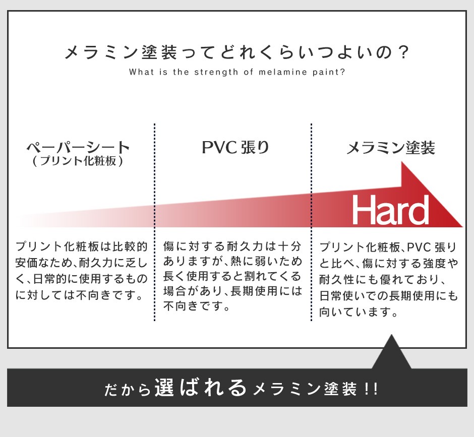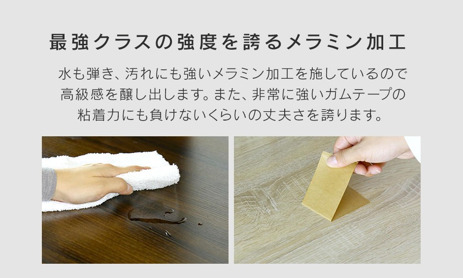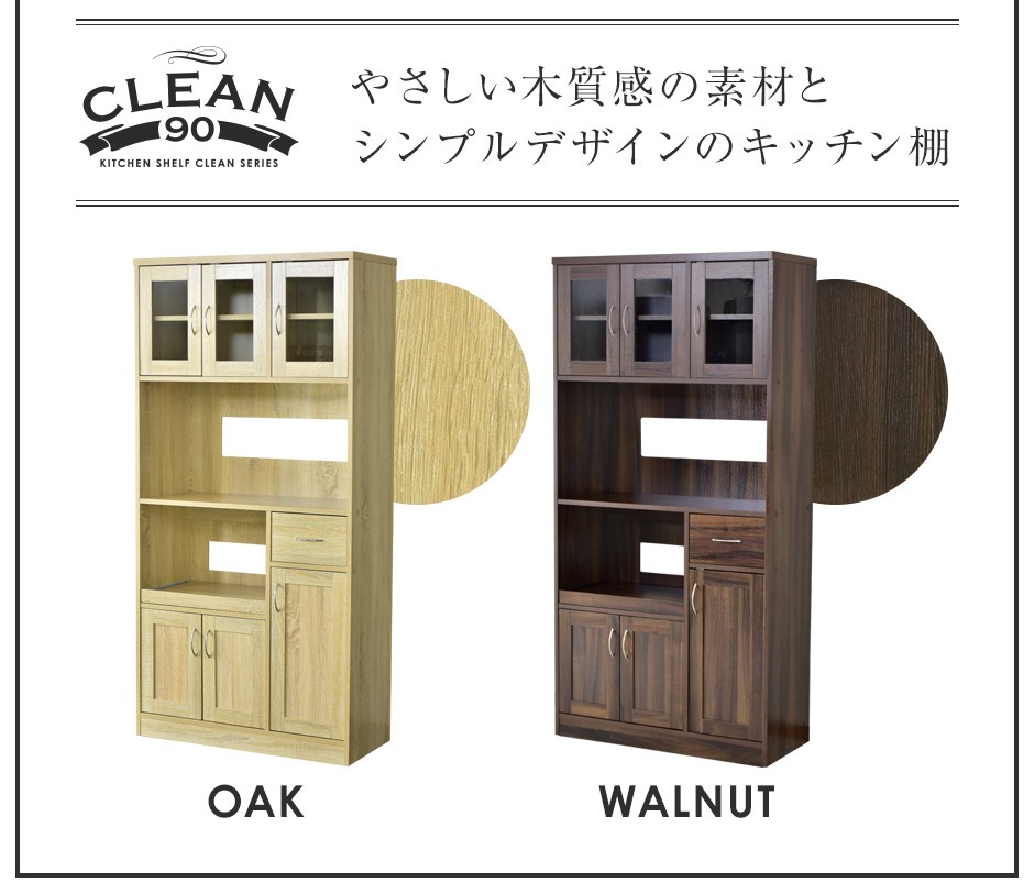 | 耐久性とおしゃれなデザインを両立 | 「Clean90cm【クリーン90cm】」は、耐久性の高いパーティクルボードにメラミン加工が施されており、キッチン特有の湿気や汚れ、傷に強い素材を採用しています。これにより、日々の使用にも耐える丈夫さと、美しさを長期間維持することが可能です。また、オークやウォルナットのカラーが用意されており、キッチンやダイニングルームのインテリアに合わせて選べるのも魅力です。スタイリッシュで落ち着いたデザインは、シンプルながらも高級感を演出し、どんな空間にも馴染みます。さらに、実用性とデザイン性を兼ね備えているため、機能的でありながら見た目にもこだわりたいという方におすすめのアイテムです。 |