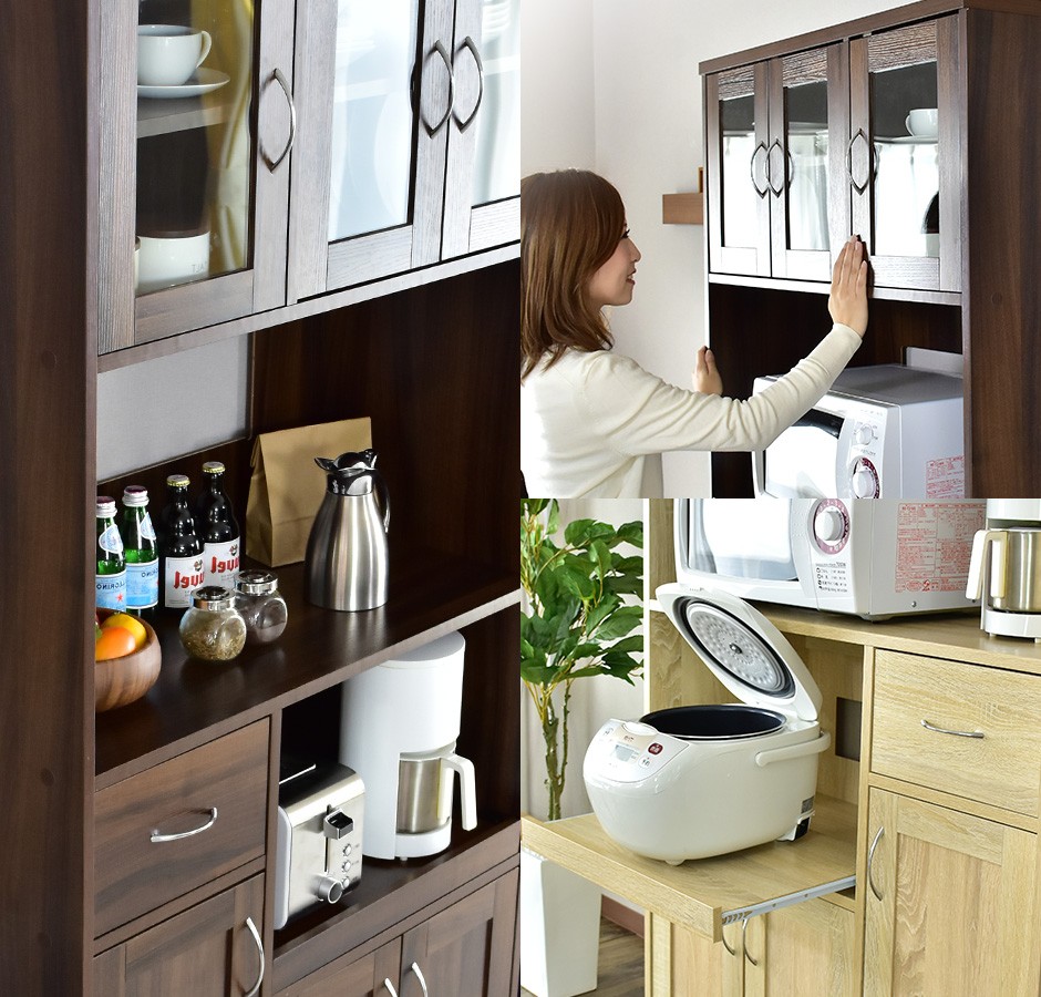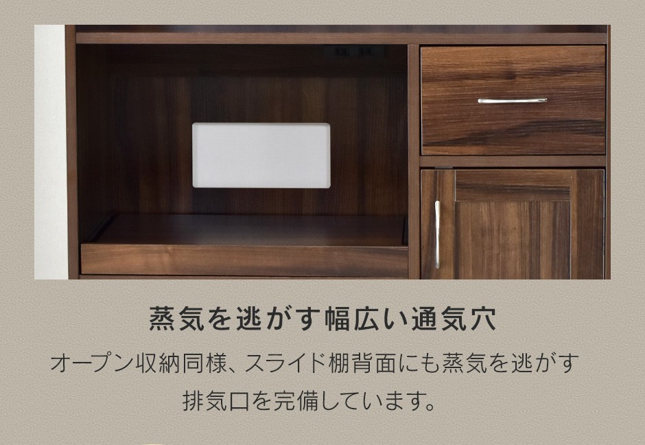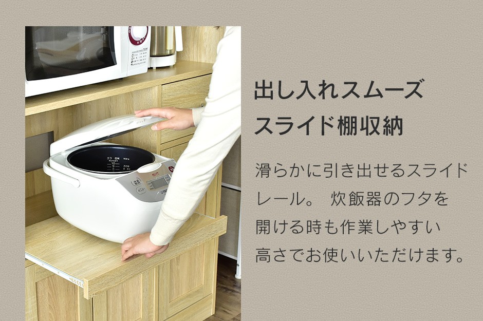| スライド収納棚で家電の配置に最適 | 「Clean90cm【クリーン90cm】」には、スライド式の収納棚が搭載されており、炊飯器やトースター、電子レンジなどのキッチン家電を置くのに最適です。このスライド収納棚は、使用時に手軽に引き出して使えるため、炊飯器の蒸気や家電の操作がしやすく、利便性が高いのが特長です。家電を使うたびにスライド棚を引き出すことで、スペースを効率的に使うことができ、キッチンの作業動線をスムーズにします。また、使用しないときには家電をスライド棚の奥に収納できるため、キッチン全体がすっきりと整頓されます。このスライド収納機能は、狭いキッチンスペースでも快適に家電を使いたいという方にとって、大変便利な機能です。さらに、家電の置き場所に困らず、スペースの有効活用ができるため、キッチンがより使いやすくなります。 |