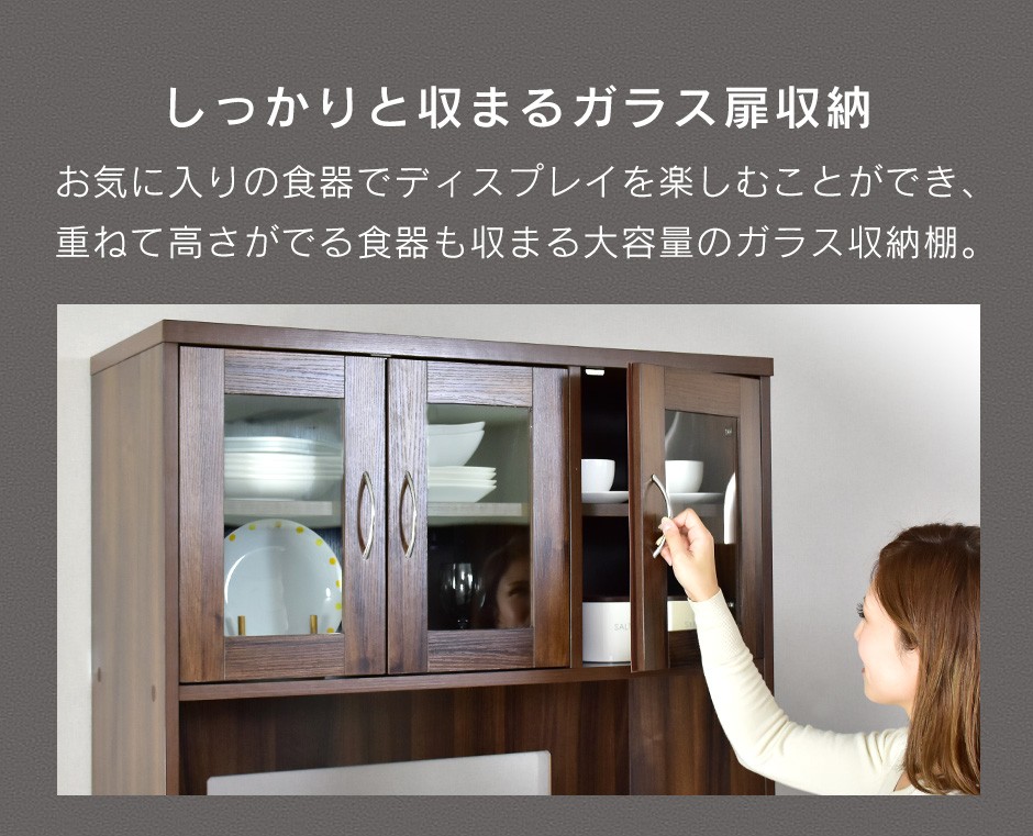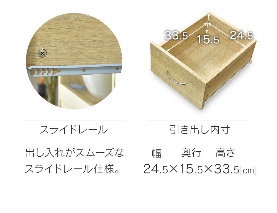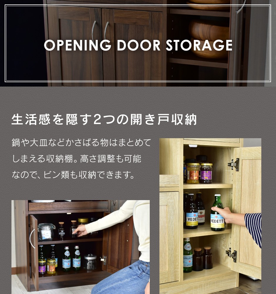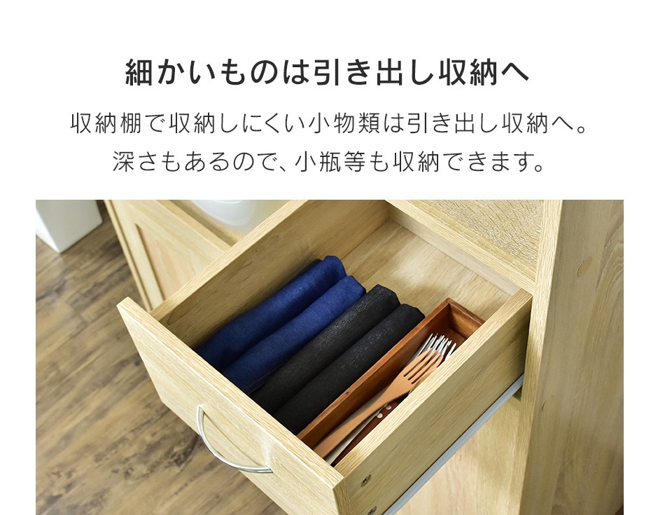 食器棚 Clean90cm【クリーン90cm】 | 商品特徴| 見せる収納と隠す収納で使い分け可能なデザイン | キッチンラック「Clean90cm【クリーン90cm】」は、オープン収納と引き出し収納を組み合わせた設計で、見せる収納と隠す収納を自由に使い分けられる点が大きな魅力です。オープン収納スペースは、おしゃれなキッチン家電やお気に入りの食器をディスプレイするのに最適で、キッチンにスタイリッシュな雰囲気を加えます。一方で、引き出しや収納棚は、細かいキッチンツールや調味料、キッチン用品をスッキリと収納でき、キッチンを清潔で整理された状態に保つことができます。特に、スライド式の収納棚は炊飯器やトースターを置くのにピッタリで、使用時には引き出して使えるため、便利な操作性を提供します。このように、日々のキッチン作業において、見せたいアイテムと隠したいアイテムをうまく使い分けることができるデザインが、機能性と美しさを両立させた理想的な収納ソリューションです。 |