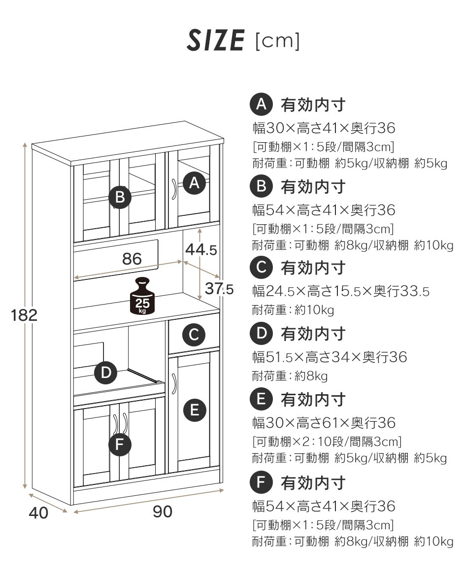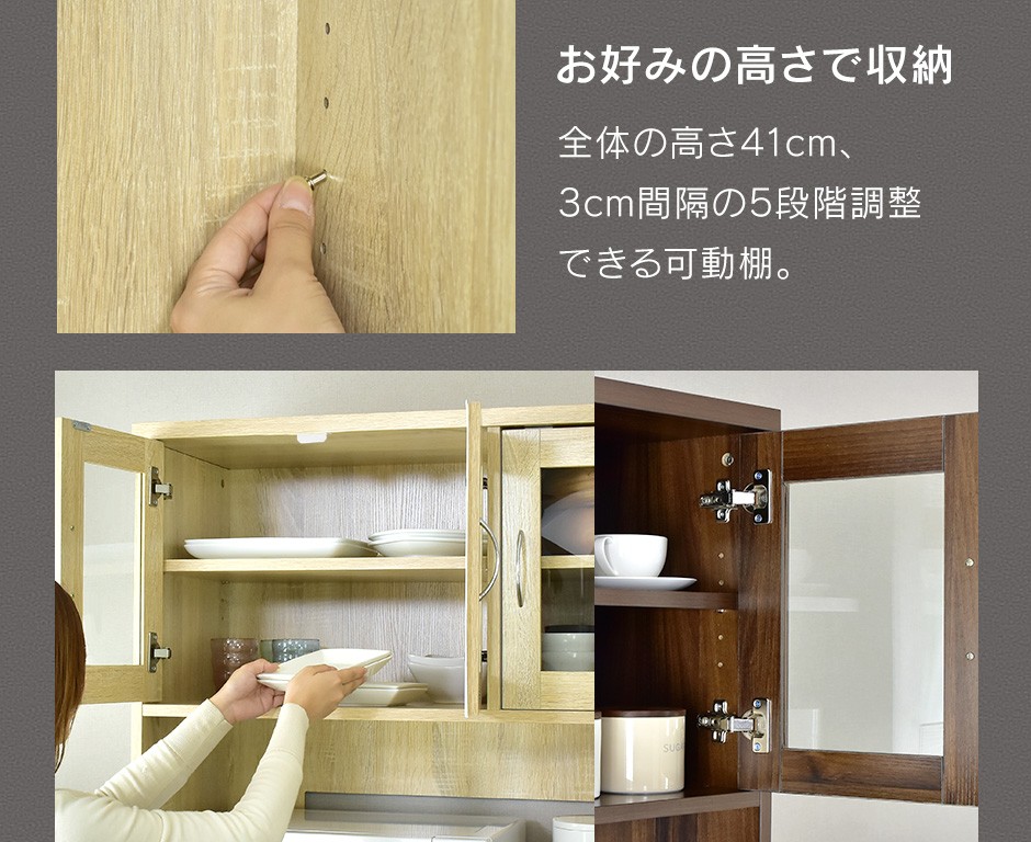 | 高さ調整可能な可動棚 | 「Clean90cm【クリーン90cm】」は、可動式の棚を備えており、収納するアイテムに応じて高さを調節できるのが大きな特徴です。可動棚の設計により、大きさや形の異なる調理器具や食器、食品ストックなど、様々なキッチンアイテムを効率的に収納することが可能です。特に、季節ごとに変わるアイテムや、頻繁に使う物とそうでない物を区別して収納したい場合などに非常に便利です。使い勝手を重視した可動棚は、収納の自由度を高め、日々の片付けや整理整頓をサポートします。また、収納スペースを最大限に活用できるため、無駄なスペースがなく、キッチン全体がすっきりとした印象に。収納棚の高さを自由に調整できるため、購入後のライフスタイルやキッチン環境の変化にも柔軟に対応できます。 |