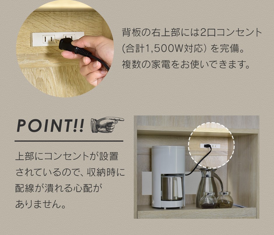 | コンセント付きでキッチン家電の使用に便利 | キッチンラック「Clean90cm【クリーン90cm】」は、便利なコンセントが付いており、キッチン家電の使用に非常に便利です。キッチンの限られたスペースでも、炊飯器や電子レンジ、トースターなどの家電を一箇所にまとめて置くことができ、配線の煩わしさも軽減します。コンセント付きのキッチンラックは、日常の家事効率を大幅に向上させるアイテムとして多くの家庭で重宝されています。また、家電が集中するスペースに電源を確保することで、家事動線をスムーズにし、料理や片付けの手間を減らすことが可能です。さらに、家電のコンパクトな配置により、キッチン全体がすっきりと整頓された印象を与え、空間を最大限に活用できます。このコンセント機能は、特に狭いキッチンでもスペースを有効に使いたい方にとっては、大変助かるポイントです。 |