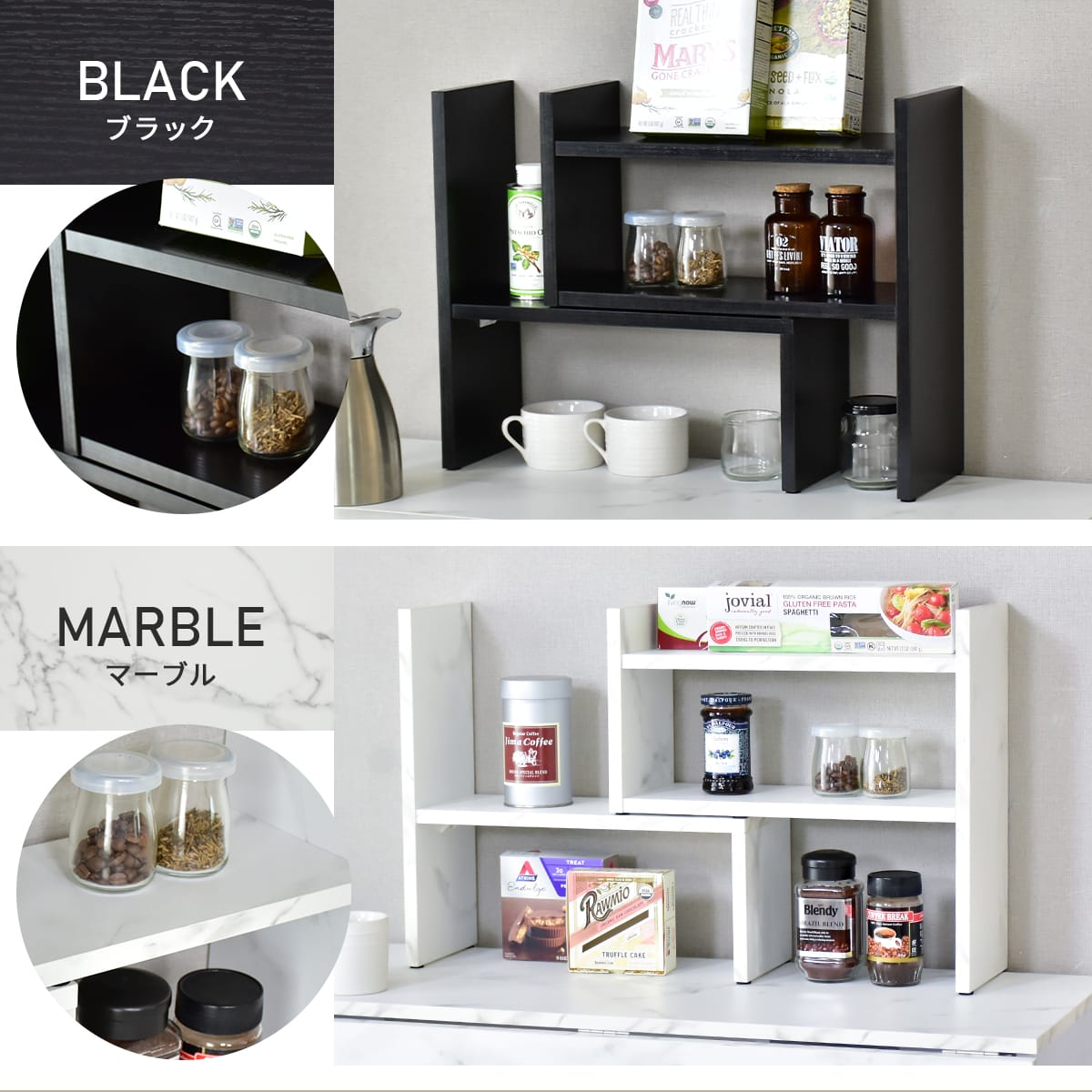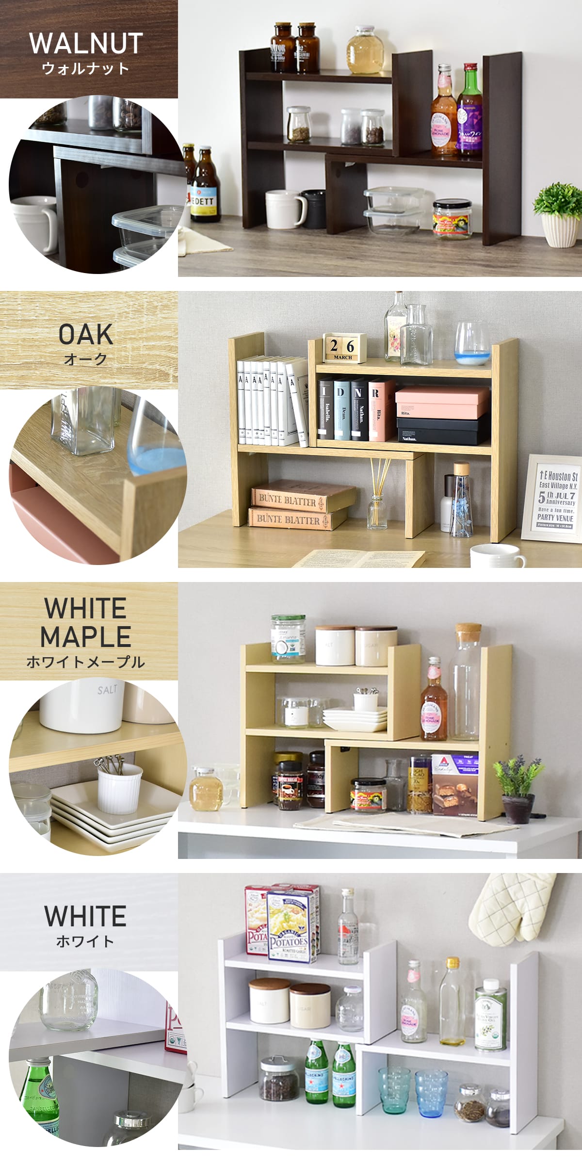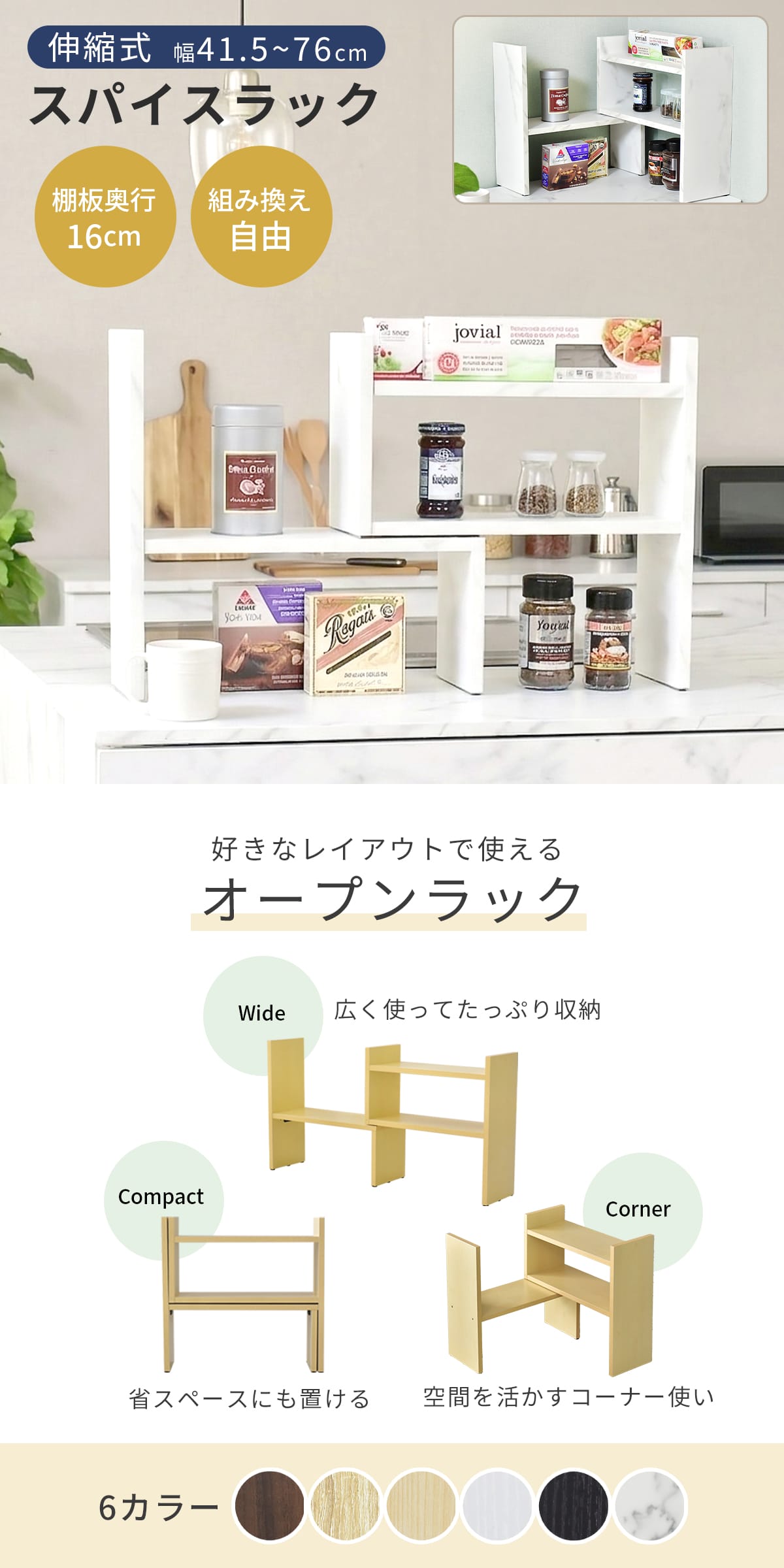 設置場所に合わせて自由に伸縮できるスライド式オープンラック。横幅や角度を自在に調整でき、卓上でも使いやすいコンパクト設計です。スパイスラックとしてはもちろん、組み換え次第でレイアウトも自由自在。限られたスペースにもぴったり収まり、使い勝手の良い収納を実現します。
