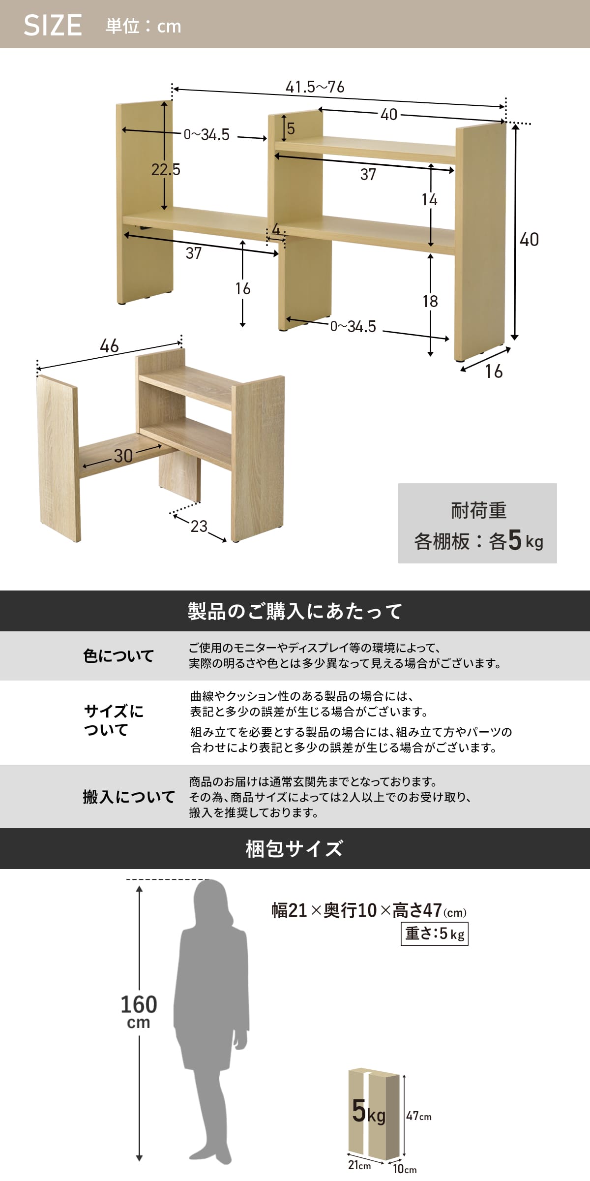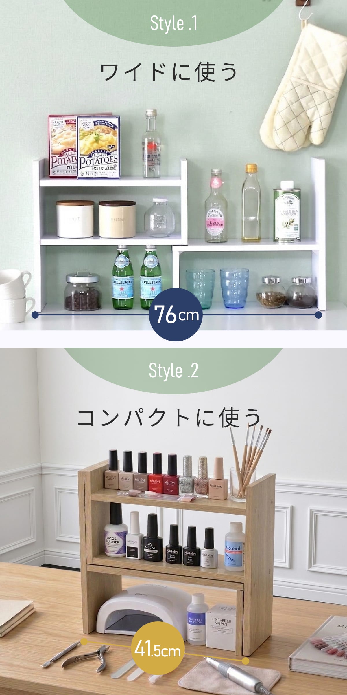 左右の棚を広げれば最大約76cmのワイドサイズに。キッチンカウンター上など広々とした場所でしっかり収納できます。縮めれば約41.5cmとコンパクトになり、ダイニングテーブルやデスクにも最適。必要なものを手の届く位置にまとめて置ける便利なサイズ設計です。