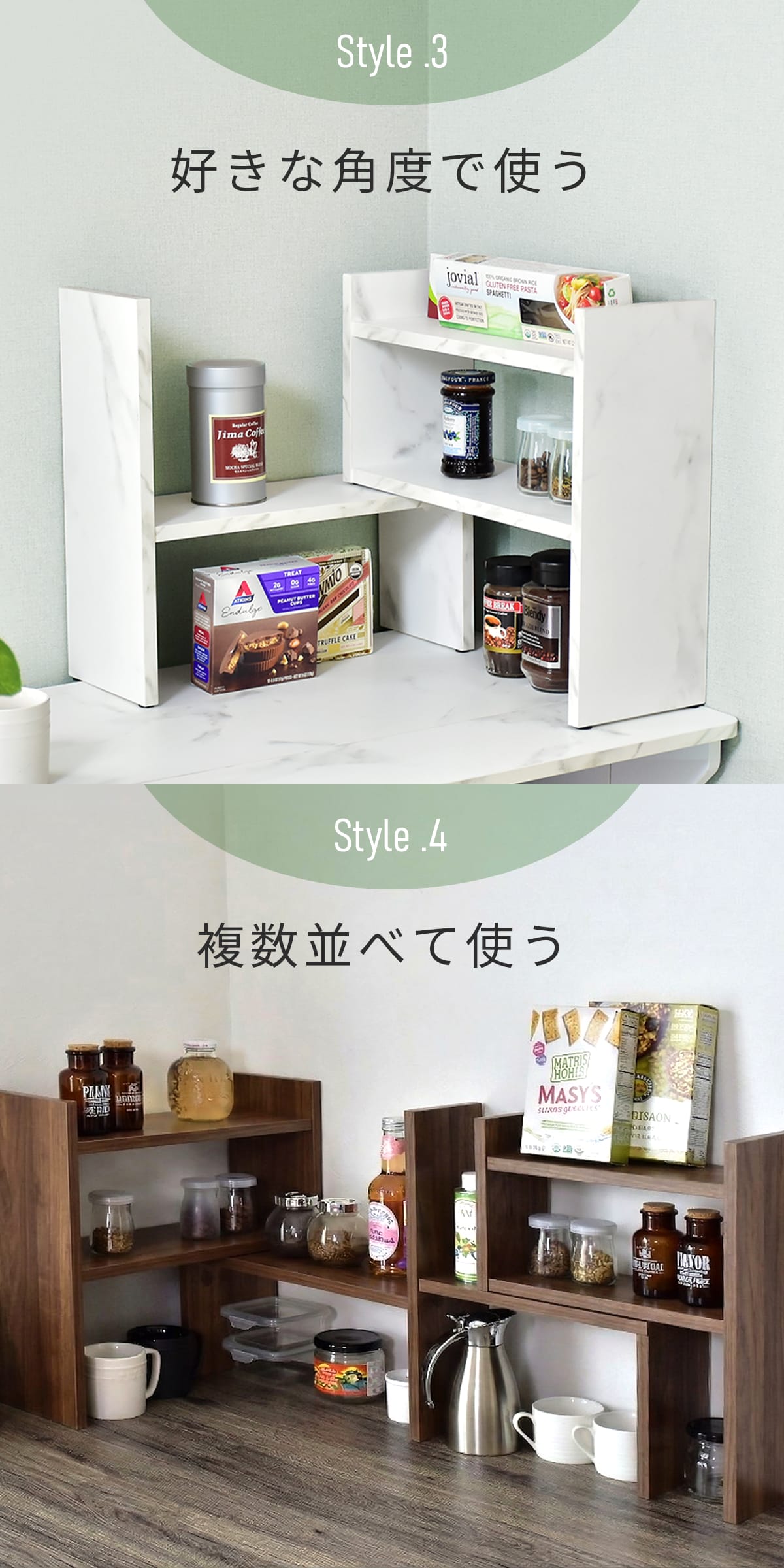 棚をスライド・回転させることで角度をつけたコーナー設置が可能。これまでデッドスペースになりがちだった隅も有効活用できます。空間にフィットするレイアウトができ、複数並べればさらに収納力アップ。限られたスペースを無駄なく使える設計です。