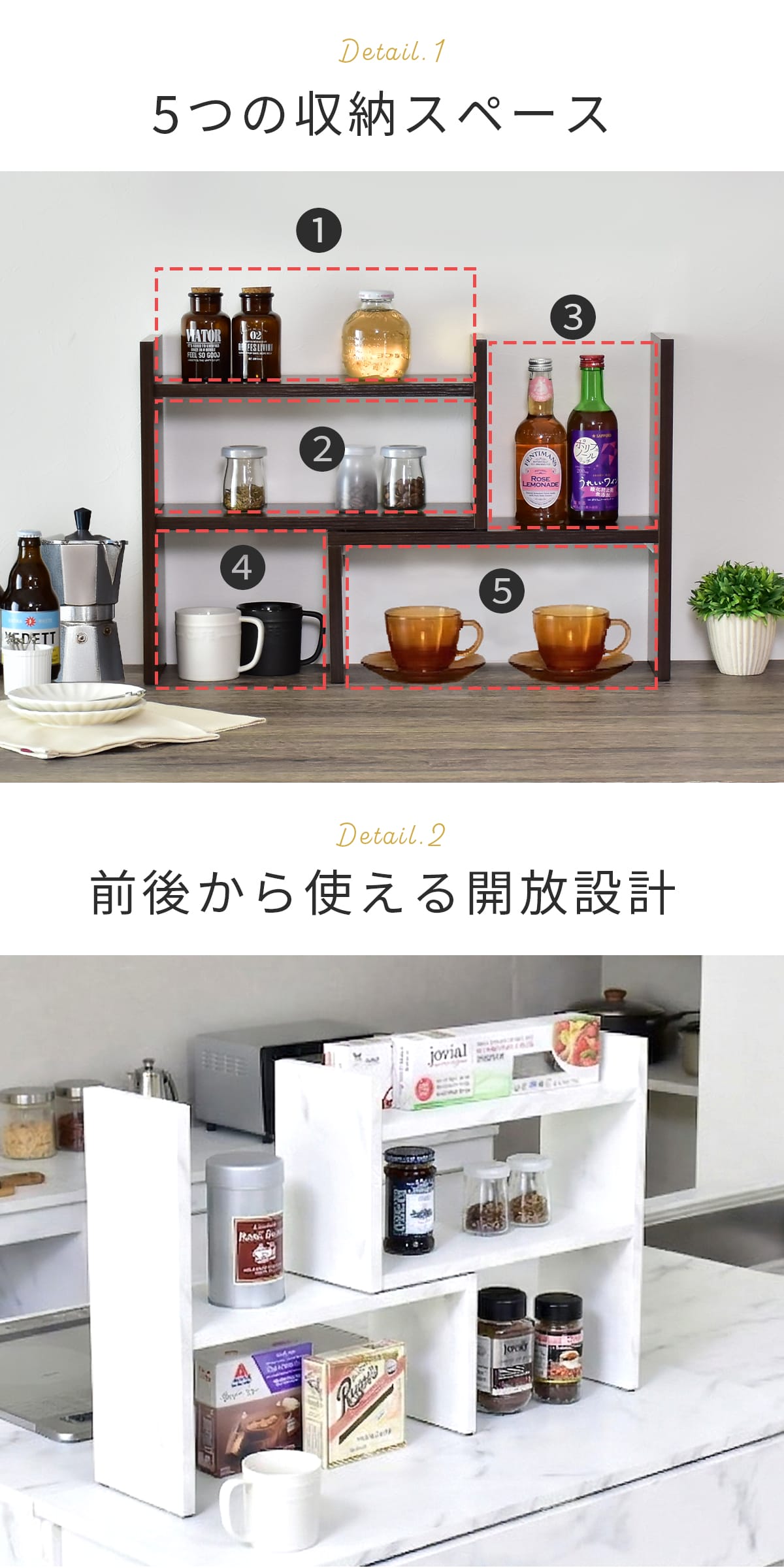 高さや幅の異なる収納スペースを備え、小物から背の高いボトルまで幅広く対応。背面のないオープン仕様で前後どちらからも取り出せる使いやすさも魅力です。光や視線を遮らないため、空間を圧迫せず明るく開放的な印象を保ちながら収納できます。