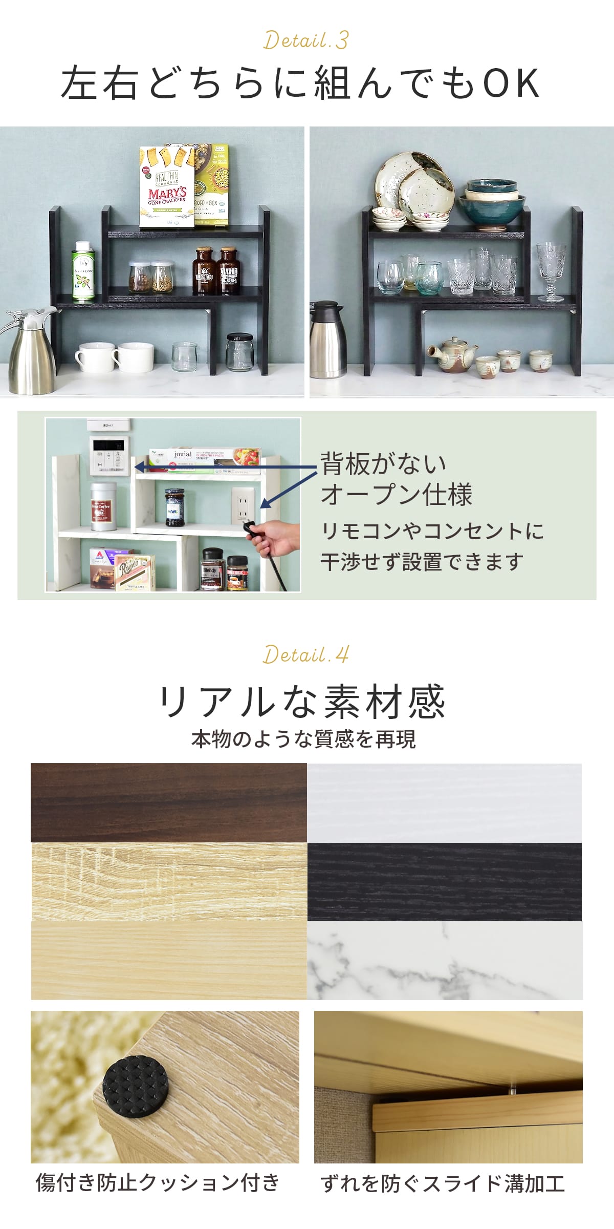 自由に組み替えできるだけでなく、横幅をスライドで細かく調節できる設計のため、壁面のリモコンやコンセントを避けながらぴったり設置できるのが魅力です。見た目にもこだわり、本物さながらの質感を再現した木目調とスタイリッシュな大理石調マーブルの2タイプをご用意。お部屋のテイストや好みに合わせて選べます。さらに、設置時の傷を防ぐクッションや、スムーズな開閉を叶えるスライド溝加工など、細部にまで使いやすさを追求した仕上がりです。