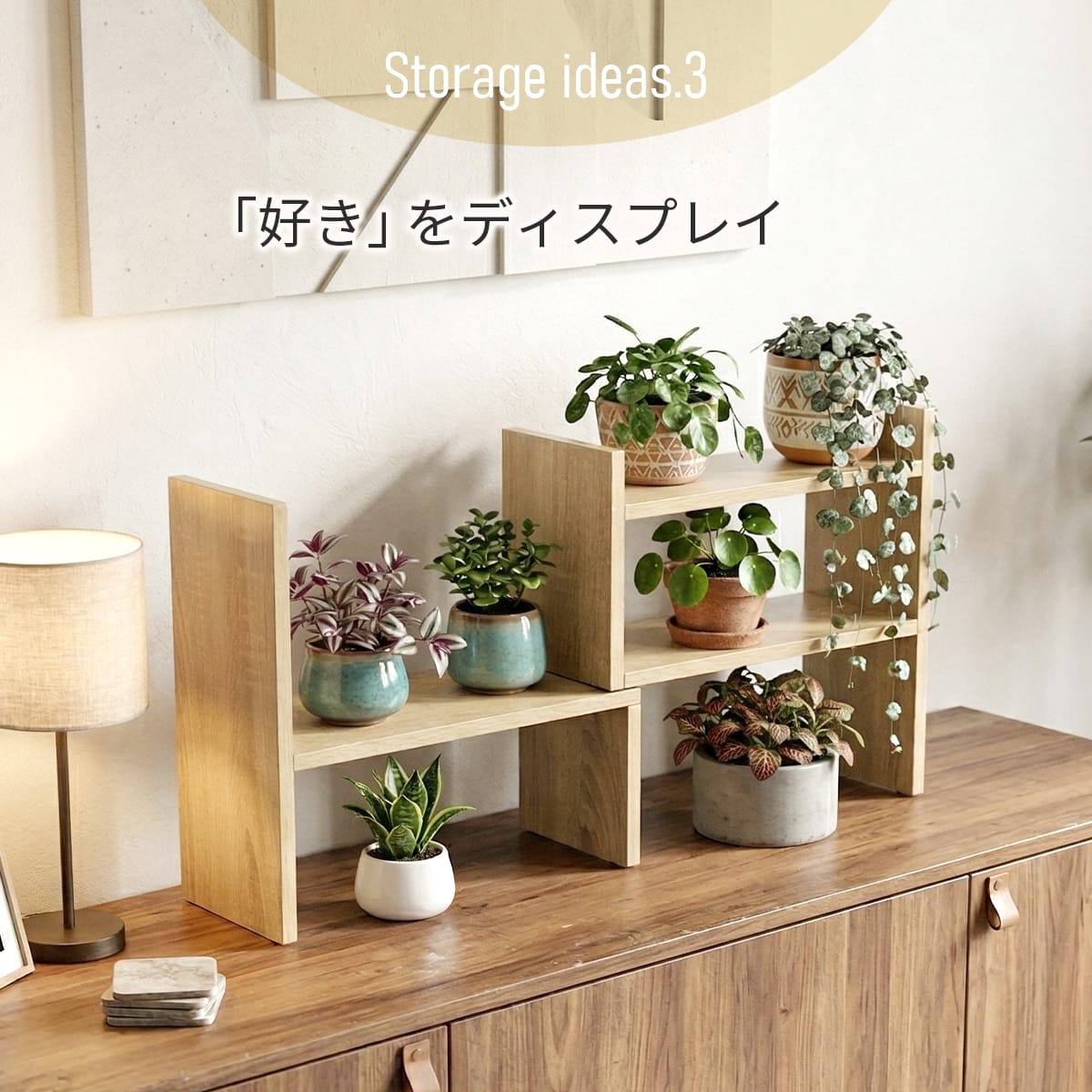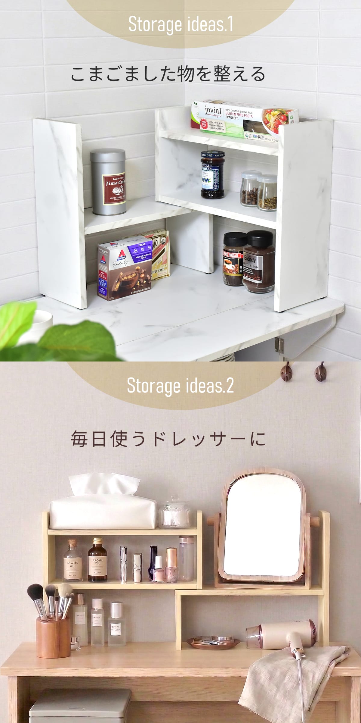 キッチンやデスク周りの小物をまとめて整理できるマルチ収納ラック。コスメを並べればドレッサー代わりとしても活躍します。さらに観葉植物やフィギュアなどのディスプレイにも最適。使い方次第で暮らしをおしゃれに彩る万能アイテムです。