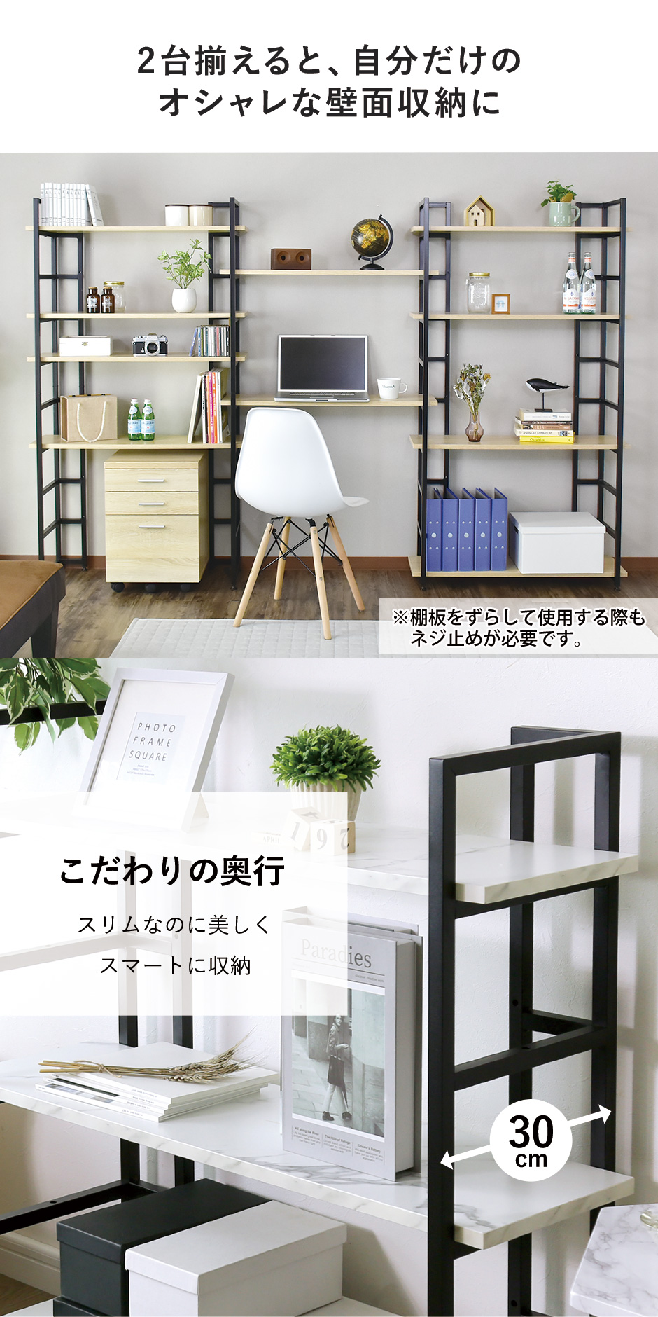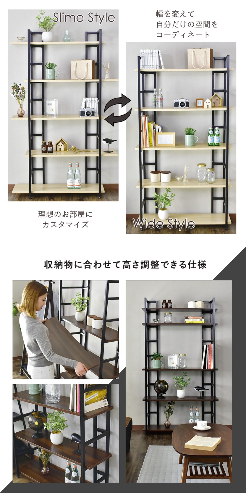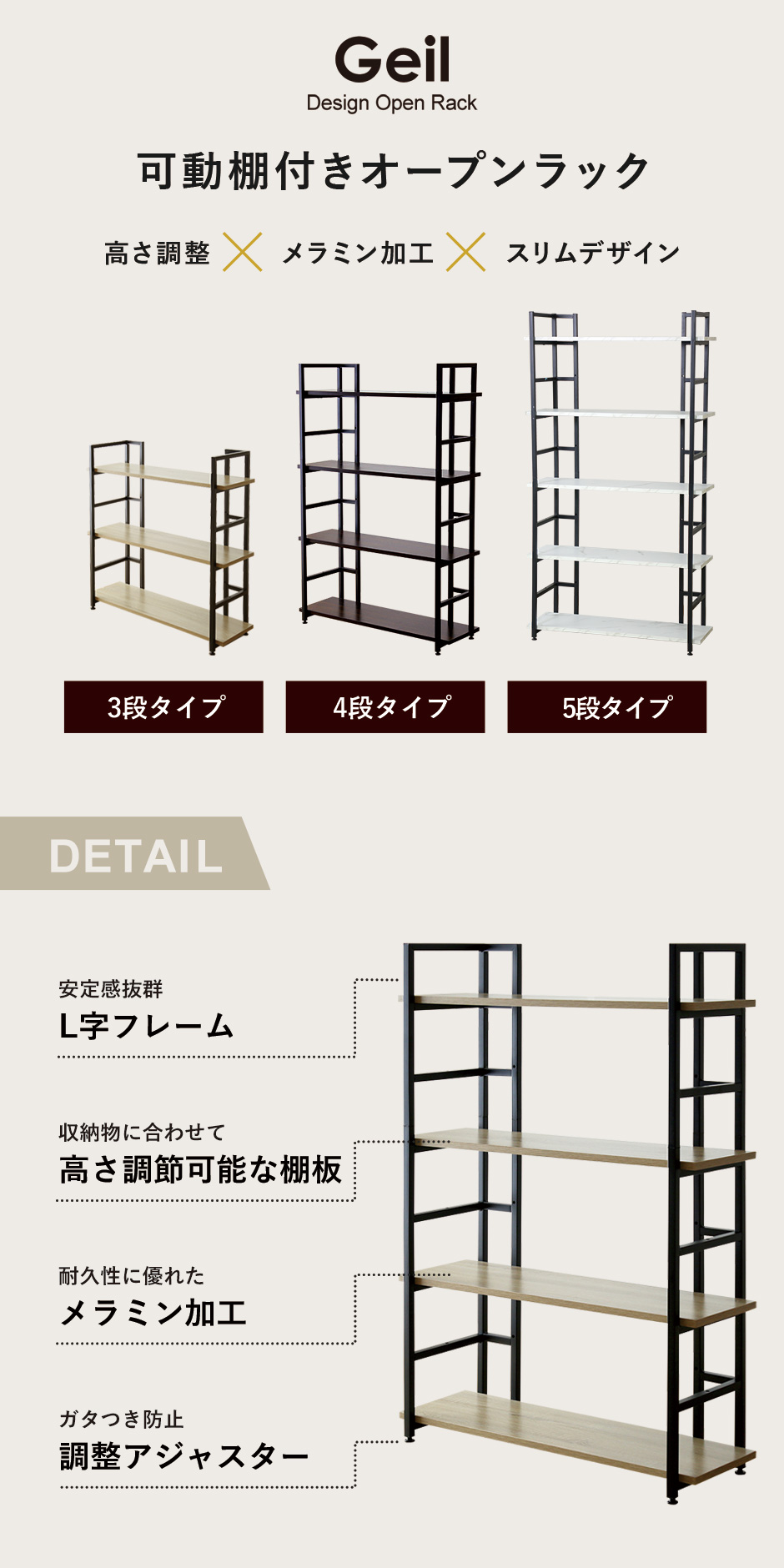 オープンラック Geil【ガイル】| 商品特徴| スリムとワイドに幅を変えられる | オープンラック Geil【ガイル】は、お部屋のレイアウトや用途に応じて、スリムにもワイドにも幅を調整できる画期的な収納ラック。コンパクトな空間でも圧迫感なく使えるスリム設計から、大容量収納が叶うワイド仕様まで、ライフスタイルに合わせて自由自在にカスタマイズできます。リビングや書斎ではディスプレイラックとして、お気に入りの本やインテリア雑貨をおしゃれに収納。キッチンでは調理器具や食品ストックをスッキリまとめて、機能的な収納スペースを実現。限られたスペースを最大限に活用できる設計で、どんなお部屋にもマッチする万能ラックです。 |
