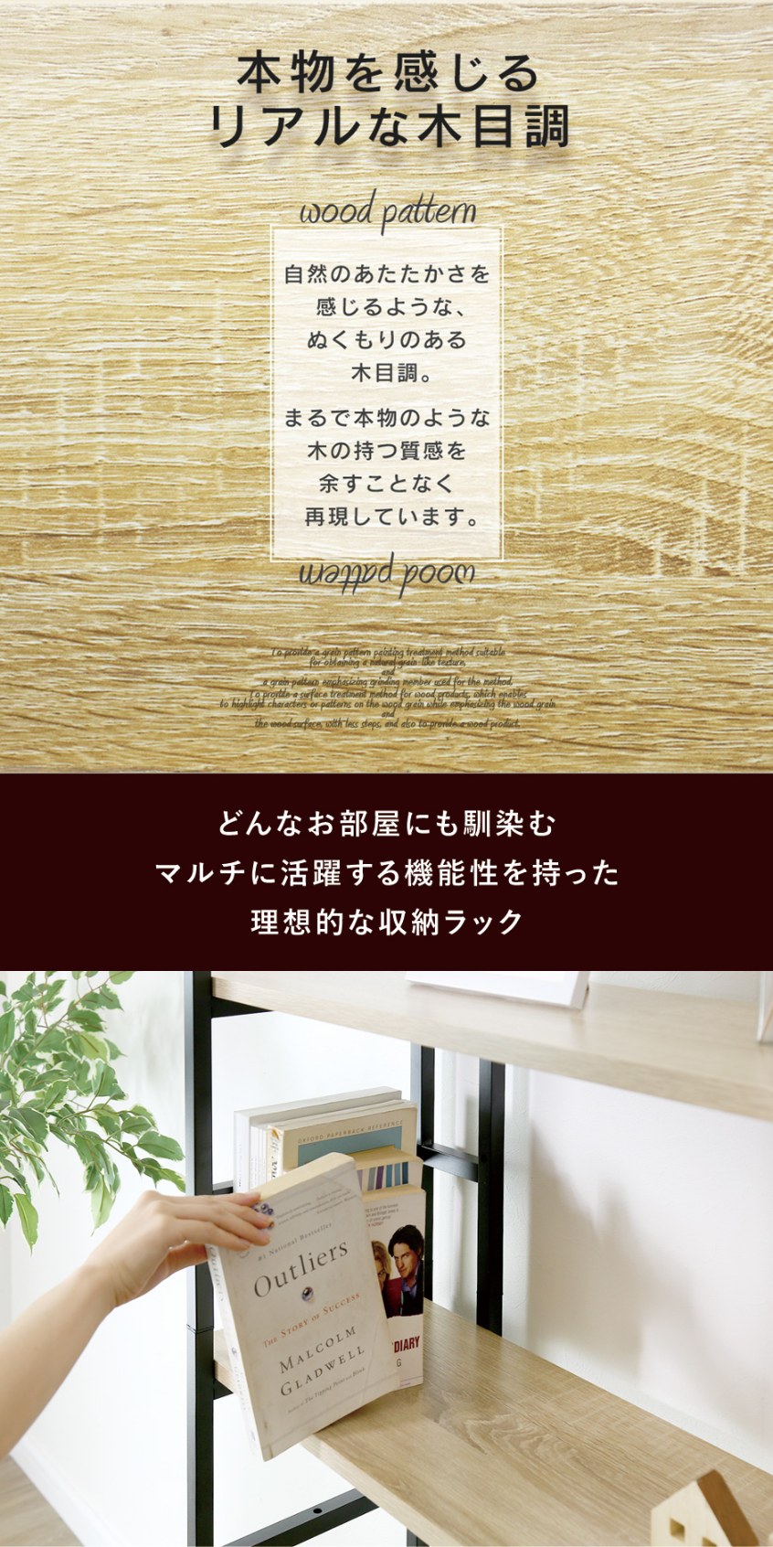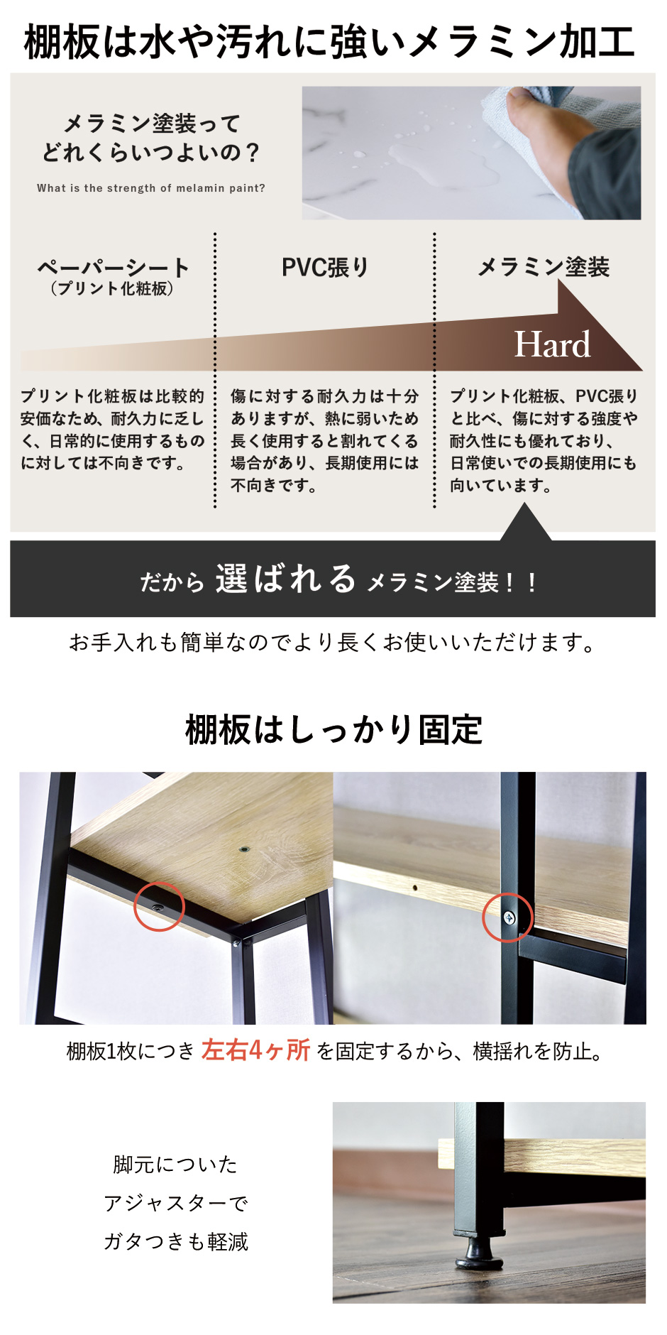 | 棚板は水や汚れに強いメラミン加工 | 棚板には水や汚れに強いメラミン加工を施しており、お手入れが簡単で清潔に保てるのが特徴。飲み物をこぼしてしまったり、調味料が飛び散ったりしても、サッと拭くだけで綺麗に。耐久性にも優れており、キズや摩擦にも強いため、長く美しい状態をキープできます。キッチンやリビングなど、汚れがつきやすい場所でも安心して使用可能。高級感のある木目調デザインと実用性を兼ね備えた、使い勝手の良い収納ラックです。シンプルで機能的なオープンラック Geil【ガイル】で、理想の収納スペースを作りませんか? |