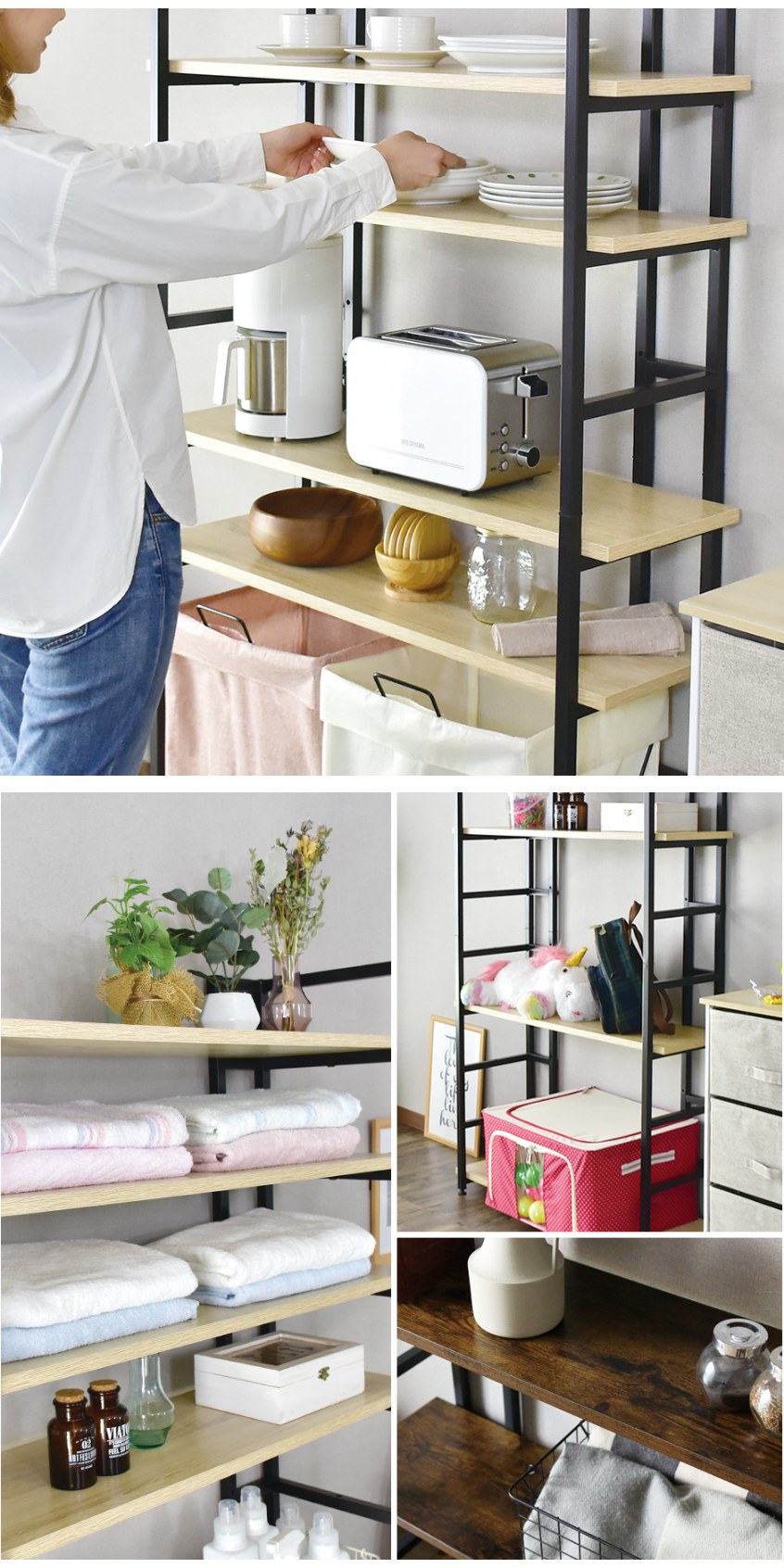 | 9段階の高さ調整可能 | 棚板は9段階の高さ調整が可能で、収納するアイテムのサイズに合わせて自由にカスタマイズできます。大きな本やファイル、収納ボックスもスッキリ収納でき、小物から大型アイテムまで幅広く対応。また、高さ調整ができることで、ライフスタイルの変化に合わせた使い方が可能。子どもが成長するにつれて、収納するものが変わっても、柔軟に対応できるので長く愛用できます。使い勝手の良さと収納力を兼ね備えた理想のラックです。 |
