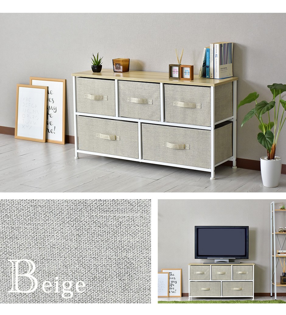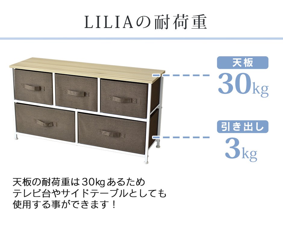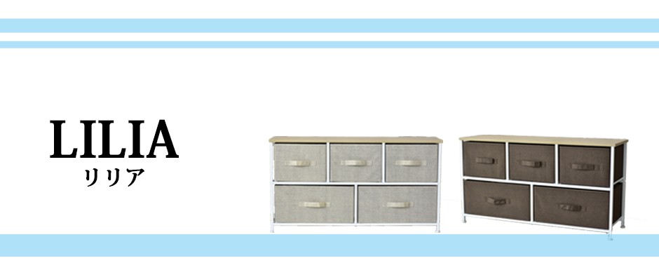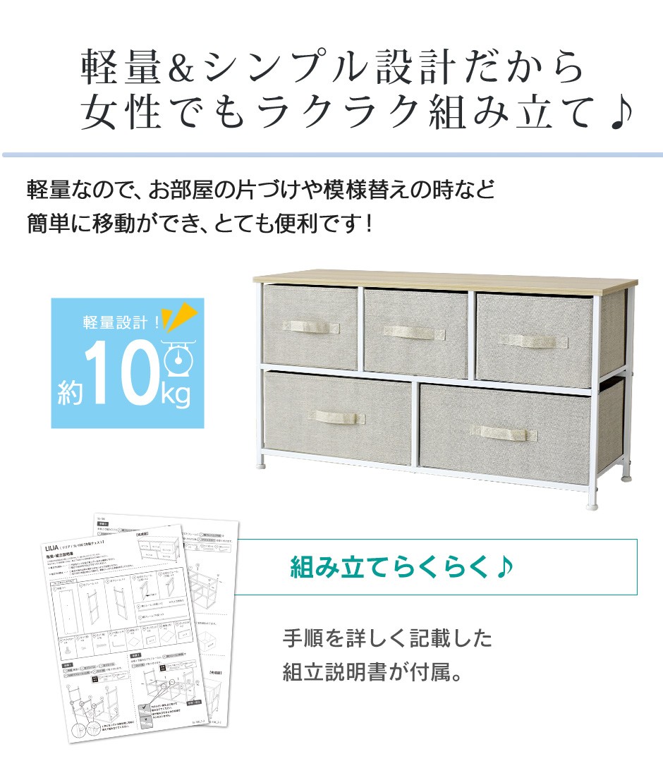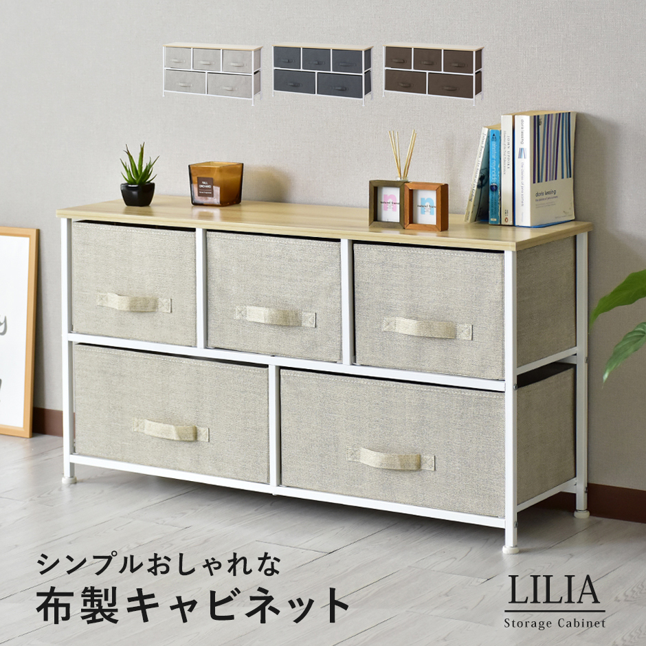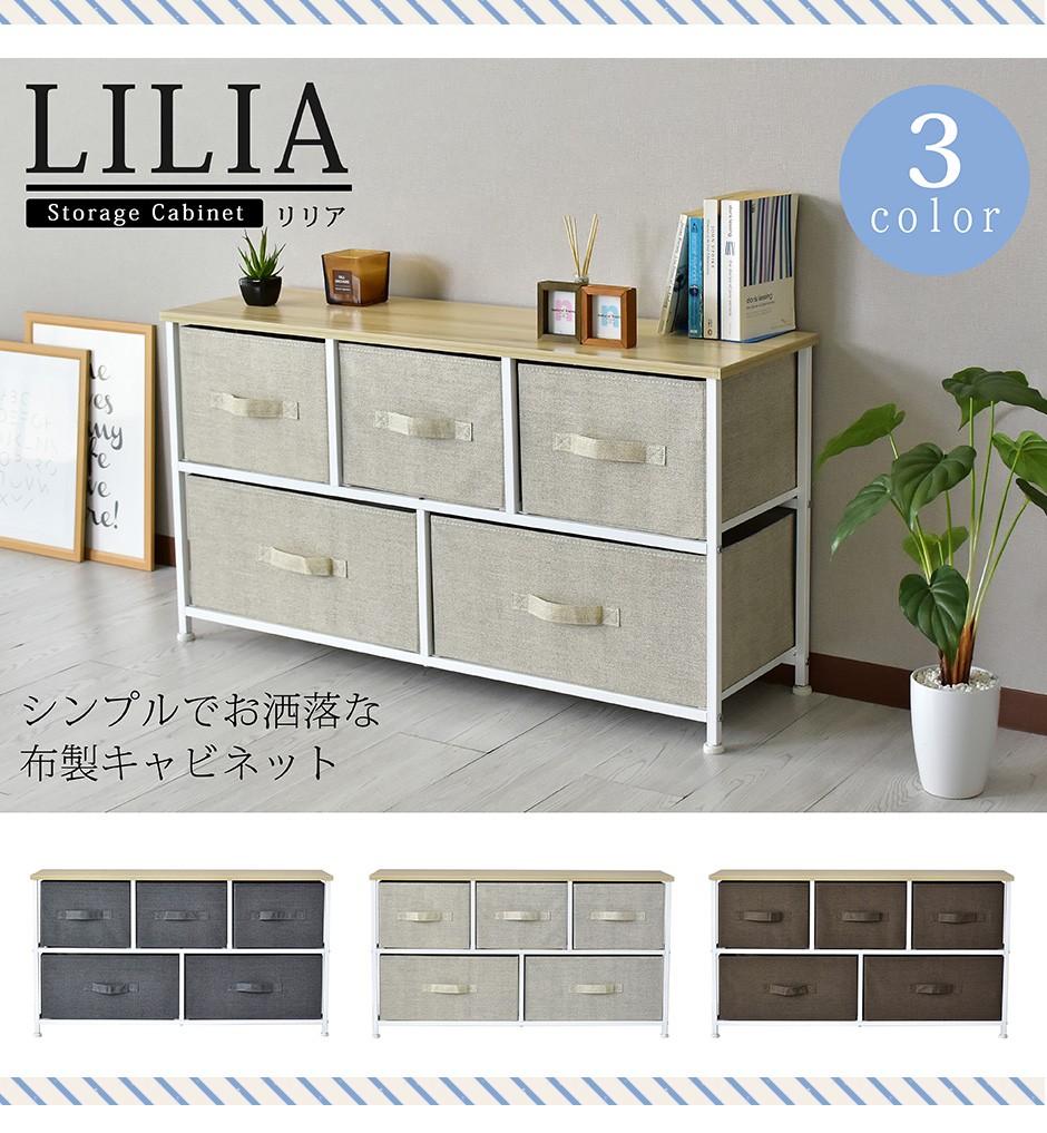 | 布地の収納ボックス5杯付きで、大容量&取り出しやすさ抜群 | リリア(収納)【Lilia】は、布地の収納ボックスが5杯付いた、コンパクトでありながら大容量の収納家具です。幅100cm、奥行30cm、高さ55cmというスリムなデザインで、省スペースながらも収納力は抜群です。この5つの布地引き出しは、それぞれがしっかりとした作りで、日用品や衣類、雑貨などさまざまなものを収納できる点が特長です。また、軽量な引き出し構造になっているため、スムーズに取り出すことができ、使いやすさにも優れています。引き出し自体が布製であるため、使用時の音も静かで、家族の生活空間を邪魔することなく快適に使用できる点も嬉しいポイントです。例えば、リビングや寝室、クローゼットの整理整頓に最適で、靴下や下着、タオルなどの小物を分けて収納することができます。 |