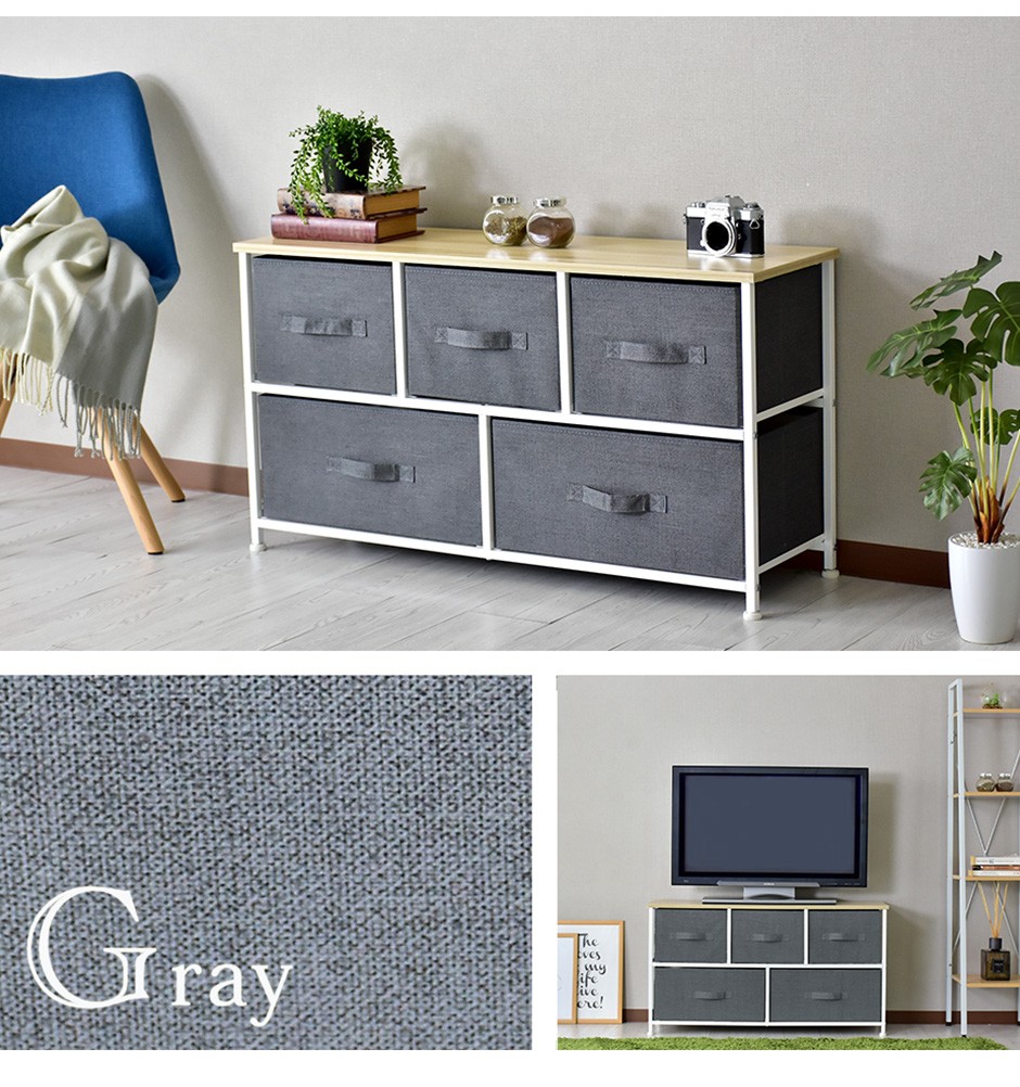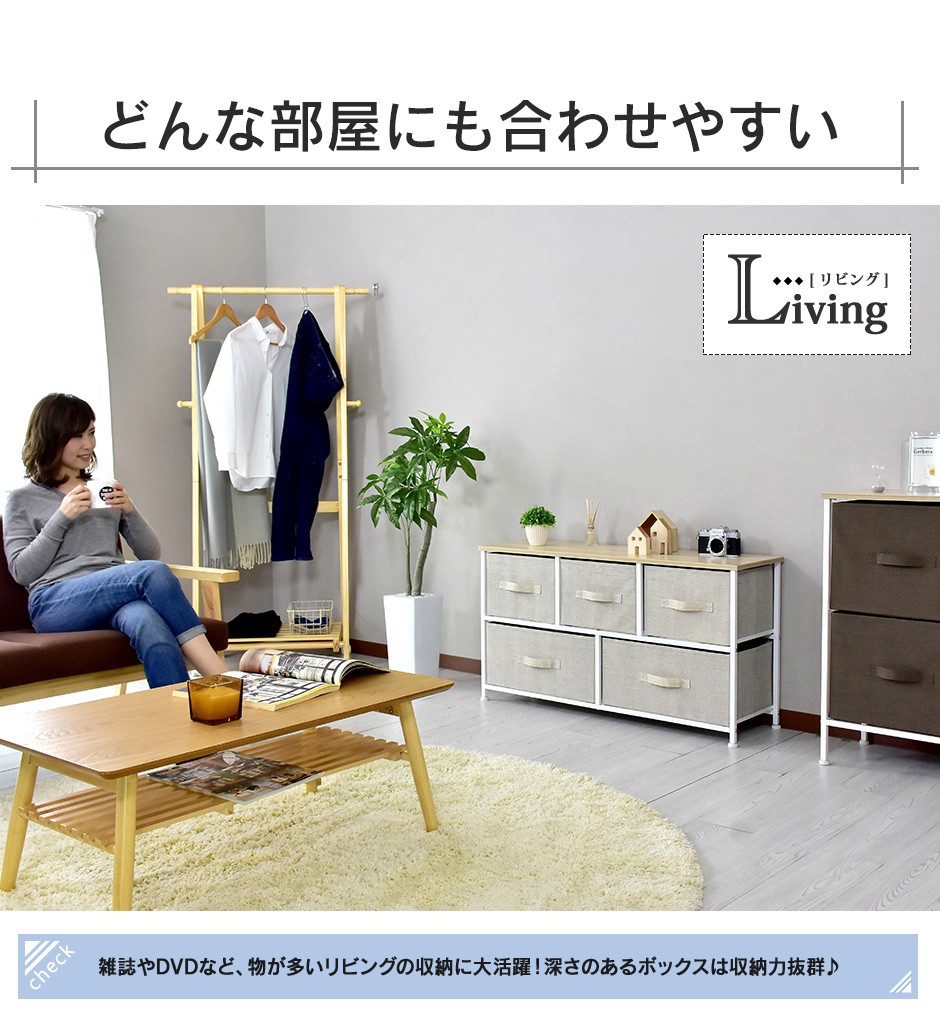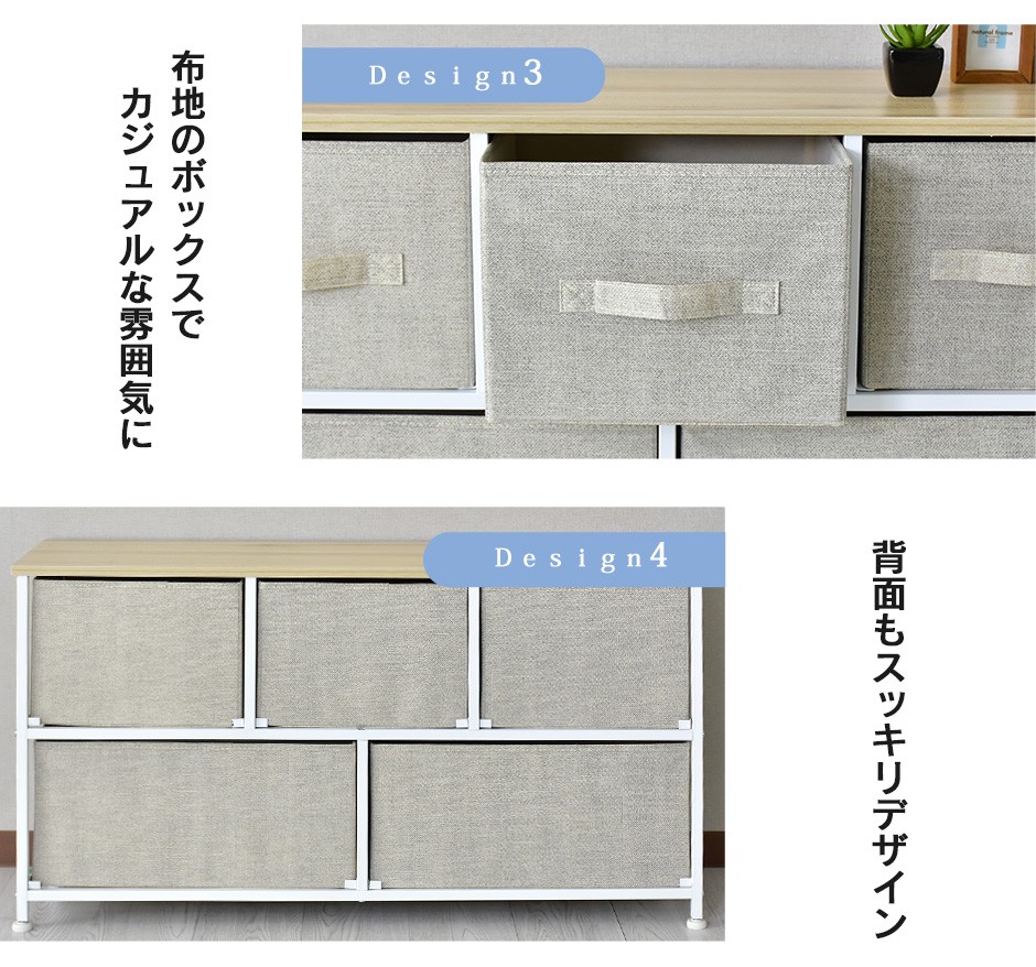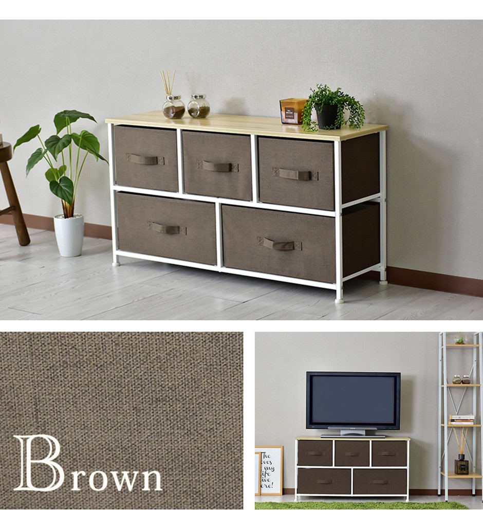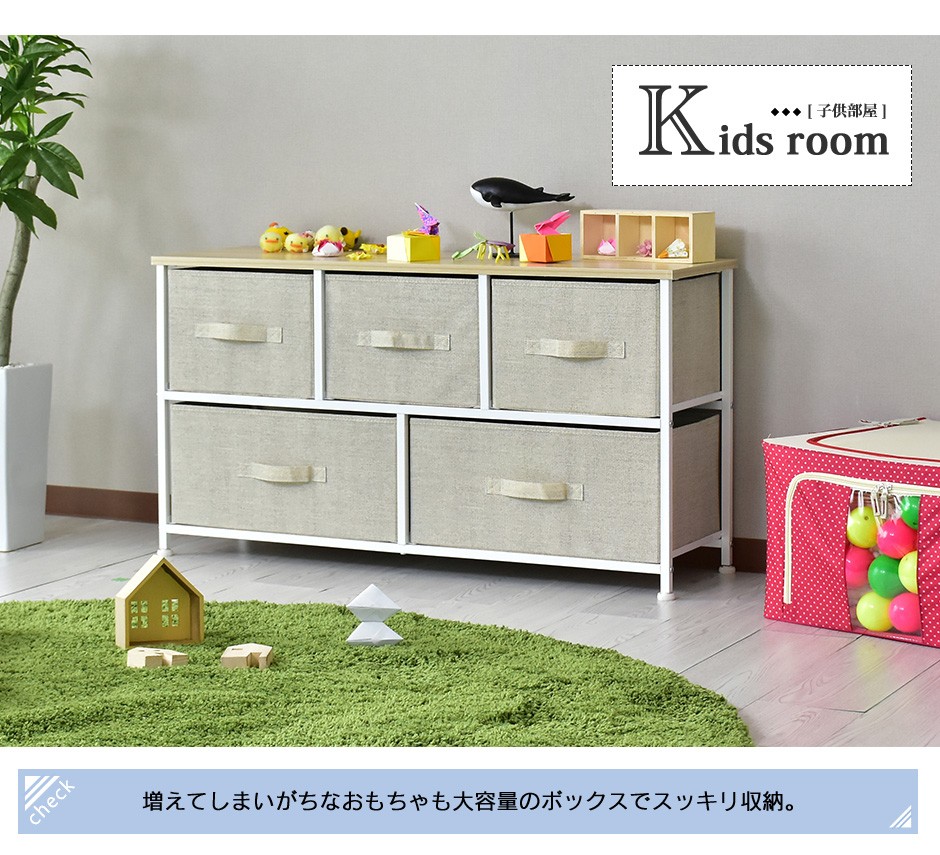| 布地の収納ボックス5杯付きで、大容量&取り出しやすさ抜群 | リリア(収納)【Lilia】は、布地の収納ボックスが5杯付いた、コンパクトでありながら大容量の収納家具です。幅100cm、奥行30cm、高さ55cmというスリムなデザインで、省スペースながらも収納力は抜群です。この5つの布地引き出しは、それぞれがしっかりとした作りで、日用品や衣類、雑貨などさまざまなものを収納できる点が特長です。また、軽量な引き出し構造になっているため、スムーズに取り出すことができ、使いやすさにも優れています。引き出し自体が布製であるため、使用時の音も静かで、家族の生活空間を邪魔することなく快適に使用できる点も嬉しいポイントです。例えば、リビングや寝室、クローゼットの整理整頓に最適で、靴下や下着、タオルなどの小物を分けて収納することができます。 |