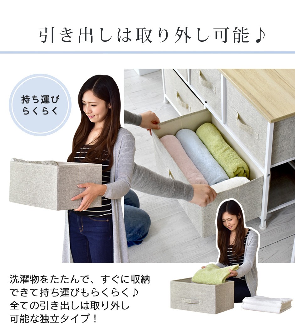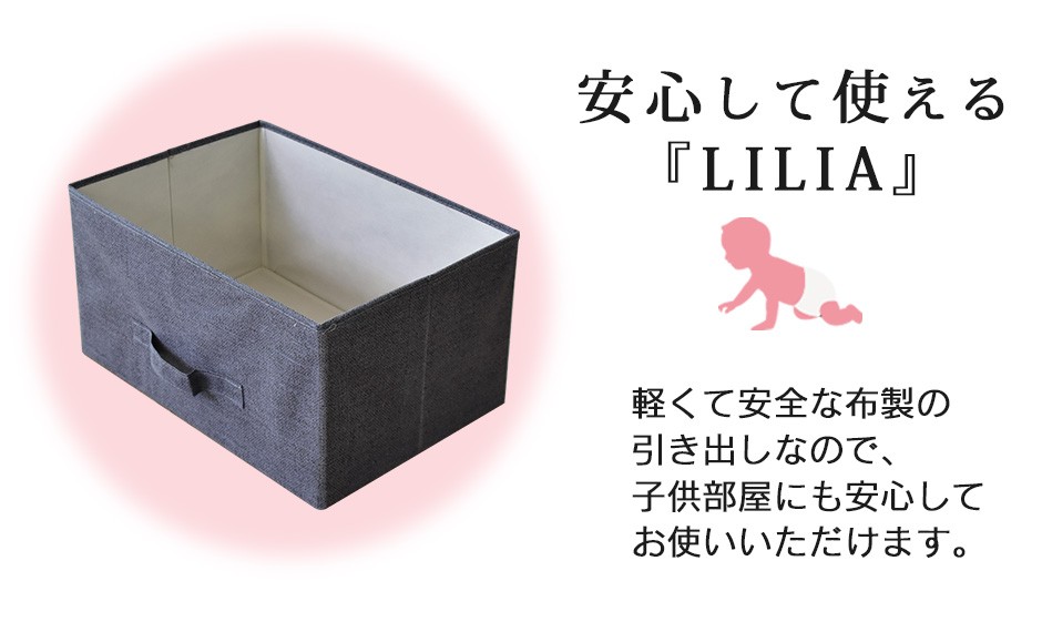 | 衣類収納やおむつ収納など、さまざまな使い方が可能な多用途デザイン | リリア(収納)【Lilia】は、そのシンプルで機能的なデザインから、さまざまな使い方ができる多用途な収納家具です。5杯の布地引き出しは、衣類の収納に最適で、靴下や下着、タオルなどを分類して整理するのに便利です。特に、子供部屋では、おむつやベビーグッズを整理整頓するための収納としても活躍します。軽量で取り外し可能な引き出しは、お子様でも簡単に使えるため、自分で片付ける習慣をつけるのにも役立ちます。また、リビングルームや寝室、クローゼット内での日用品の収納にも最適です。シンプルなデザインでどんなインテリアにも合わせやすく、使う場所を選びません。 |