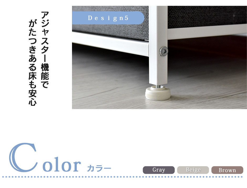 | ぐらつきを防止するアジャスター付き脚で安定感抜群 | リリア(収納)【Lilia】は、アジャスター付き脚を採用しており、安定感のある設置が可能です。アジャスターは、設置場所の床の凹凸や傾斜を調整するために使用でき、家具のぐらつきを防止します。特に、フローリングやカーペットの上に設置する際に、しっかりと水平を保つことができるため、安心して使用することができます。ぐらつきがないことで、引き出しを開閉する際にもストレスを感じることがなく、日常の使用がより快適になります。また、アジャスター付きの脚は、床に優しい設計になっており、傷がつきにくい点も嬉しいポイントです。さらに、アジャスターは簡単に調整できるため、設置場所を変更する際にも便利です。 |
