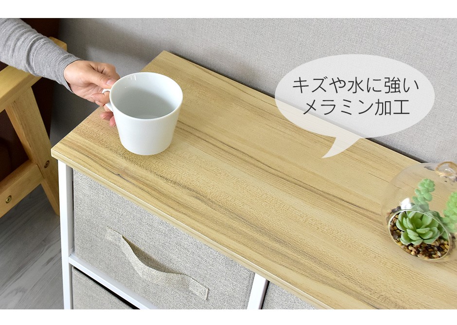 | メラミン加工の天板で傷や汚れに強く、ディスプレイ棚としても活用可能 | リリア(収納)【Lilia】は、天板がメラミン加工されており、日常の使用において傷や汚れに強い設計が施されています。メラミン加工は、耐熱性や耐水性に優れているため、普段使いの家具として安心して使用することができます。例えば、上に飲み物を置いても染み込む心配がなく、キッチンやダイニングでの使用にも適しています。また、手入れも簡単で、汚れがついてもさっと拭くだけで清潔な状態を保つことができる点も魅力です。さらに、この天板はディスプレイ棚としても活用でき、写真立てや観葉植物、小物をおしゃれに飾ることができます。収納家具としての機能だけでなく、インテリアの一部としても存在感を発揮するデザイン性が高い製品です。 |