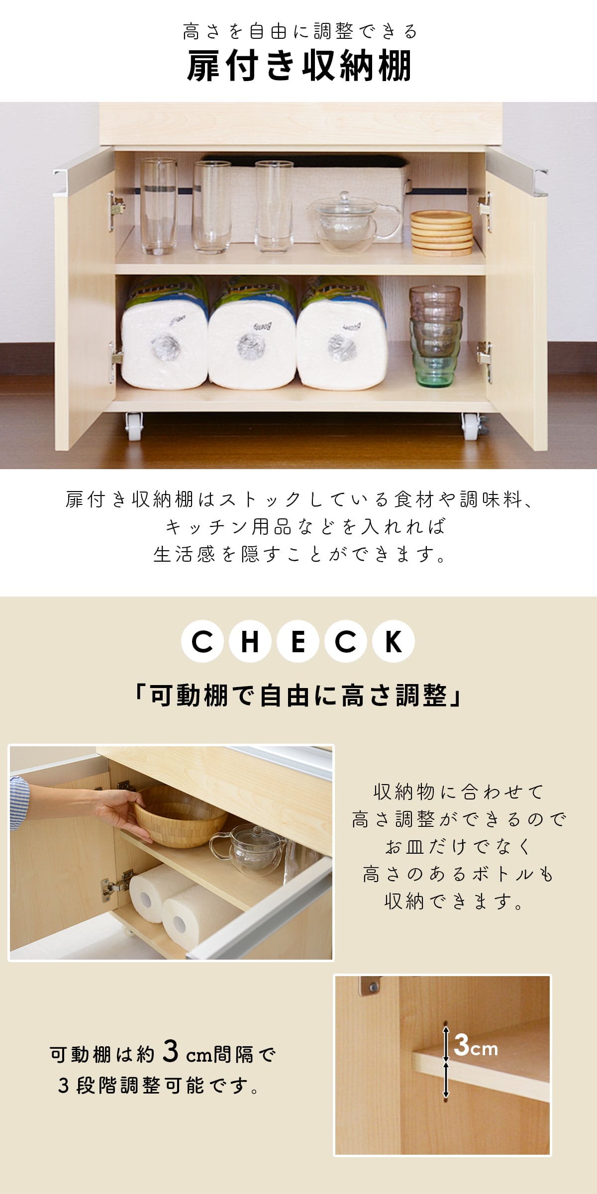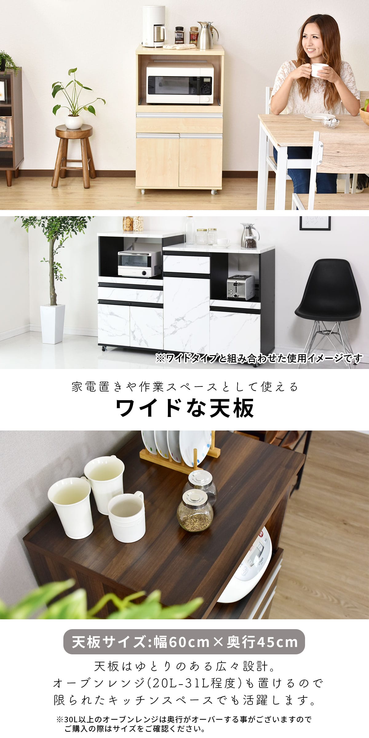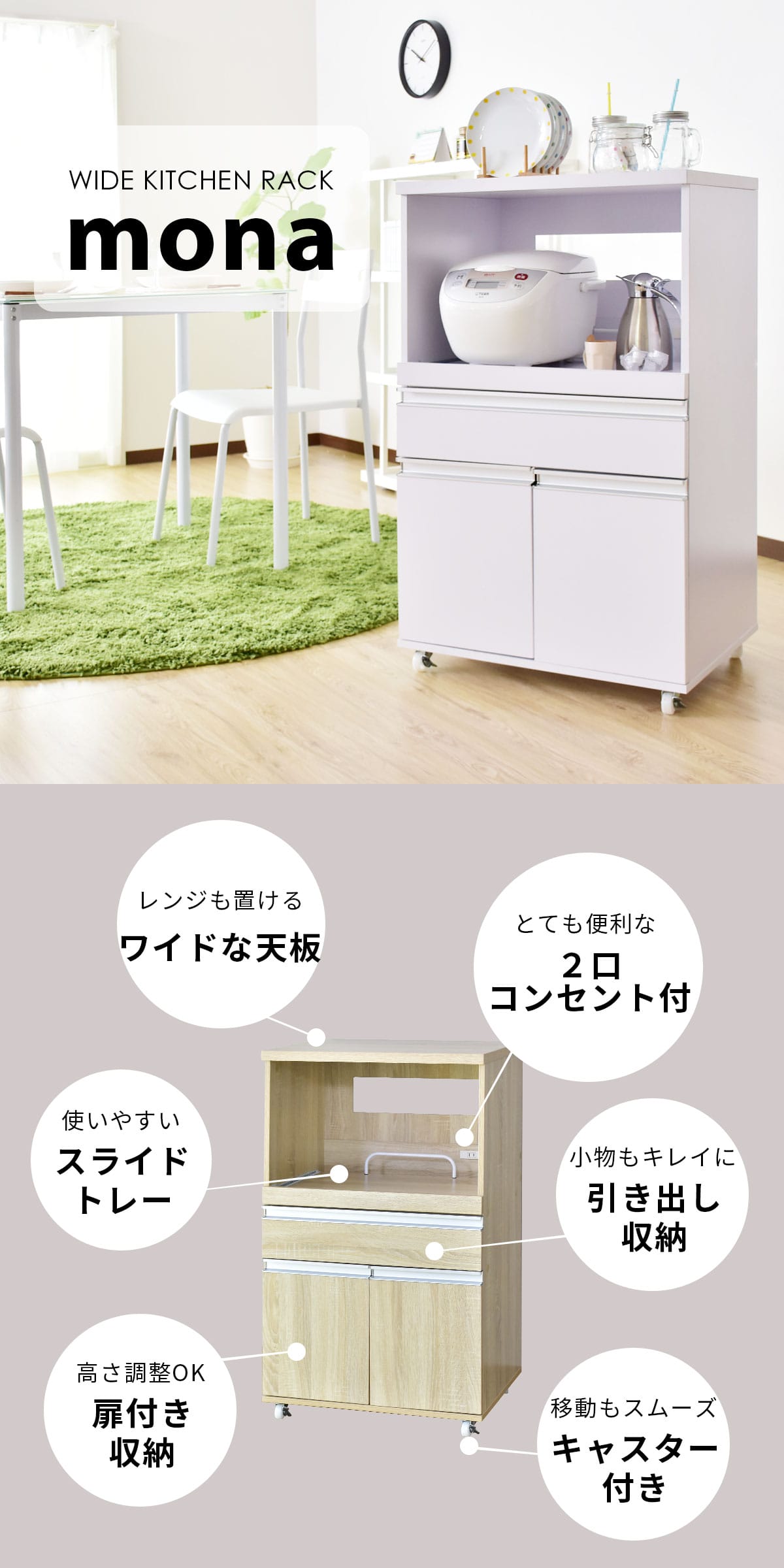 \ こちらの収納アイテムもおすすめ! / キッチンラック モナ【Mona】| 商品特徴| レンジも置けるワイドな天板 | キッチンラック「モナ【Mona】」は、幅60cm×奥行45cmの広々とした天板を採用。電子レンジやトースターなどの調理家電をしっかり置けるだけでなく、食材の一時置きスペースとしても便利です。さらに、メラミン加工が施された天板は、水や汚れに強く、お手入れも簡単。調理中に飛び散った油や調味料もサッと拭くだけで清潔に保てます。頑丈な設計で、天板の耐荷重は約30kg。大型のレンジや調理器具を置いても安心してお使いいただけます。 |