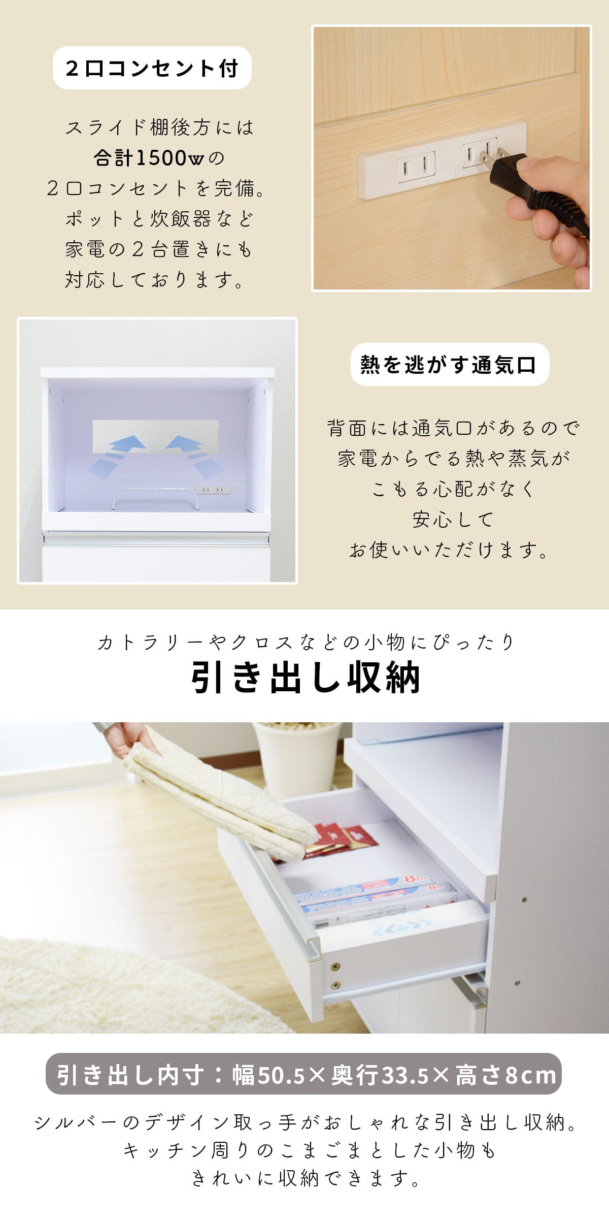 | とても便利な2口コンセント付き | キッチン周りの家電の使い勝手を向上させる2口コンセントを搭載。電子レンジとトースターを同時に使用したり、ミキサーや電気ケトルを簡単に接続できるので、調理の効率がアップします。コンセントのコードは約2mと長めに設計されているため、壁際に配置した際でも無理なくコンセントに接続可能。これ一台でキッチン家電の置き場と電源をしっかり確保できる、機能的なキッチンラックです。 |