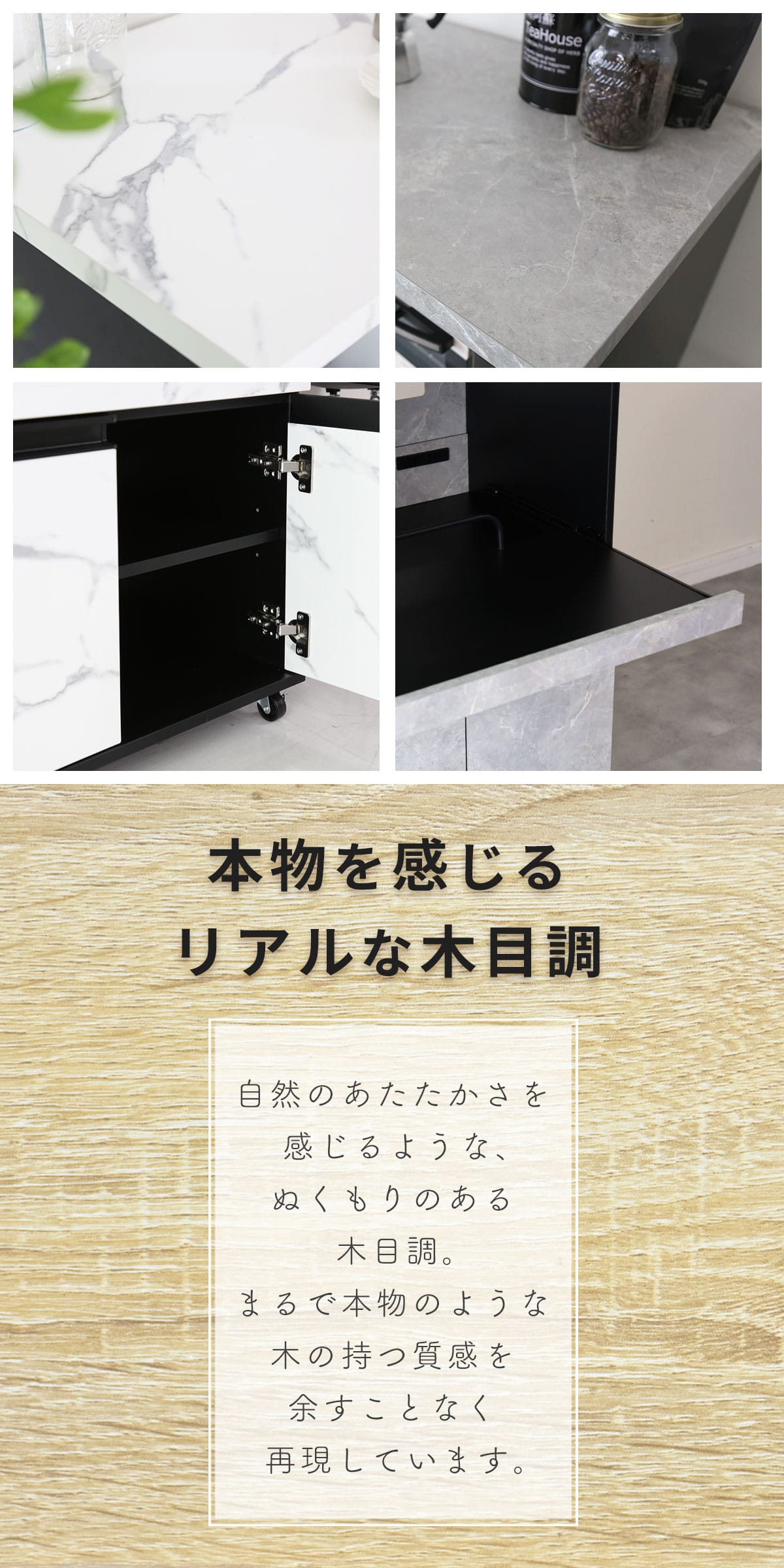 | 小物もきれいに引き出し収納 | 収納力も抜群のキッチンラック「モナ【Mona】」は、調理器具やカトラリーなどの小物をすっきり片付けられる引き出しを搭載。引き出しの耐荷重は約5kgで、スムーズに開閉できるスライドレール仕様。頻繁に使うアイテムを整理整頓して、使いたいときにサッと取り出せる便利な設計です。キッチン周りが散らかりがちな方にもぴったりな収納スペースを確保し、すっきりとした空間を実現します。 |