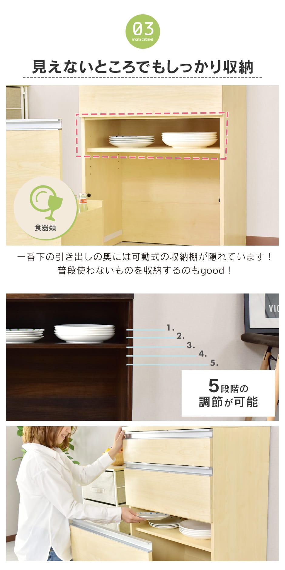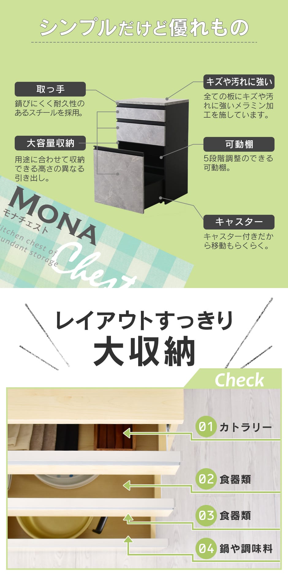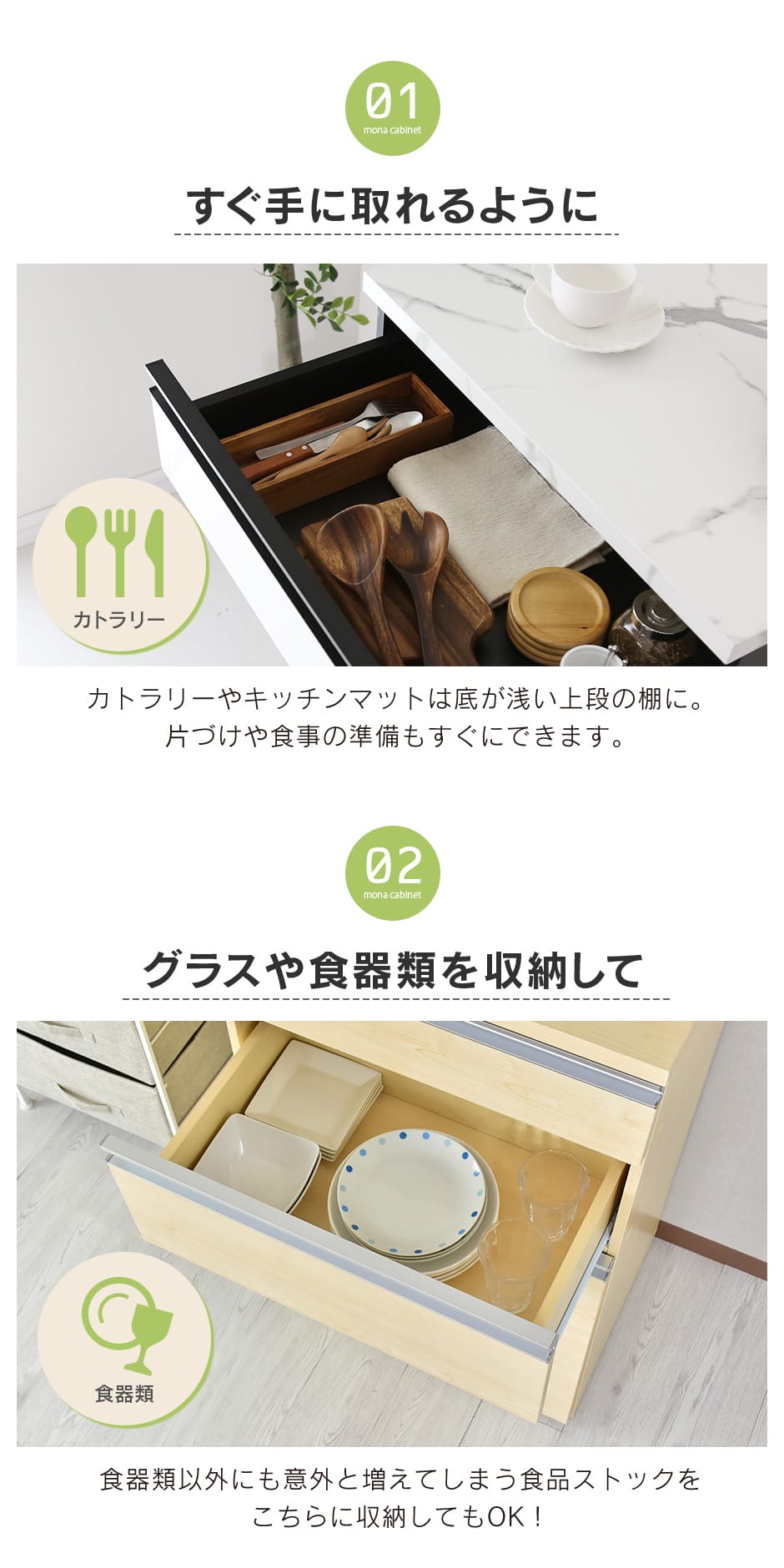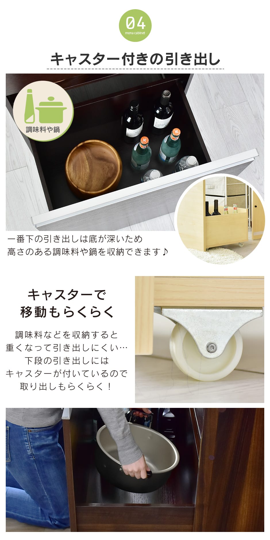 引き出しは3段構造になっており、上段はカトラリー専用の仕切り付き収納、中段はお皿やボウルなどの食器類、下段はボトルや鍋を収納できる広々スペースを確保。さらに、下段の引き出しはキャスター付きで、本体と分離して使えるため自由なレイアウトが可能です。