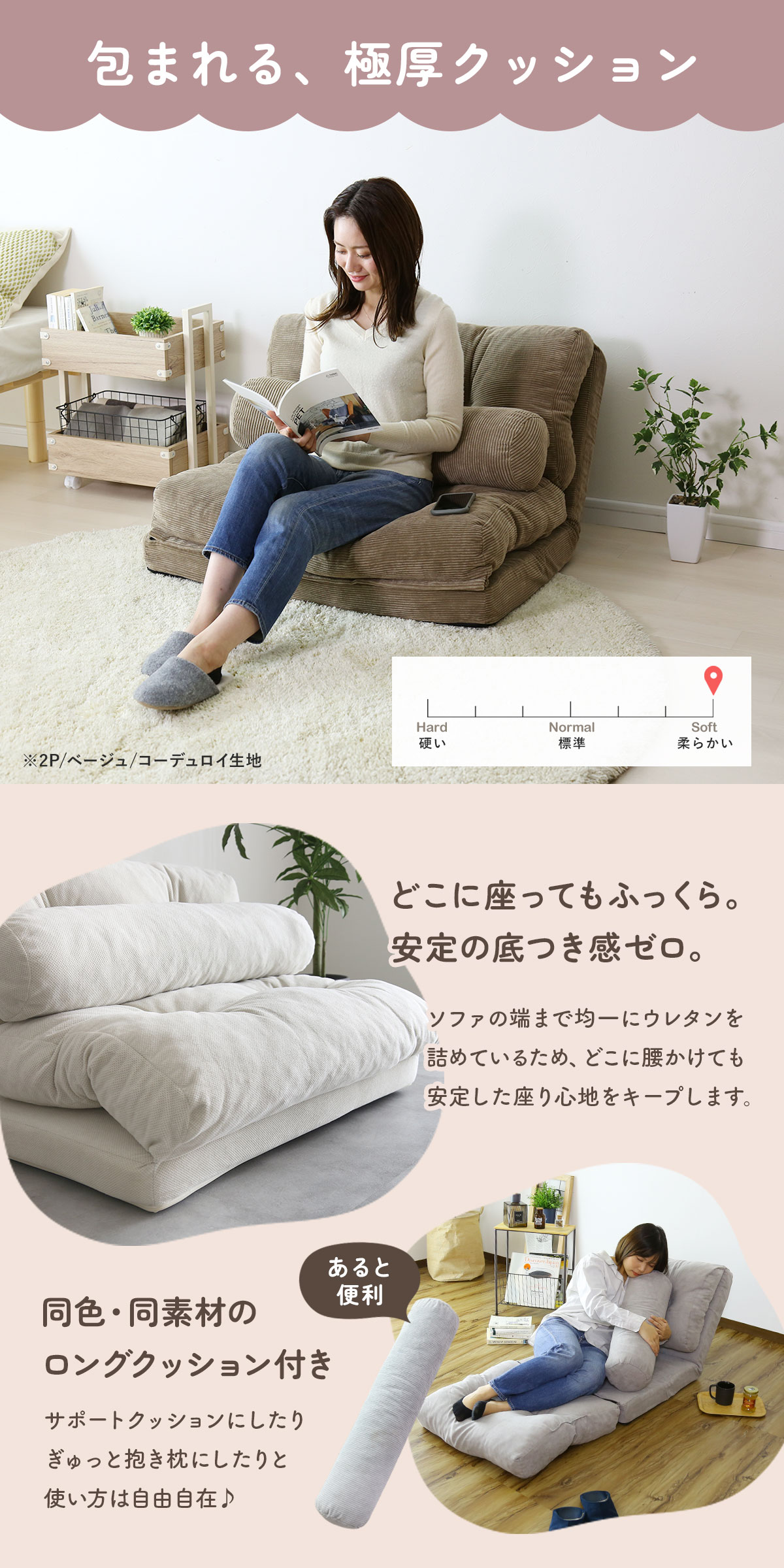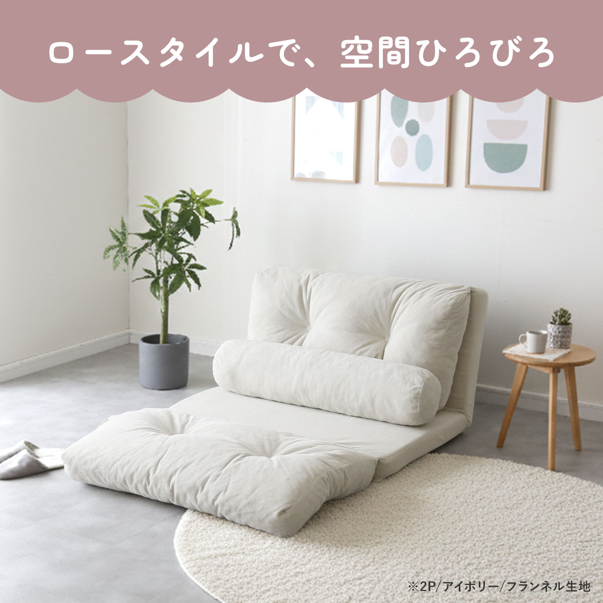 目線が低くなることで開放感が生まれ、床でくつろぐような自然体のスタイルが作れるのもロータイプソファの魅力。圧迫感が少ないためお部屋が広く見え、ワンルームでもすっきりとした印象になります。もちもちのクッションは底つき感を感じにくく、床座りに慣れていない方でも安心。お子さまが座ったり寝転んだりしても快適で、子供部屋用ソファとしてもおすすめです。