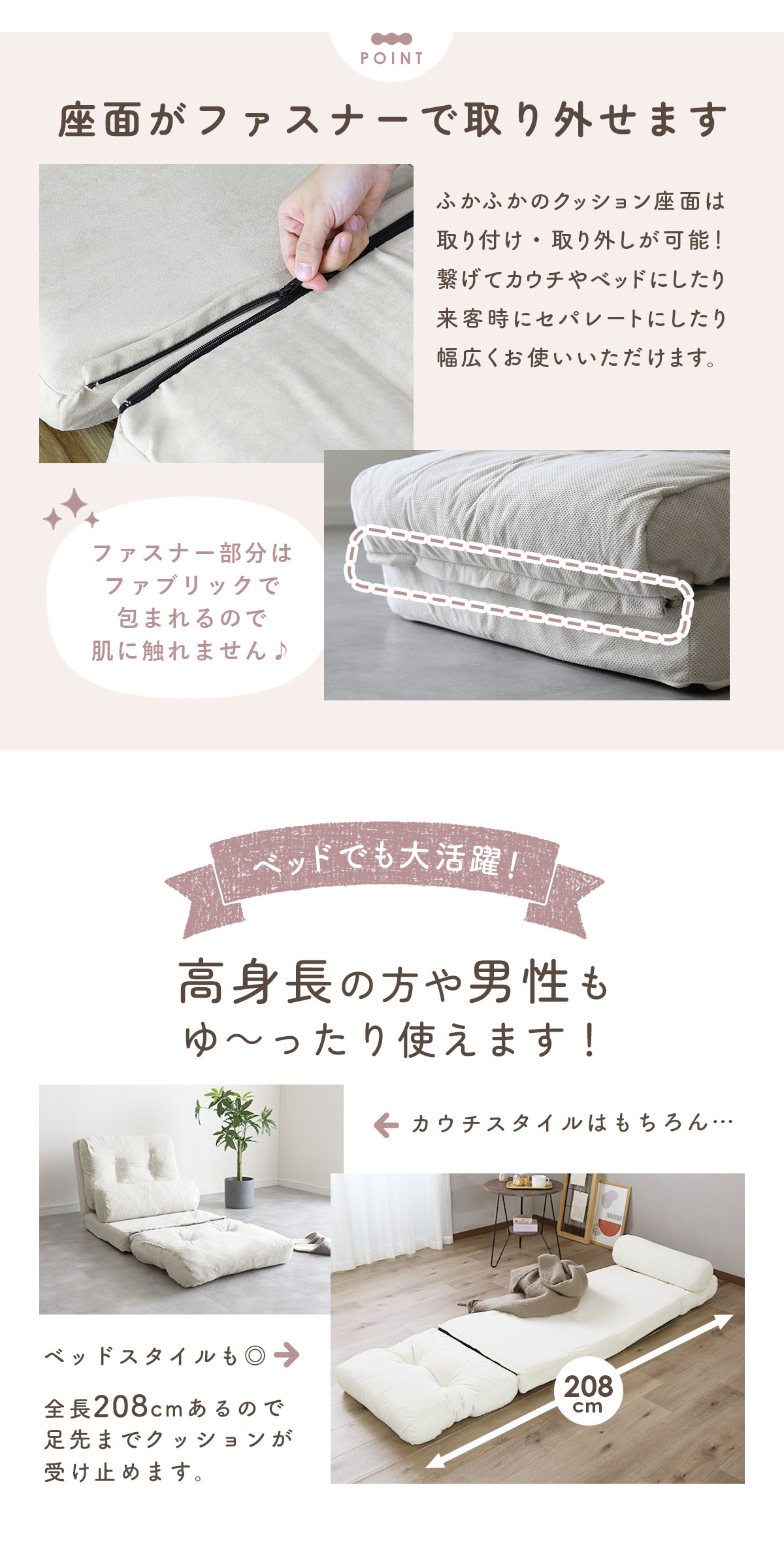 ソファ・ソファベッド・カウチの3way仕様で、使い方は自由自在。ライフスタイルやシーンに合わせて、簡単に形を変えられるのが魅力です。「コンパクトだけど、いろいろ使えるソファが欲しい」という方にぴったりの一台です。