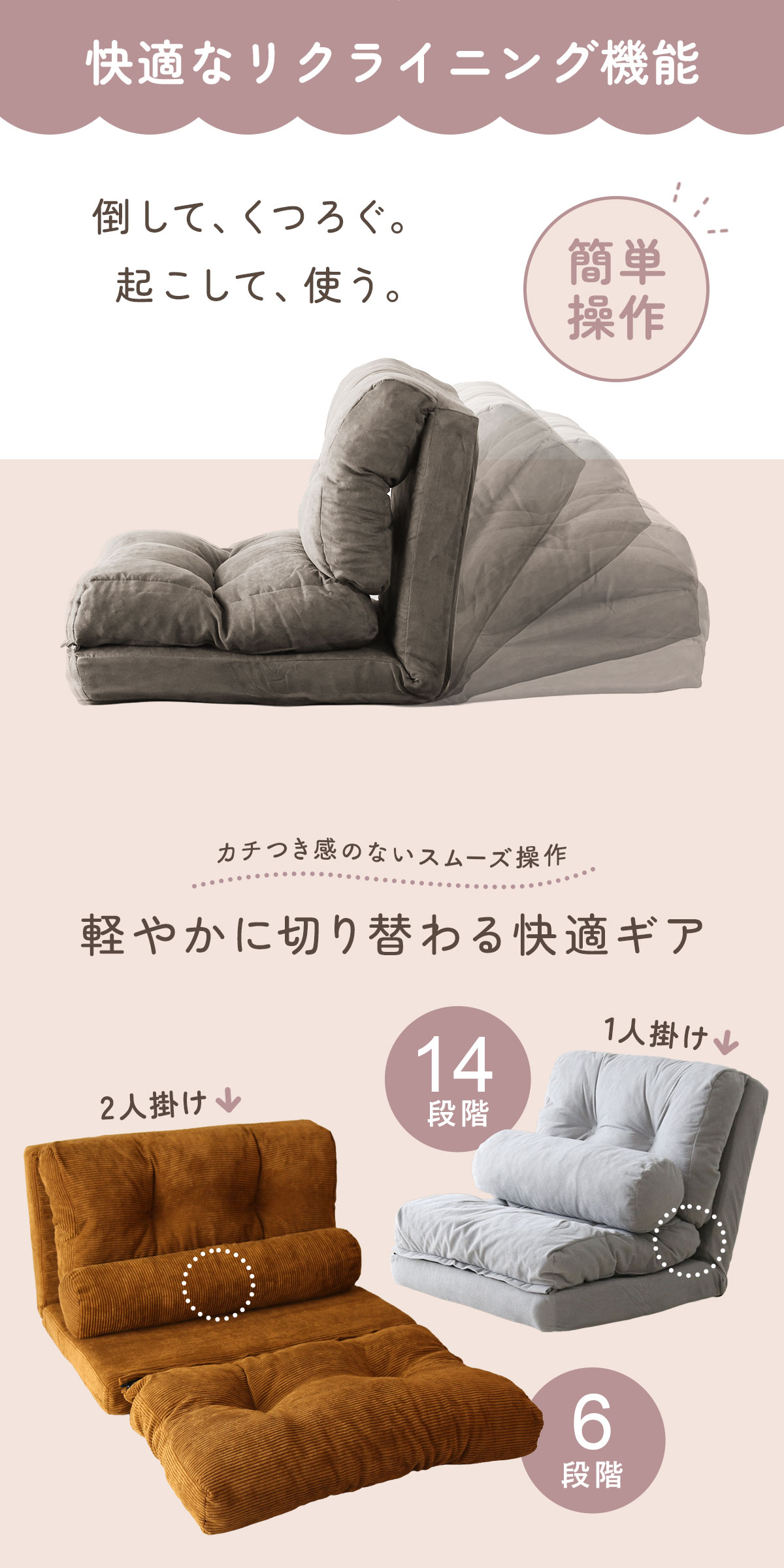 1Pには14段階、2Pには6段階の背もたれリクライニングギアを内蔵。背もたれのリクライニングをすべて倒すとフルフラットになり、横になってくつろいだり、お昼寝したりと用途が一気に広がります。“引っかかりなく切り替えられる滑らかなギア”も使用する上で見逃せないポイント!日常のちょっとした休憩から本格的なリラックスタイムまで、幅広くフィットする快適性能です。来客時の簡易ベッドとしても役立ちます。