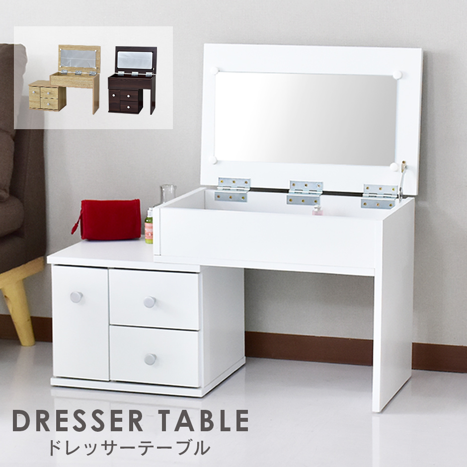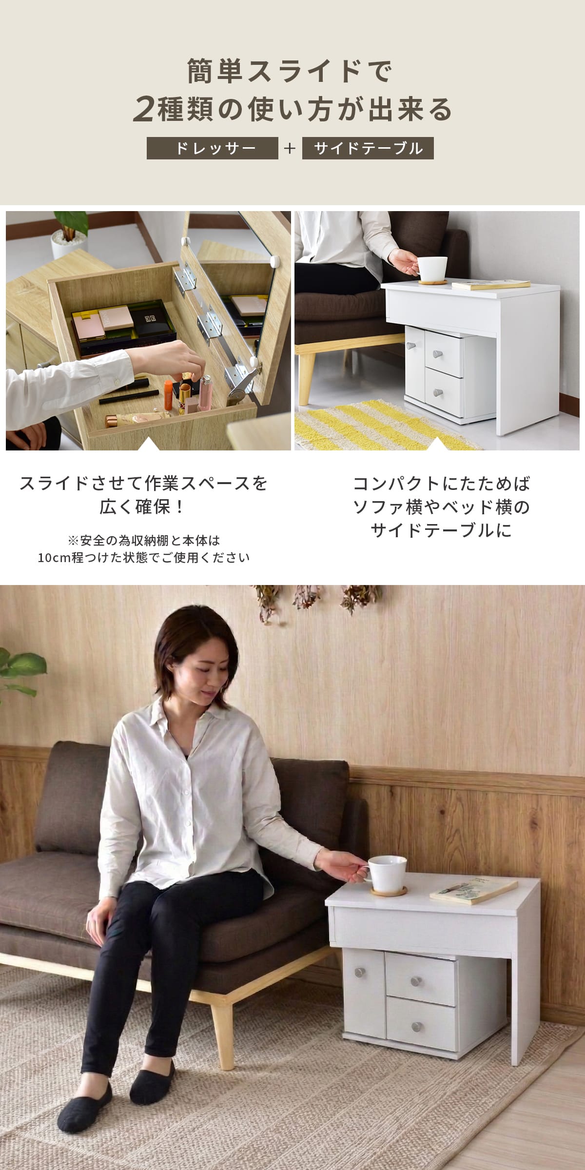 天板を閉じれば、ソファ横に置けるサイドテーブルとしても活躍します。ソファに座ったときにちょうどいい高さ設計で、飲み物やスマートフォン、本などを置くのに便利です。ちょっとした書き物をする座卓として使うことも可能。ドレッサーとしてだけでなく、リビングでも使える多用途なデザインです。