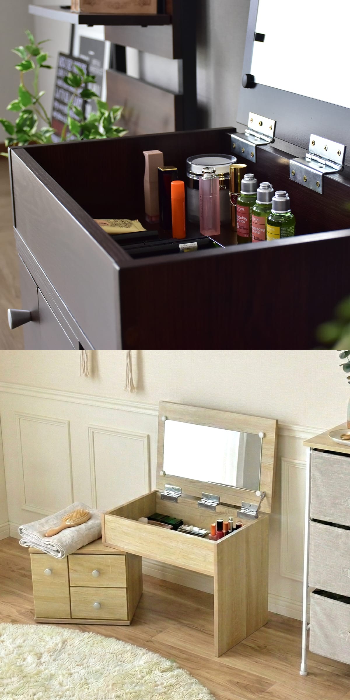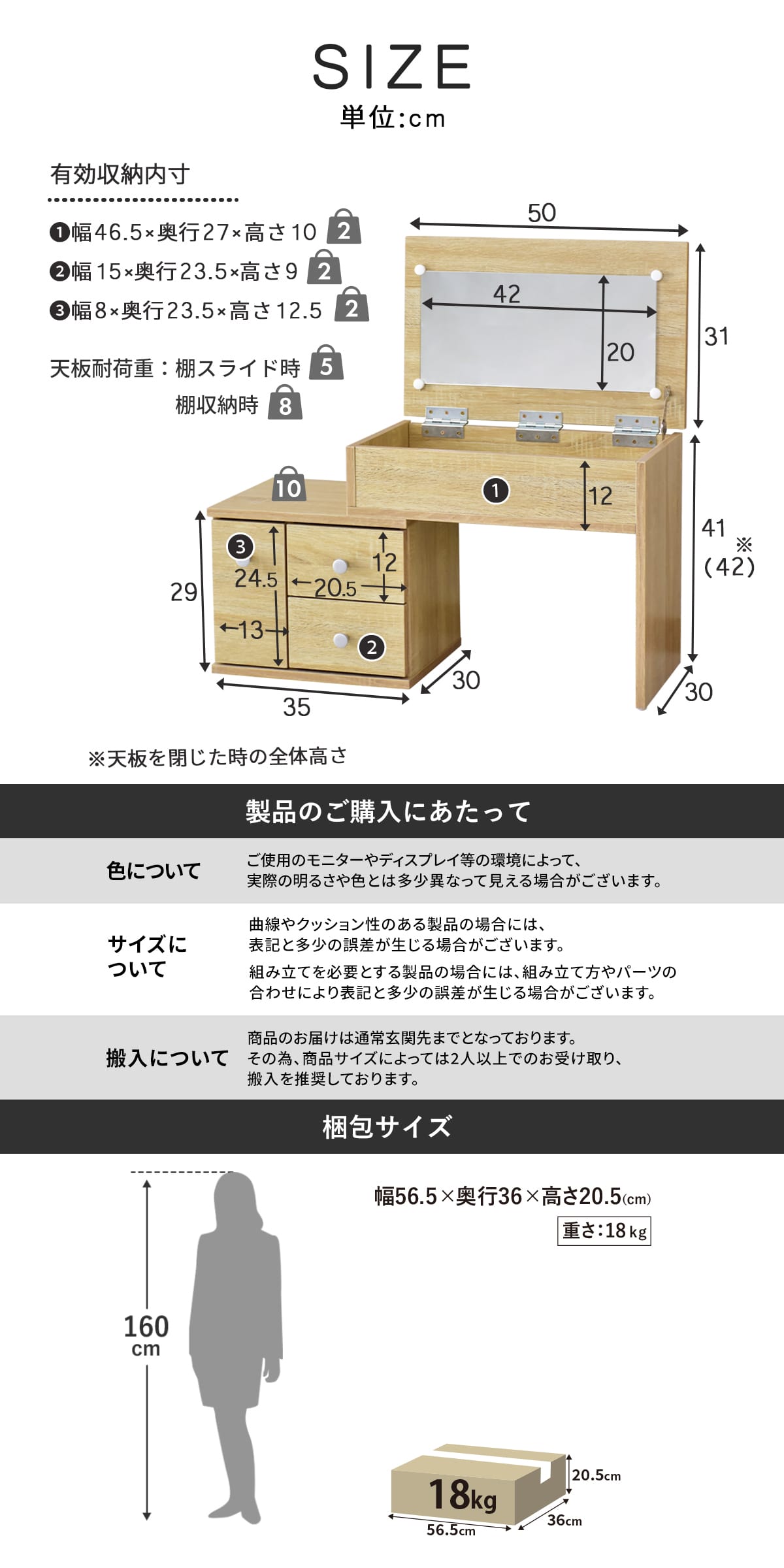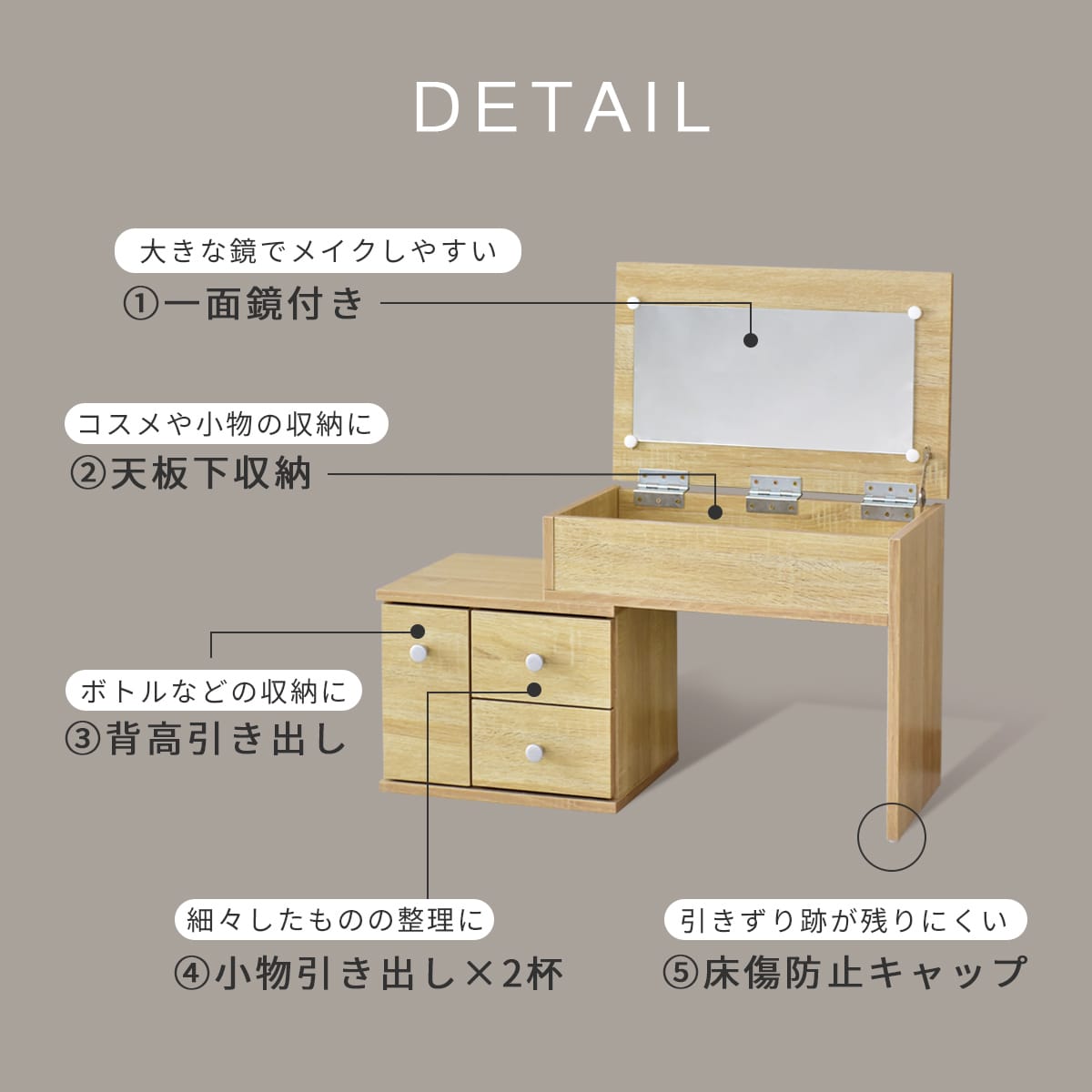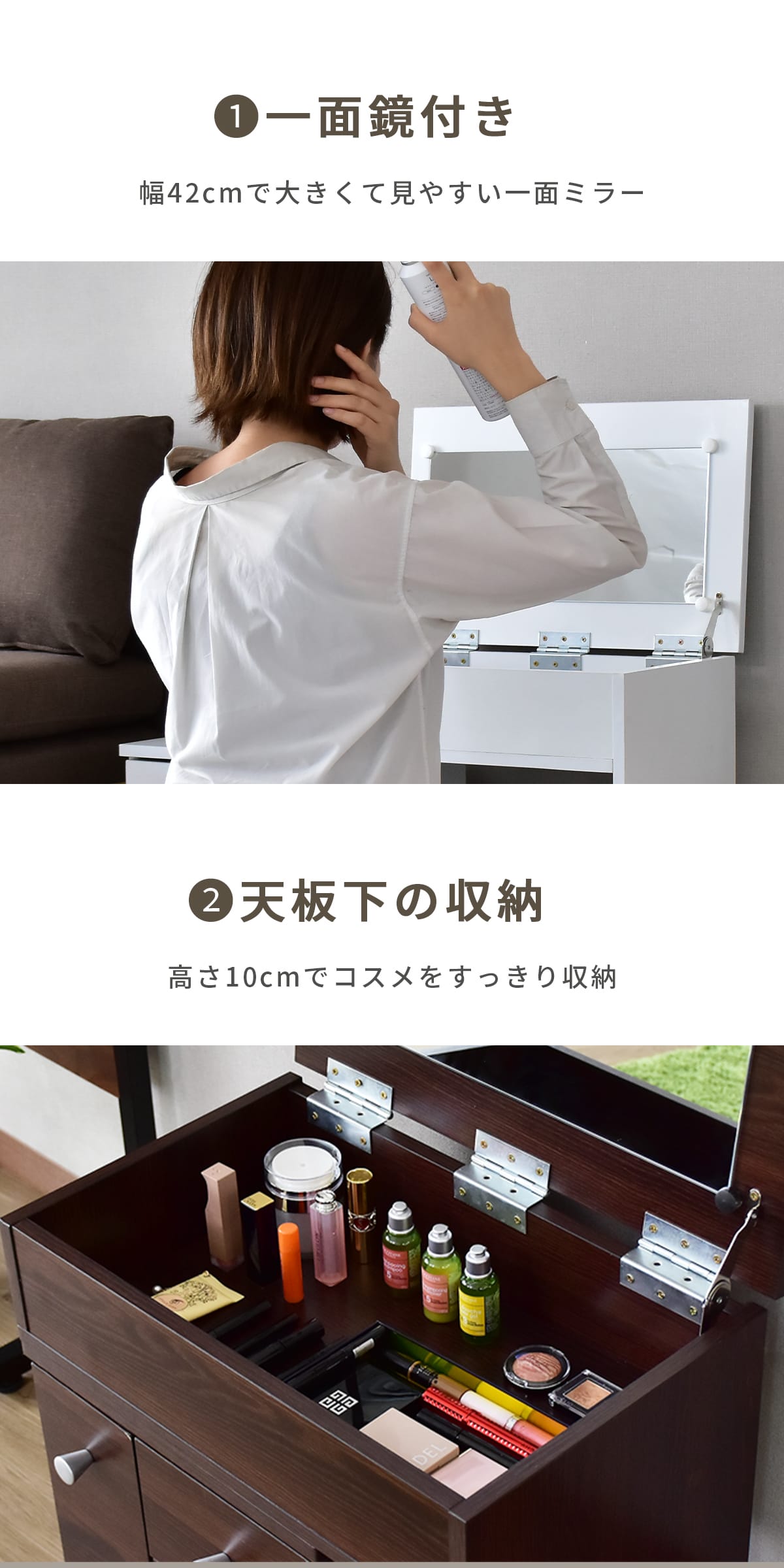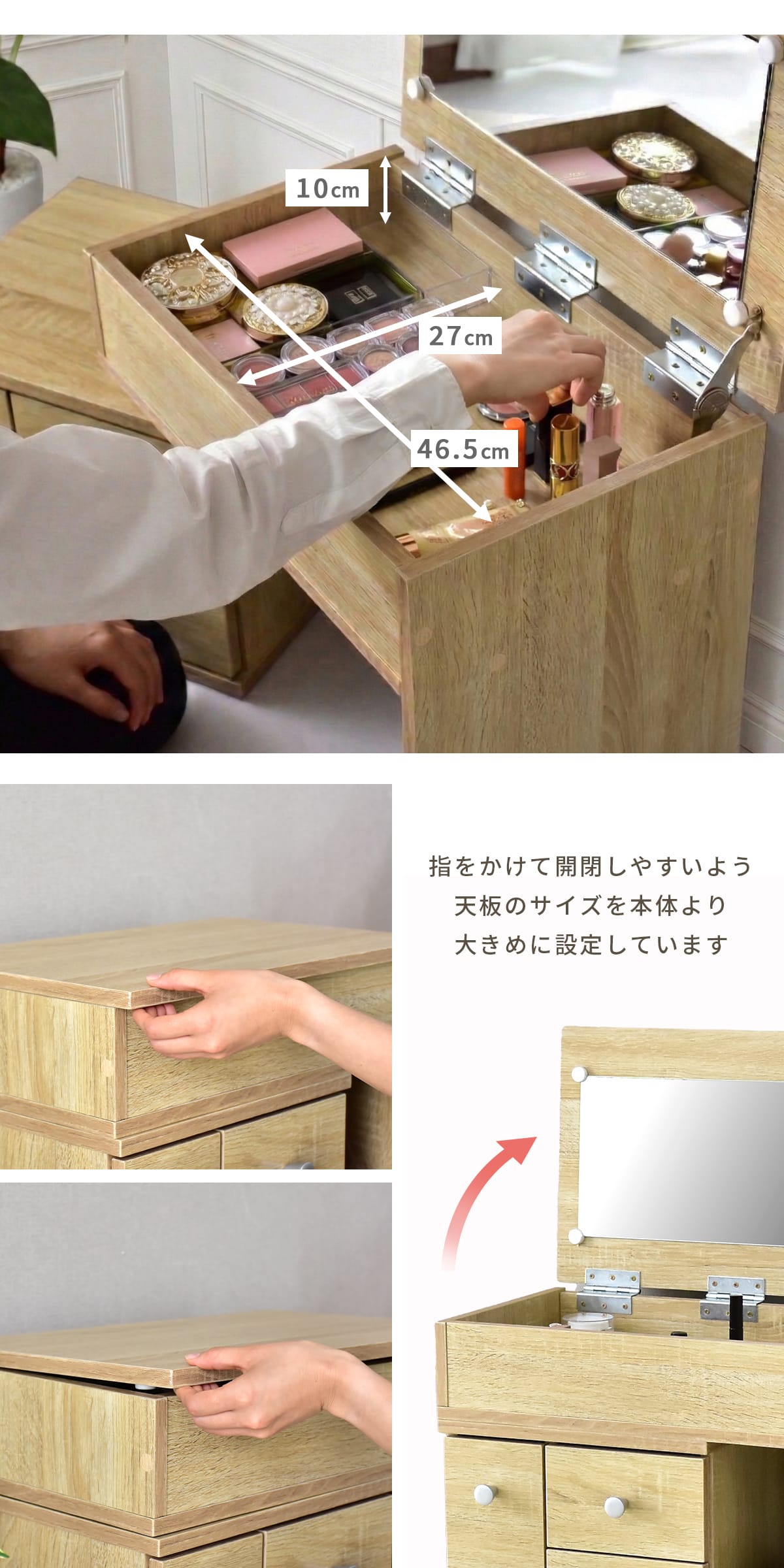 幅約42cmの大きめの一面ミラーで顔全体をしっかり確認でき、メイクやヘアセットも快適。天板下には高さ約10cmまでのコスメを収納できるスペースを確保しました。天板は本体より少し大きめの設計で、開けるときも指を掛けやすく、スムーズに開閉できる使いやすい仕様です。