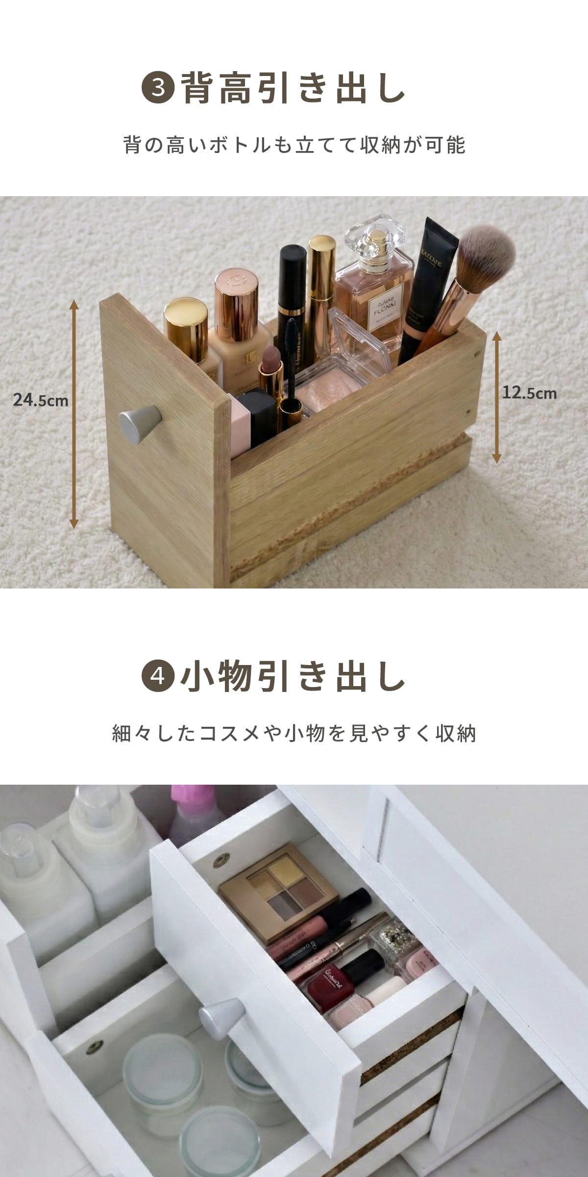 収納は背の高い引き出し1杯と、小物整理に便利な小引き出し2杯を装備。スキンケアボトルやヘアケア用品など高さのあるアイテムもすっきり収納できます。コスメやメイク道具を種類ごとに分けて整理できるので、毎日のメイク準備がスムーズになります。
