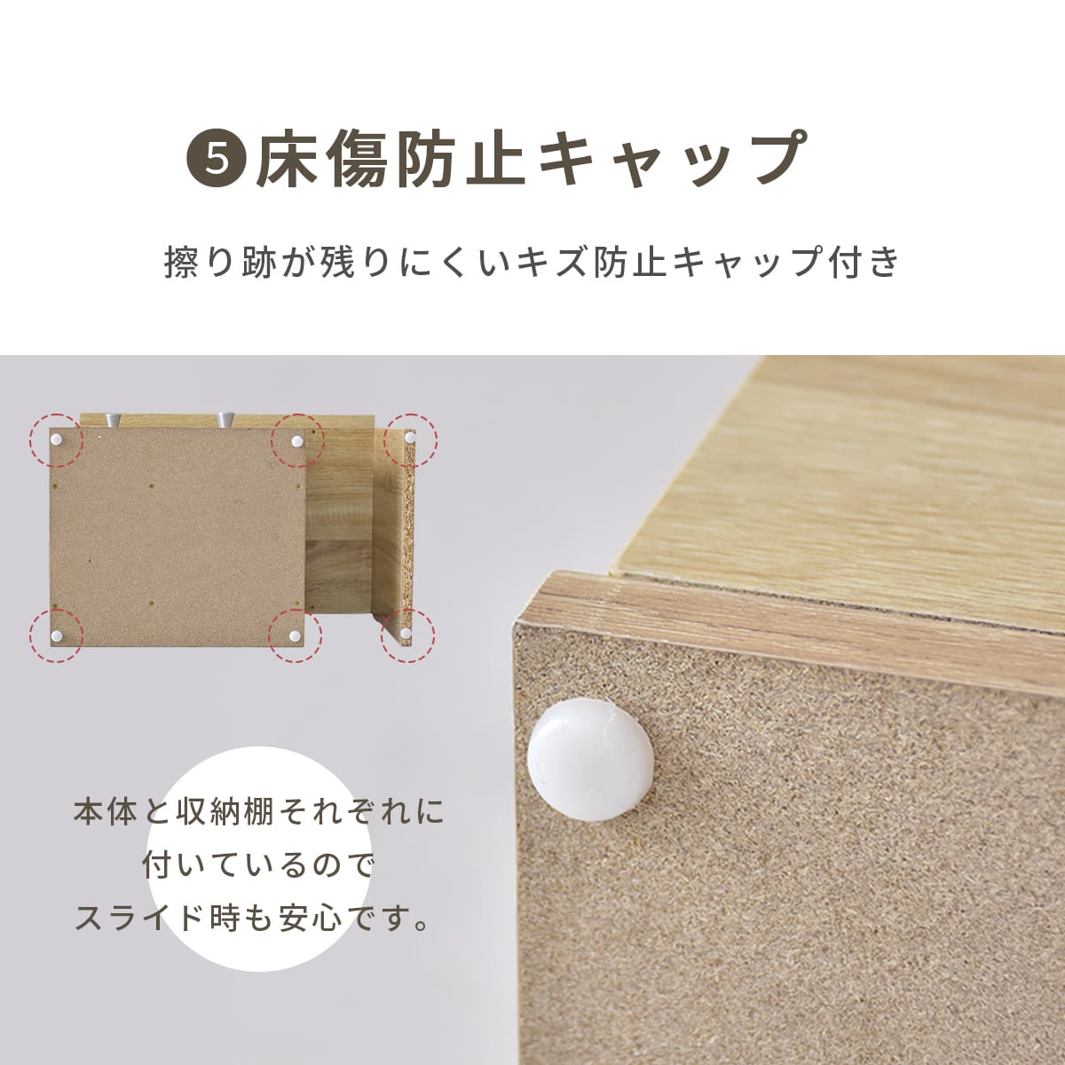 底板には床を傷から守る保護キャップ付き。フローリングでも擦り跡が残りにくく、床へのダメージを軽減します。設置や移動の際も安心して使えるため、賃貸住宅や新築のお部屋でも気軽に取り入れやすい配慮された仕様です。