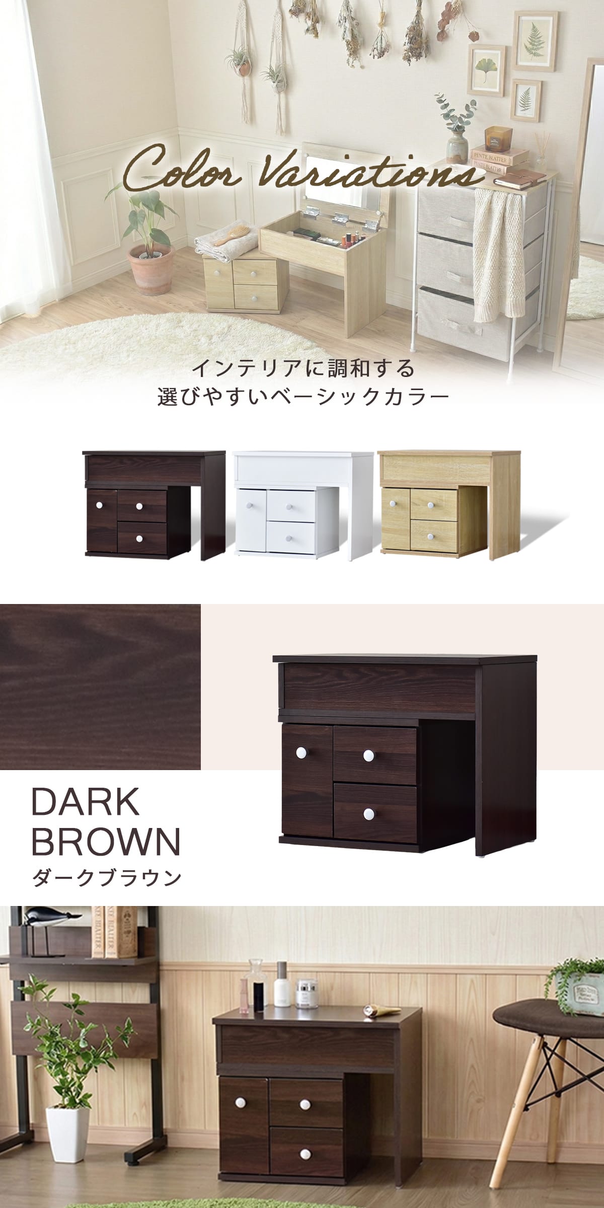 インテリアに合わせて選べる3カラーをご用意。落ち着いた雰囲気のダークブラウン、空間を明るく見せるナチュラル、清潔感のあるすっきりとしたホワイト。さまざまなテイストのお部屋に自然になじみ、お好みの空間づくりを楽しめます。