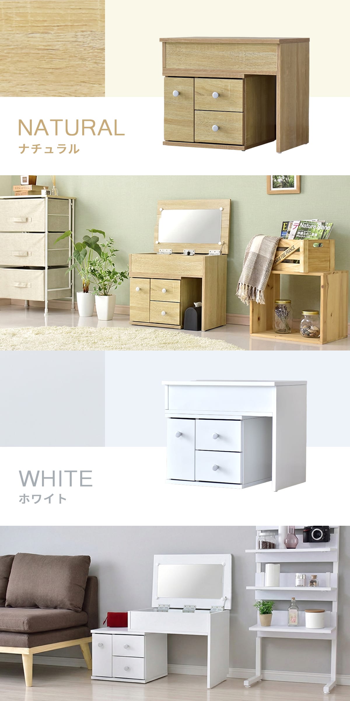 無段階に横幅を伸縮できるドレッサーデスク「ノーラ」。普段は幅約50cmのコンパクトサイズで省スペースに設置でき、使うときはスライドさせて幅約75cmまで拡張可能。メイク道具やコスメをゆったり広げて使え、使い終わったらすっきり片付けられる、機能性と使いやすさを両立したドレッサーです。